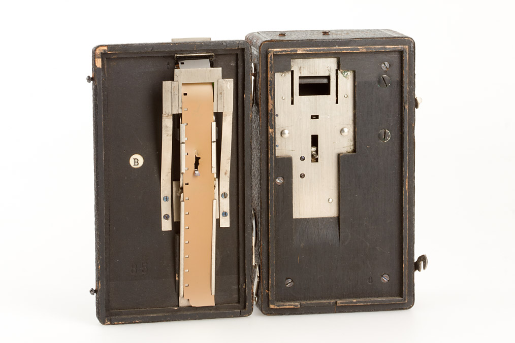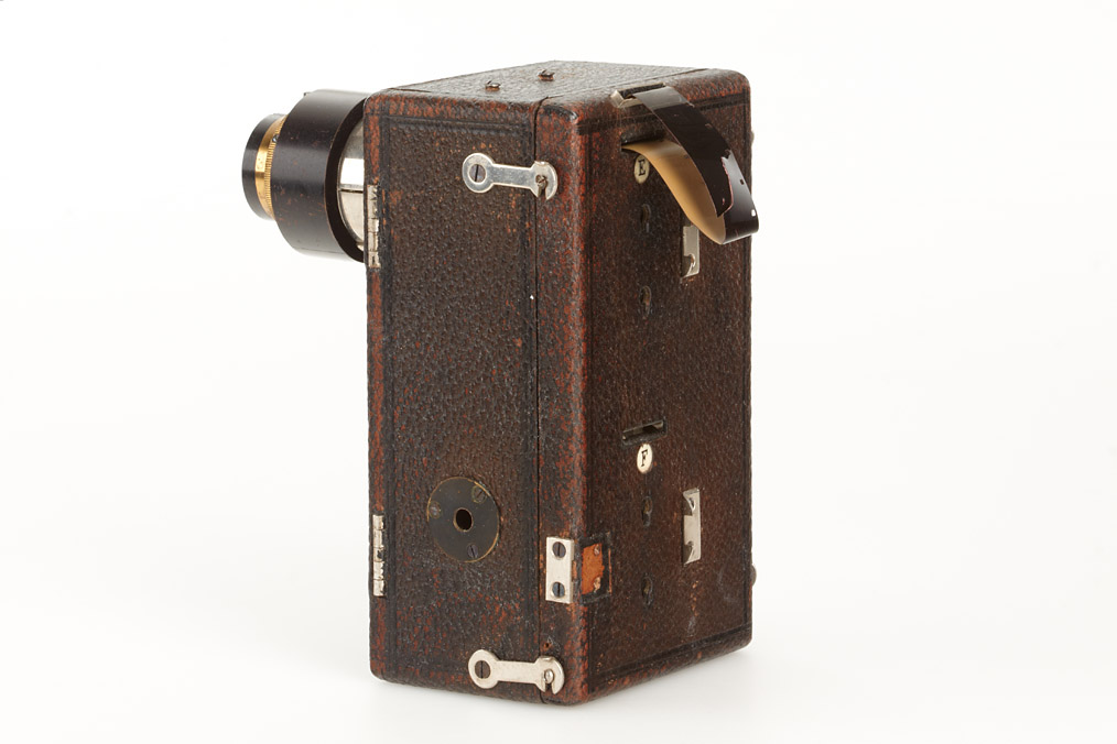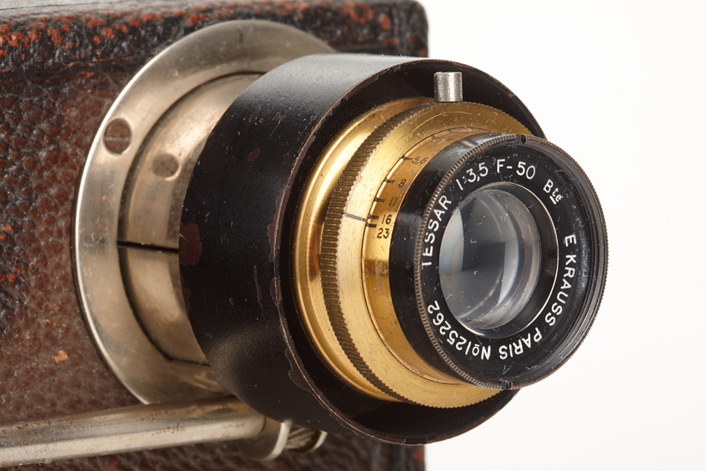 17.5mm, very rare first version, camera/projector, for restauration, the camera has the very early serial number 6 while the back with a film strip still inside carries the number 85, leather covered wood body, Krauss Paris Tessar 3.5/50mm no.125262, rare early version of this amateur cine camera, as early as 1902 Ernemann entered the amateur motion picture market with this quality made camera that used 17.5mm centre perforated film and had a Williamson type film transport mechanism
