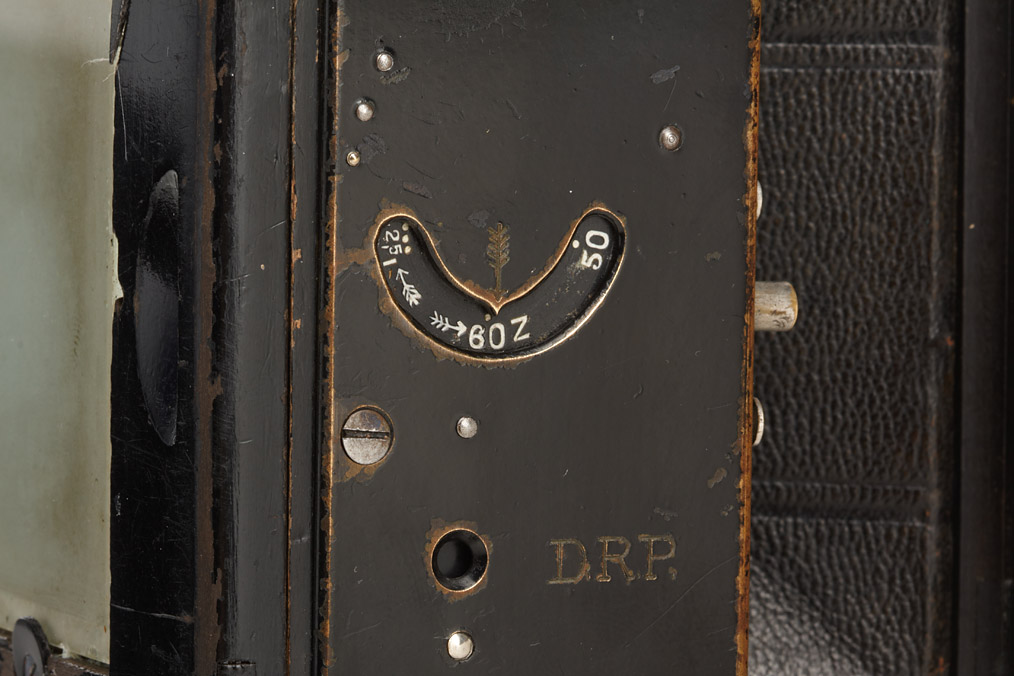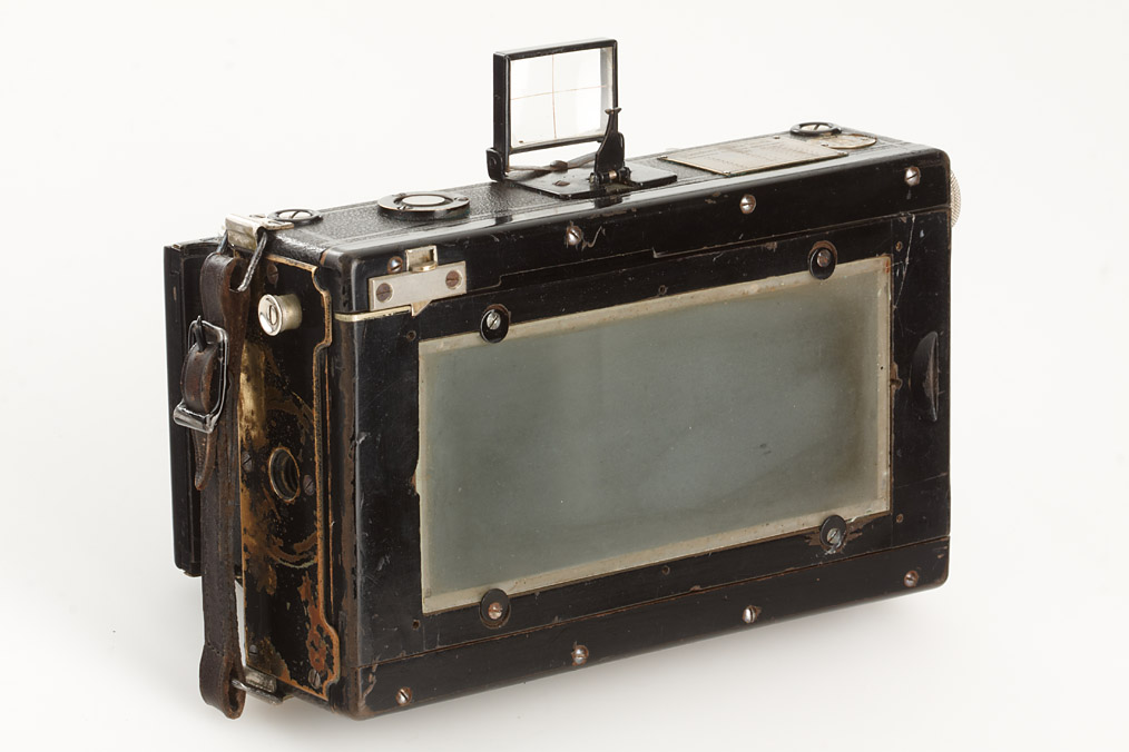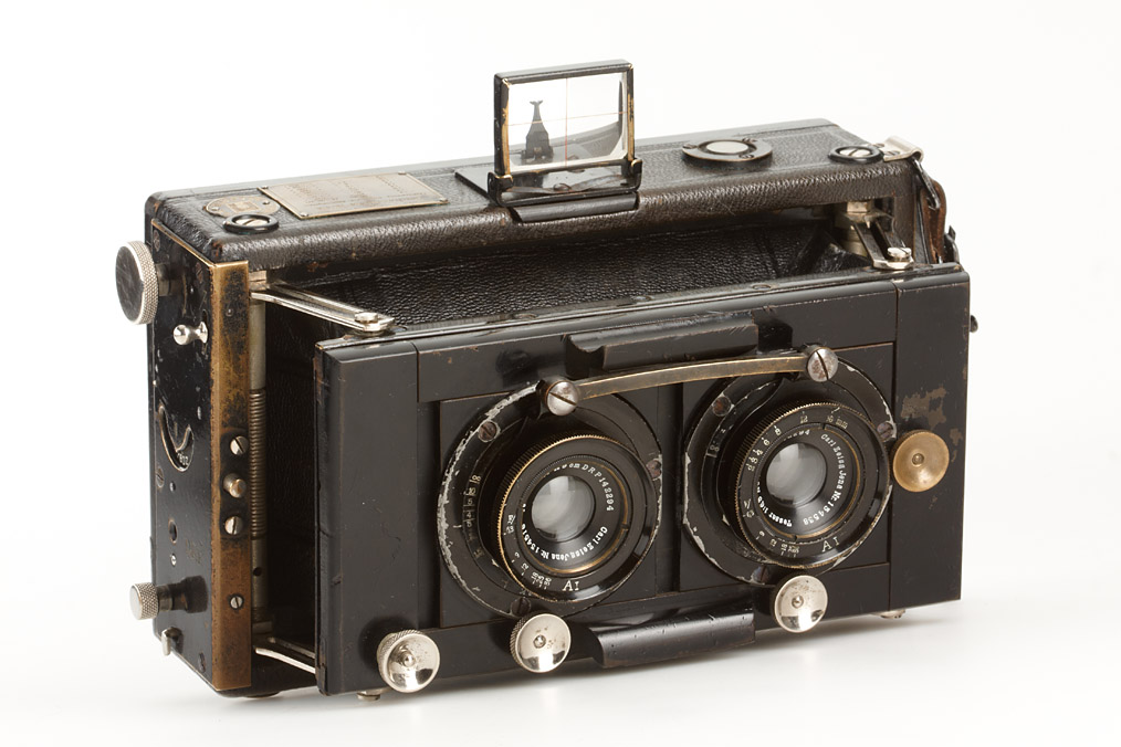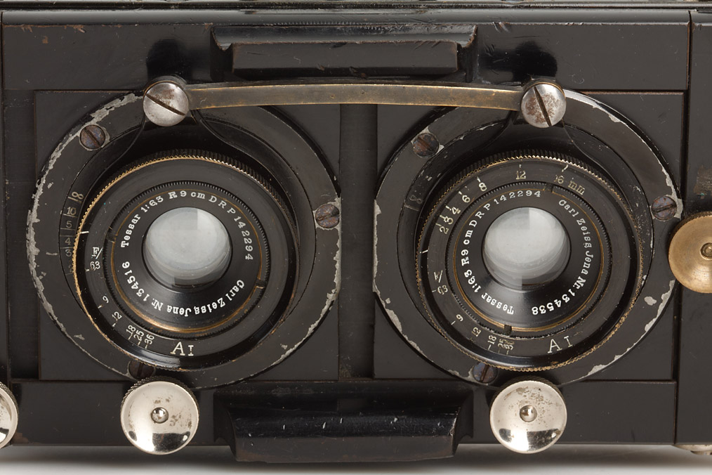 6x13cm, stereo camera with leather covered wood body, black leather bellows, focal-plane shutter (not working), a pair of Tessar 6.3/9cm lenses nos.134516/38, caps, focusing screen adapter, spare focusing screen adapter, filmpack holder, two orange screw-in filters, three double platefilm holders, three single platefilm holders in Ernemann case, Effwee Expometer with maker's box, case