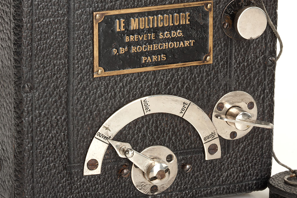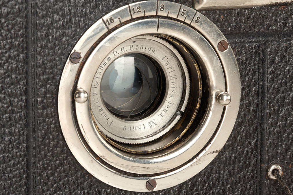 9x12cm, for 12 plates (5 included) or 24 sheet films, leather covered wooden falling plate camera with reflex finder and newton finder, shiftable color filter disc (could also be used as a colour separation camera by moving the internal colour filter disc), with Carl Zeiss Jena Protar 9/150mm no.48669, original cap with strap, LE MULTICOLORE Brevete S.G.D.G. 9, Bd Rochechuoart Paris written on front plaque - the camera was manufactured by Ernemann for Rochechouart