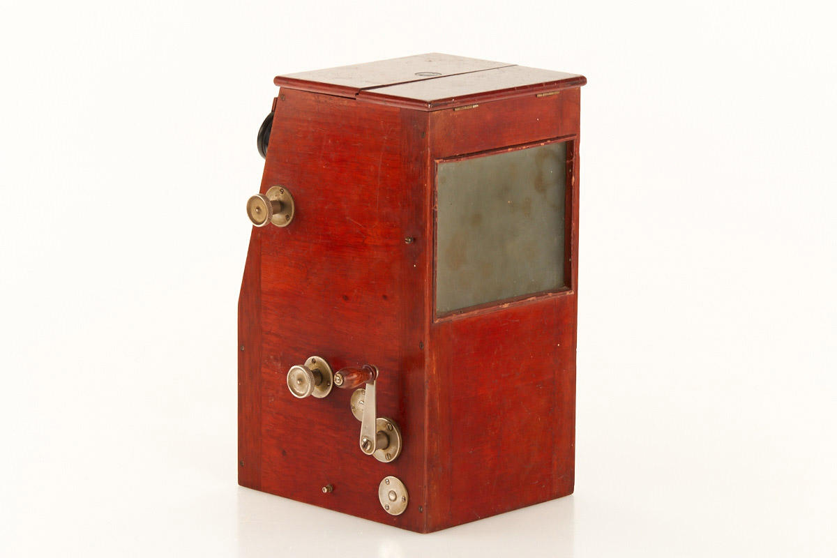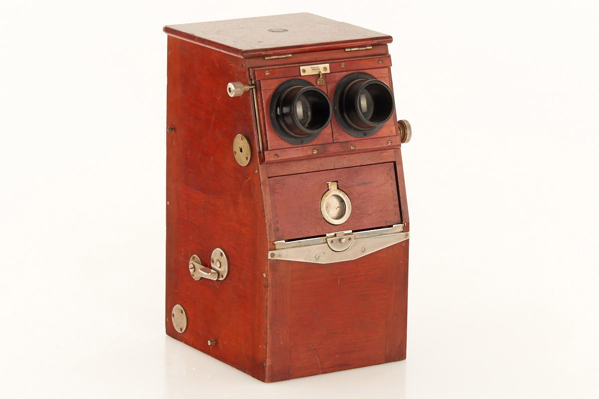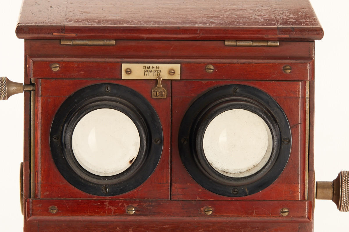 rare Ernemann table top Stereoscope for 45x107mm glass stereo views, with a rack and pinion focusing mechanism, inter-ocular adjustment and internal bellows behind the lens panel.