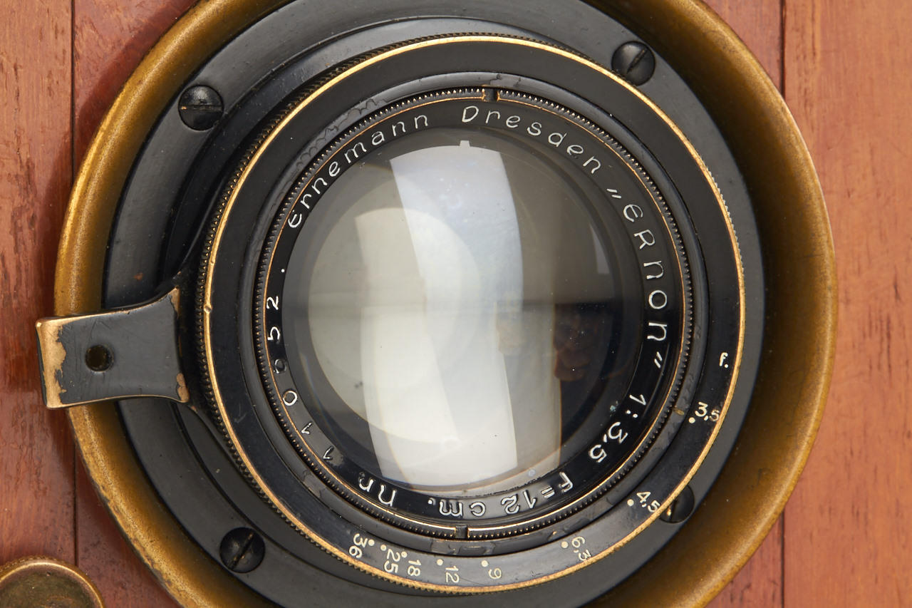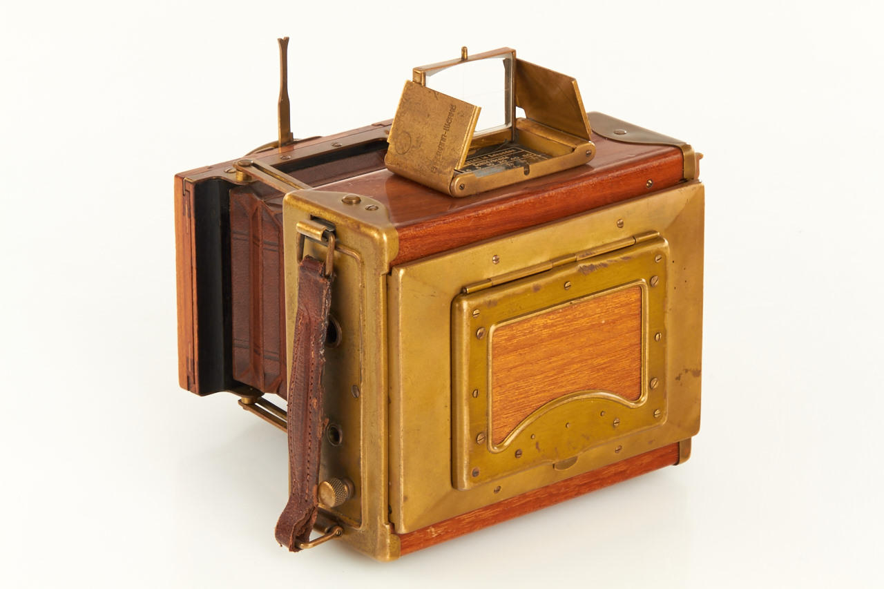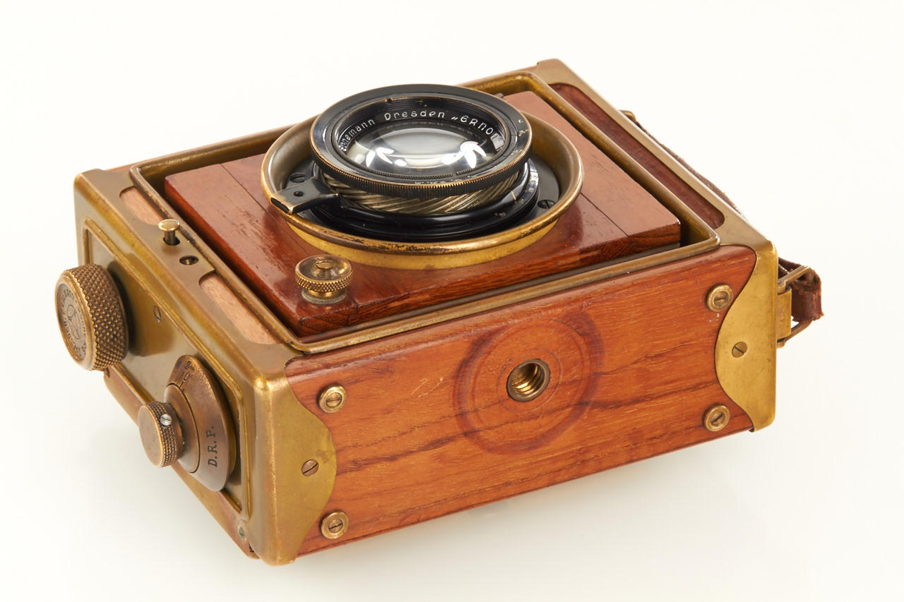 beautiful and rare Tropen Klapp 6.5x9 cm (later style), polished teak body with lacquered brass trim, original brown bellows and brown leather viewing hood in very good condition, some shutter speeds not operable, clean Ernon 3.5/12cm no.110652
