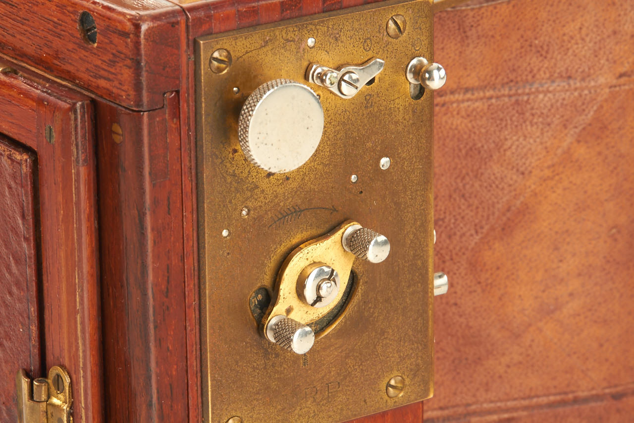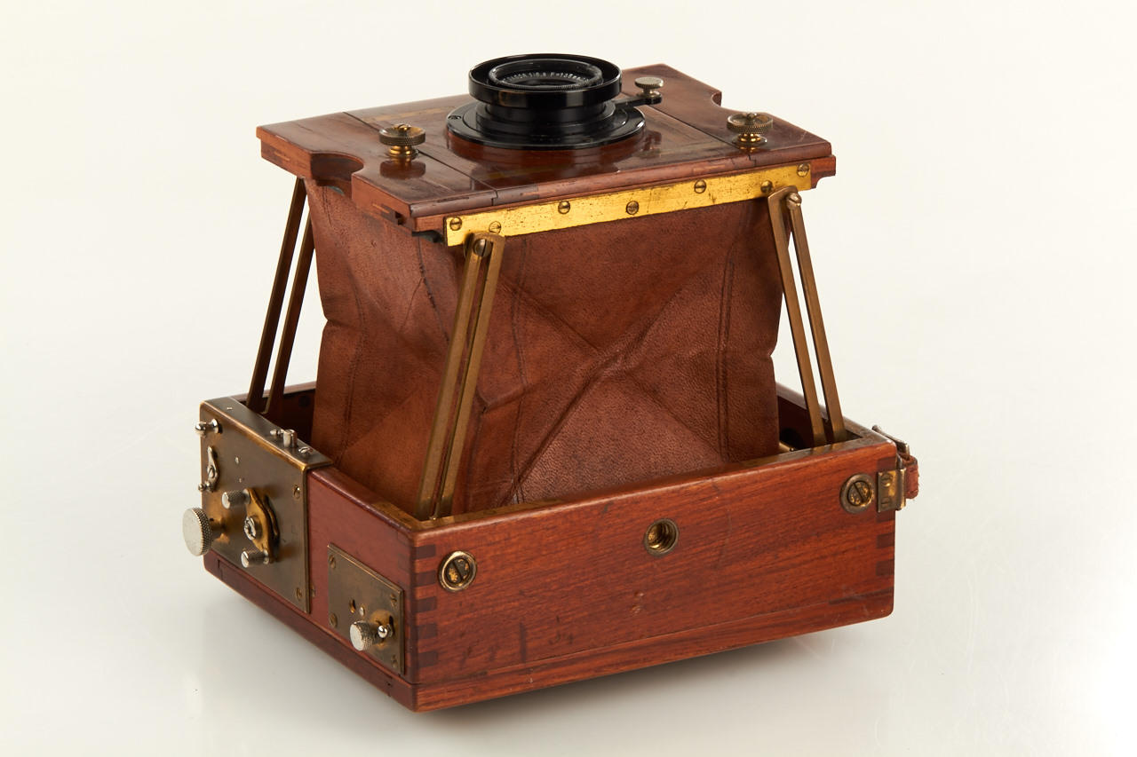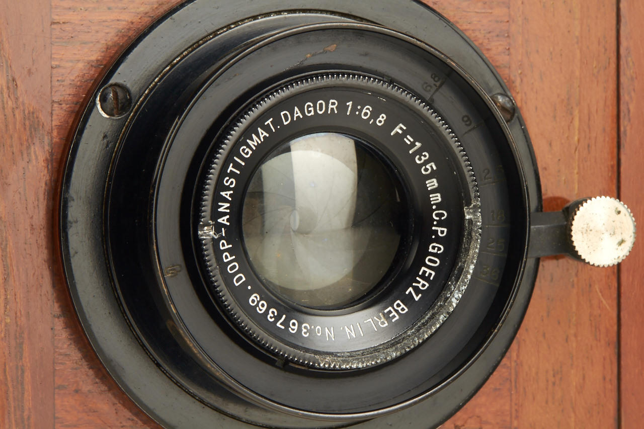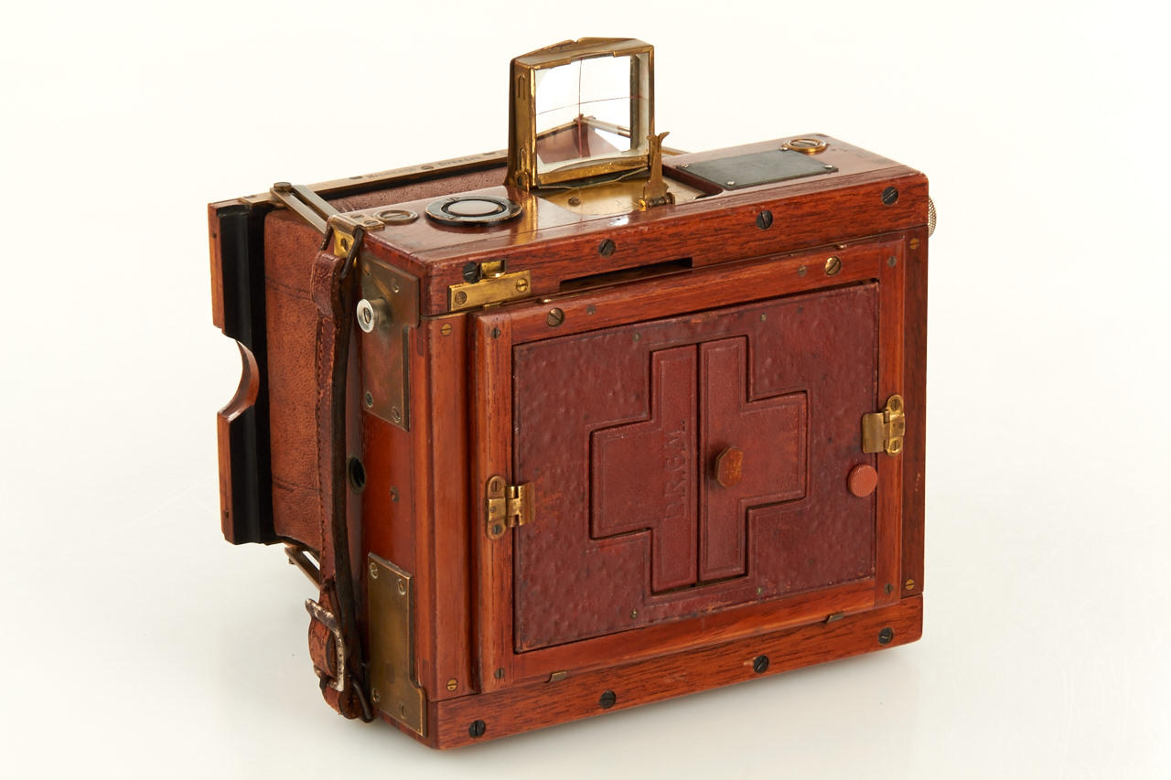 strut-folding tropical camera in very good cosmetic condition, with Goerz Dagor 6.8/135m no.367369 (shutter not operable), original Ernemann viewing hood with cross
