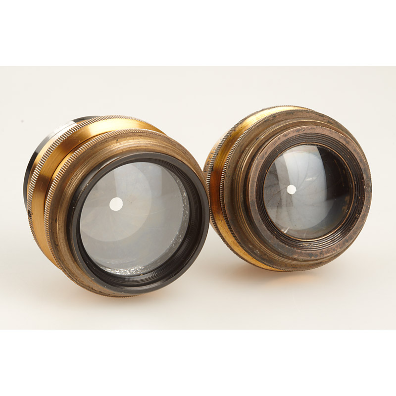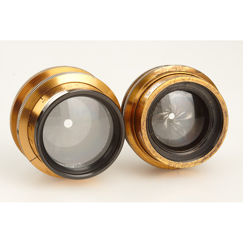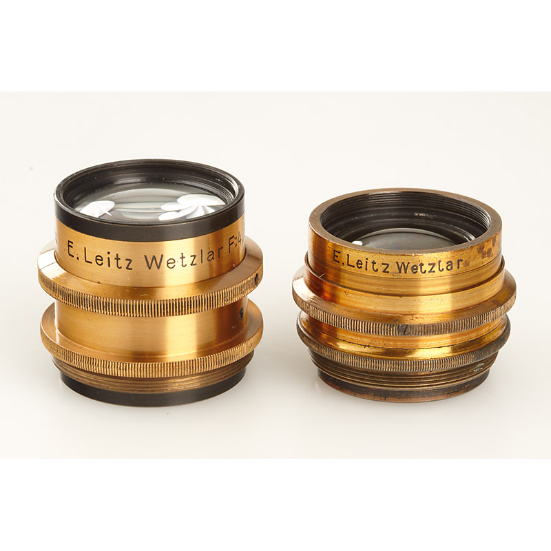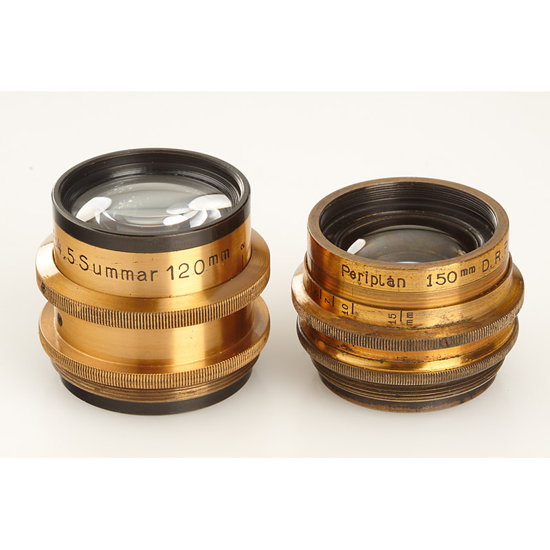 set of five lenses in good condition (1) 64mm Leitz brass lens with iris diaphragm, (2) brass Summar 4.5/80mm with iris diaphragm, (3) brass Summar 4.5/120mm with iris diaphragm (illustrated in Paul-Henry van Hasbroeck 'A History illustrating every Model and Accessory' p.21), (4) black painted brass Summar 4.5/12cm with iris diaphragm, coated lenses, (5) brass Periplan 150mm with iris diaphragm - ex collection Paul-Henry van Hasbroeck (5)