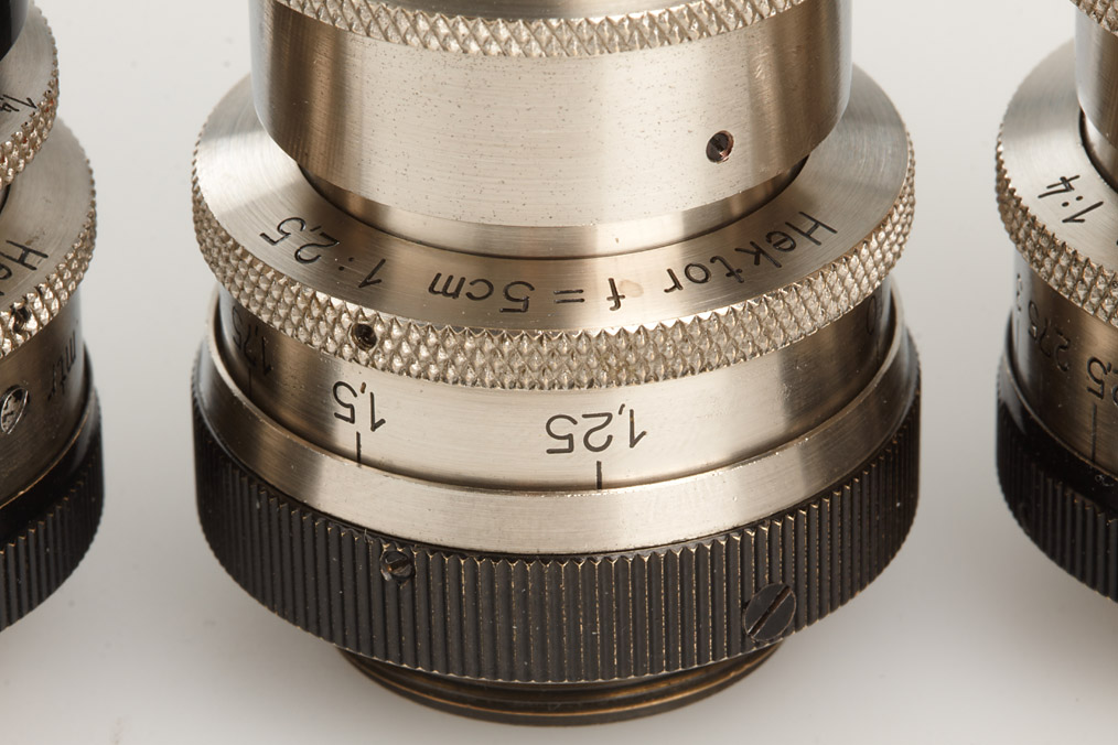 set of three original and very rare cine lenses in black/nickel finish, all in C-mount: (1) Hektor Rapid 1.4/2.5cm no.220027, (2) Hektor 2.5/5cm no.111827, (3) Tele-Anastigmat 4/7.5cm no.163021, all lenses in beautiful condition with matching black painted hood (3)