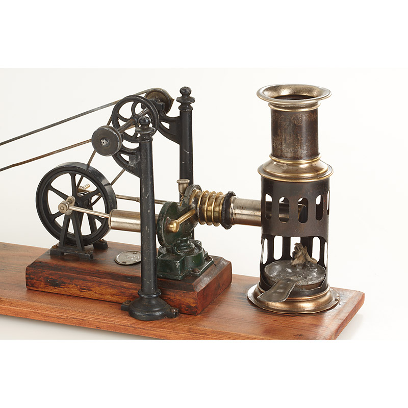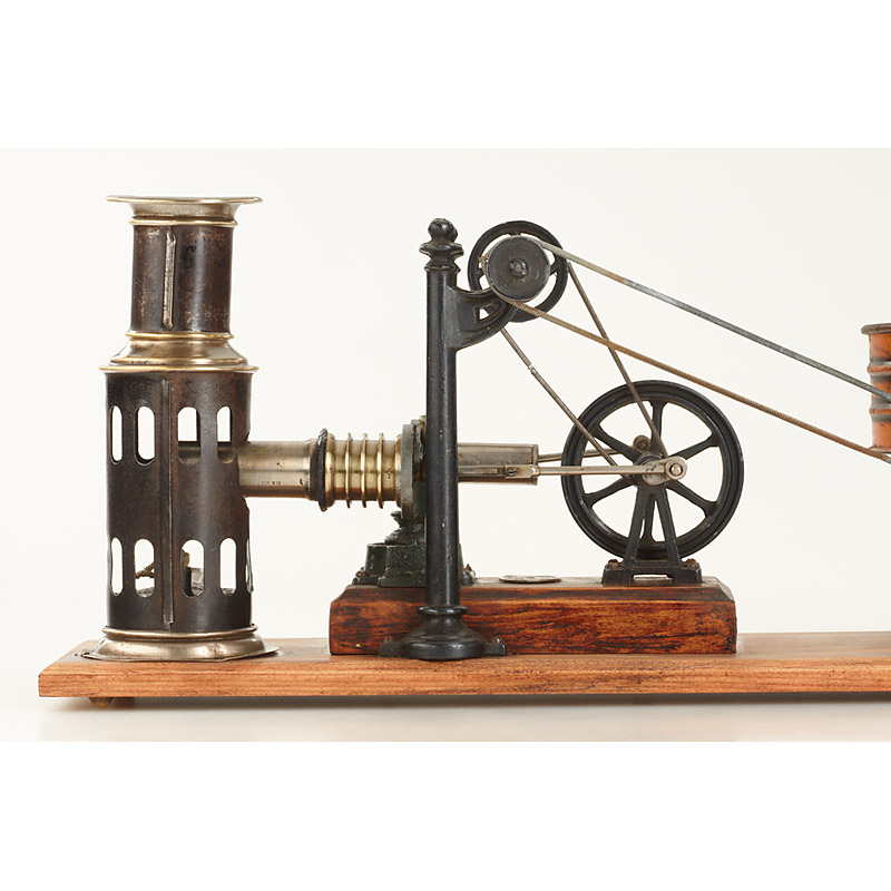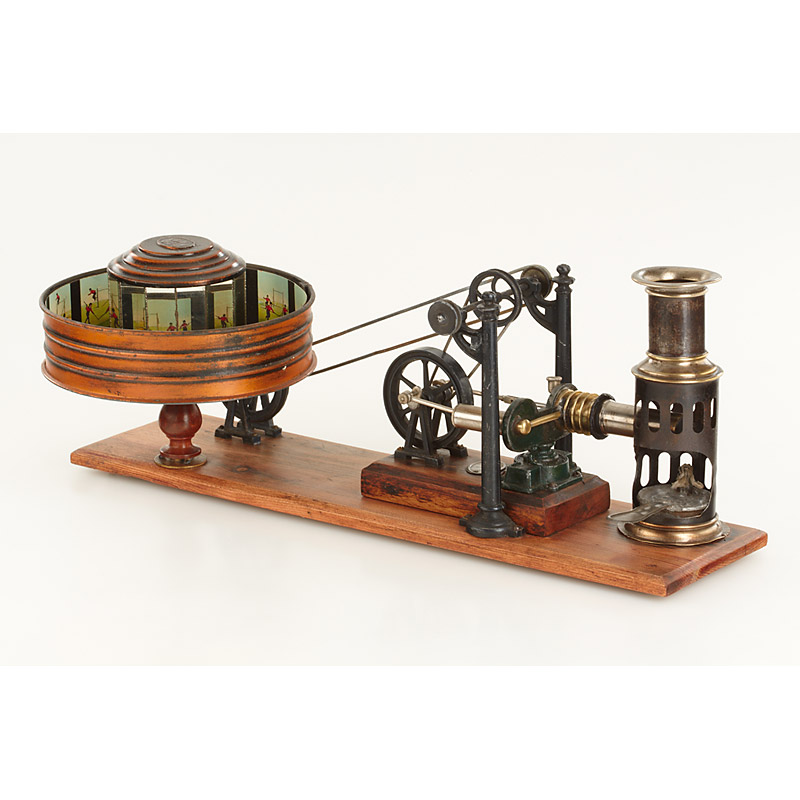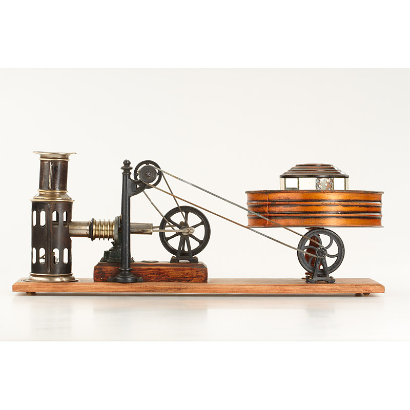 tin steam engine connected to a metal Praxinoscope with 16cm diameter mirrored drum, mounted on orig. wood base, together with nine printed picture strips, extremely rare child's optical toy, few examples known, see Fusslin 'Optisches Spielzeug' page 98