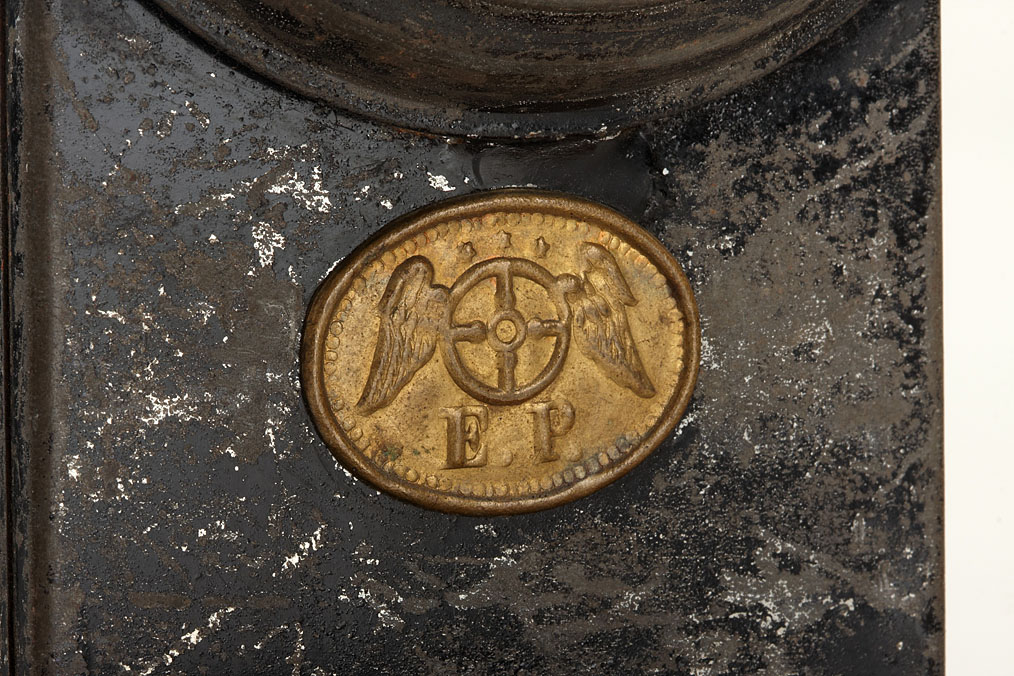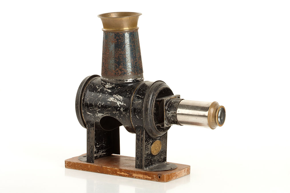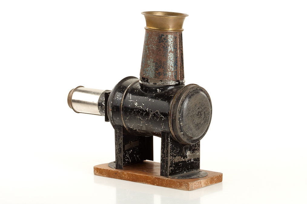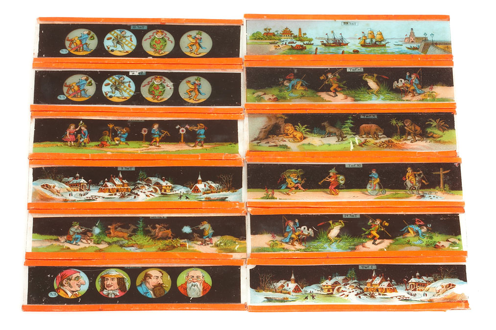 boxed barrel-shaped lantern with black lacquer finish mounted on a wooden baseboard, with the original lens and chimney, the fitted box covered with yellow-black Marbled paper, nice label depicting a boy Magic lantern show, instructions on the inside, a set of slides. The lantern shows some wear but still a nice and complete set