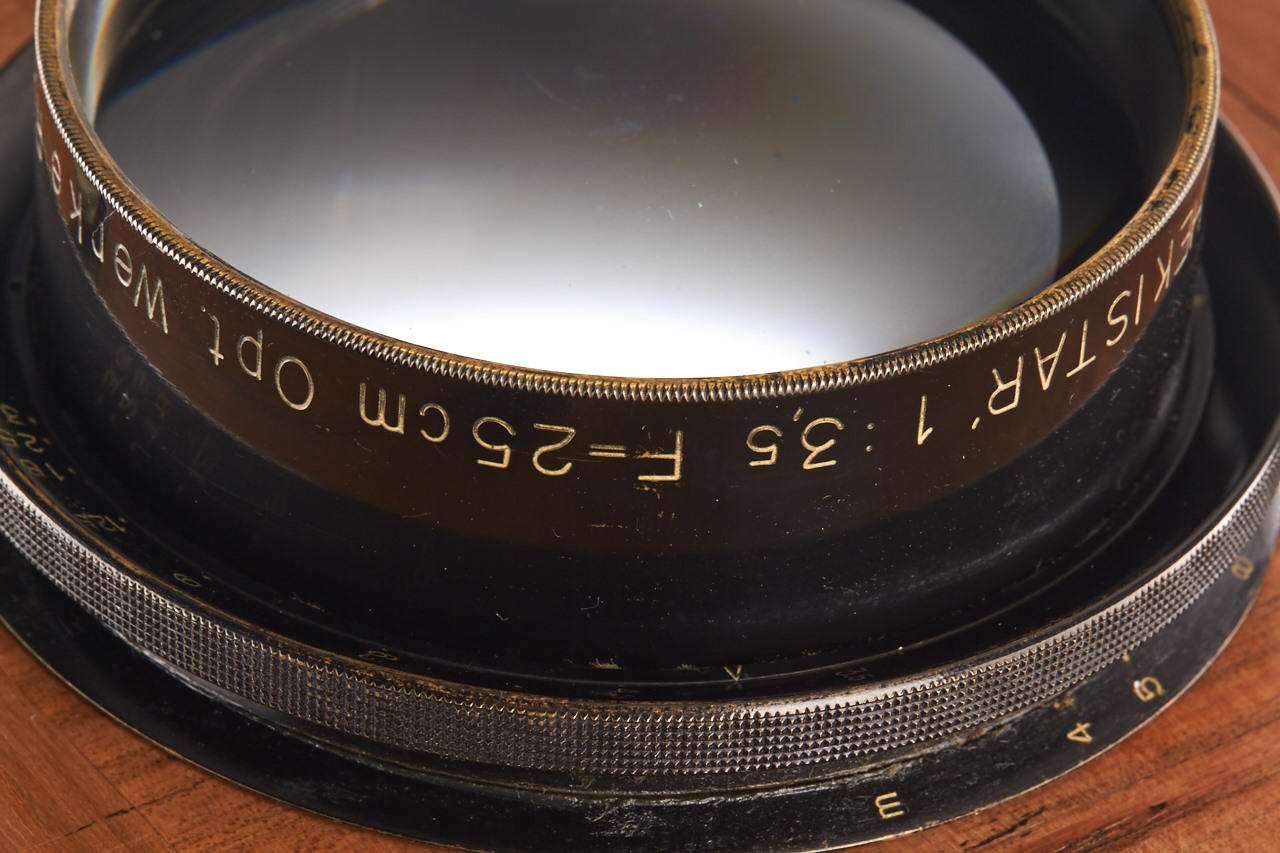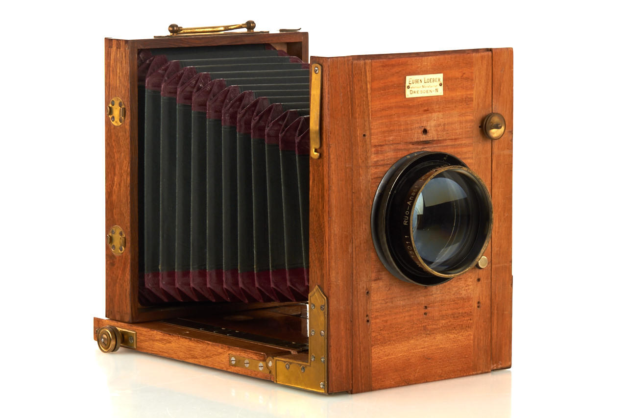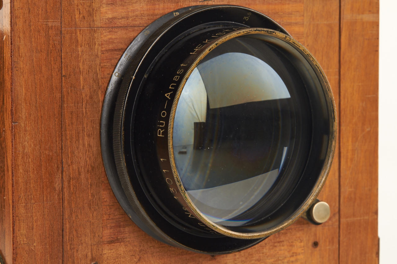 13x18cm, folding camera from hardwood, green leather bellows, focussing screen, 4 wooden film holder, with rare and fast Rüo-Anast. HEKISTAR 3.5/25cm no. 13011 (very clean lenses), cap