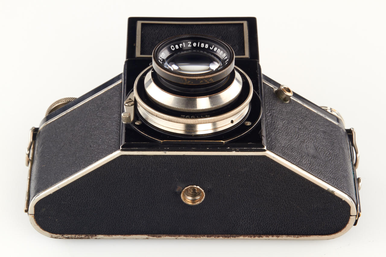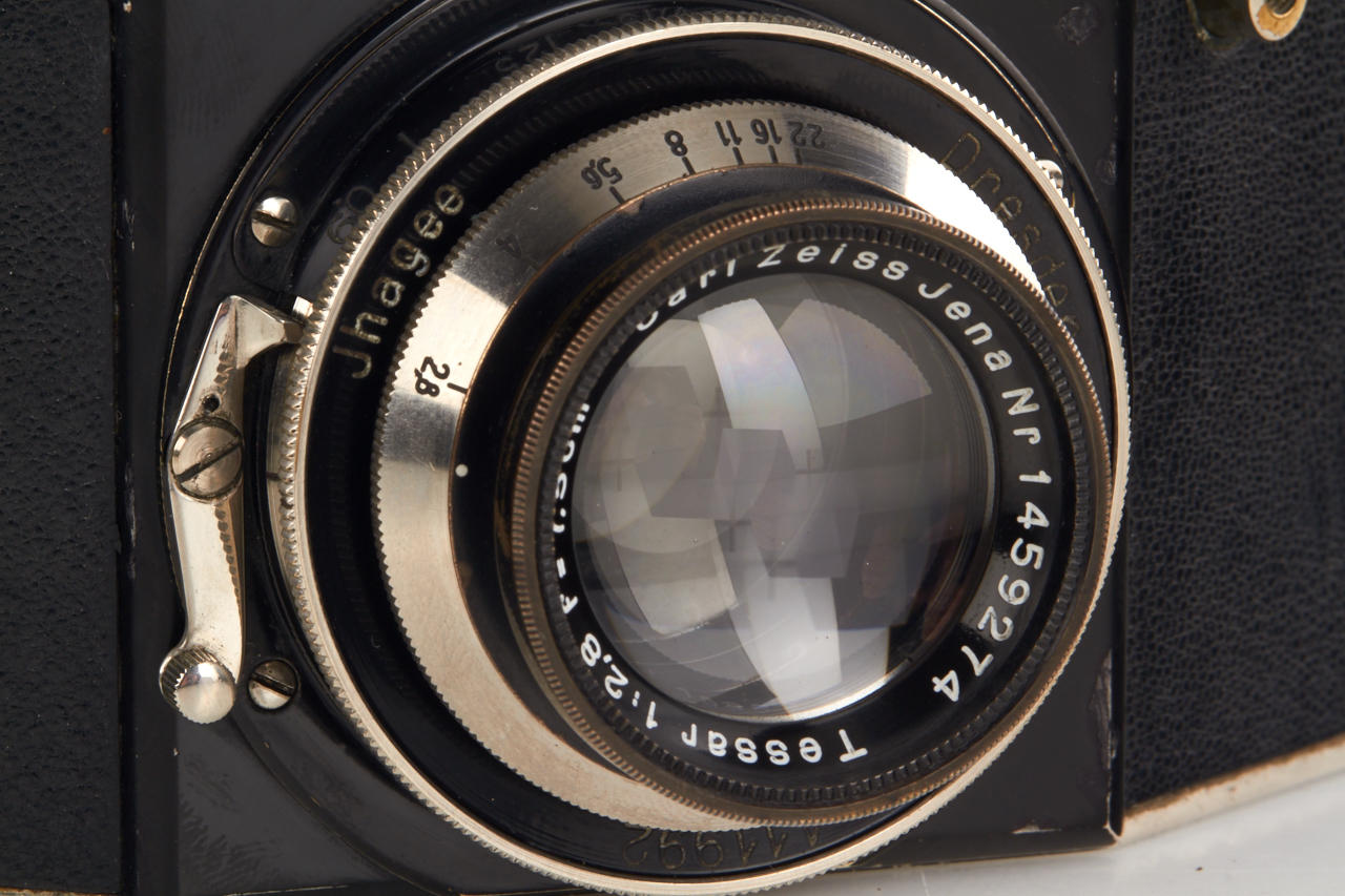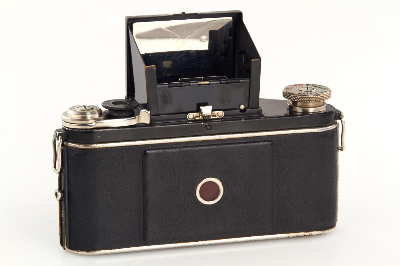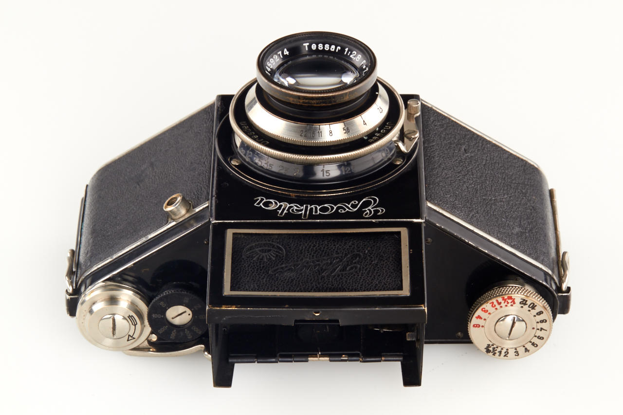 body with locking lever for the helix on the right side, no flash synchronisation, in beautiful original condition (shutter working, but curtains need replacement), with matching black/nickel Tessar 2.8/7.5cm no.1459274