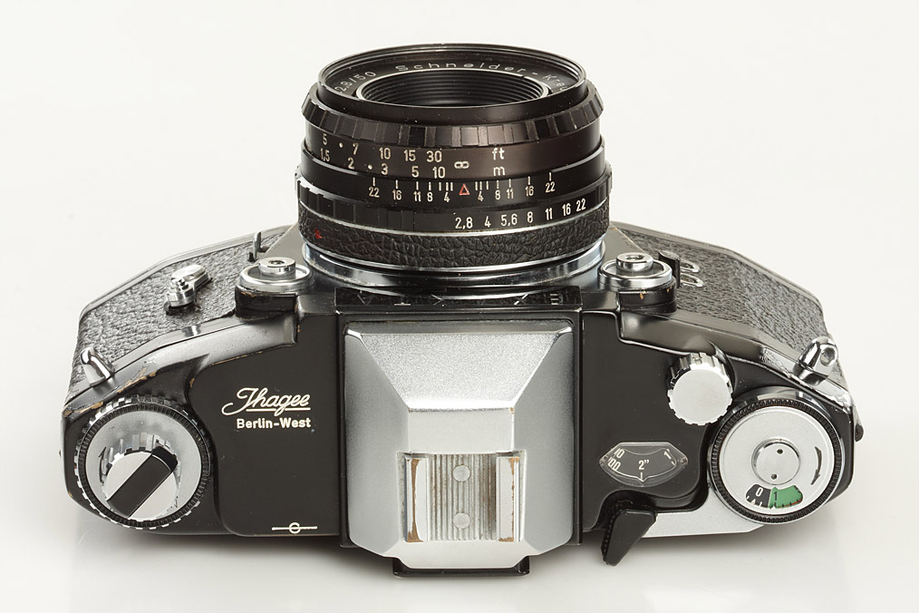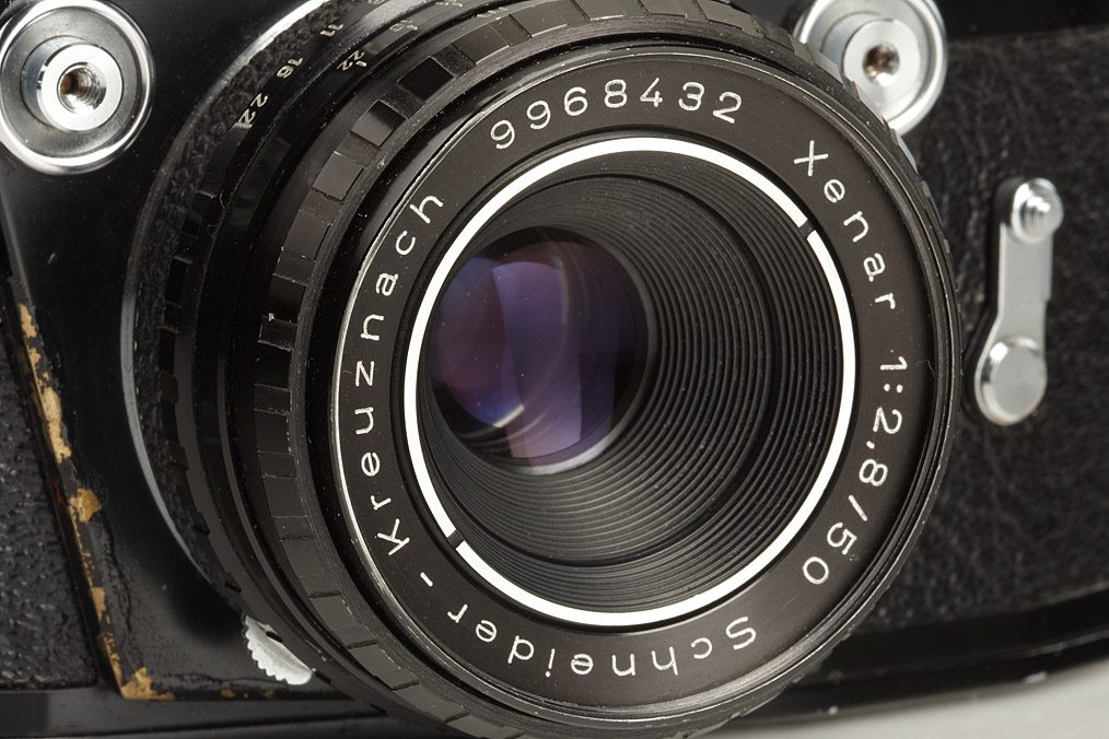 extremely rare black paint Exakta Real in working order with black Xenar 2.8/50mm no.9968432 (cap), prism finder, waist-level finder, Curtagon 4/28mm no.9972307 (caps, maker's box), Travenar 3.5/135mm no.314336 (cap, maker's box), instructions