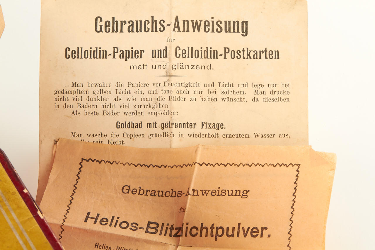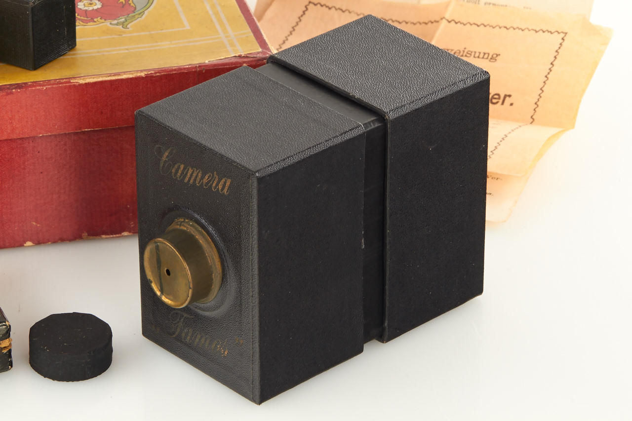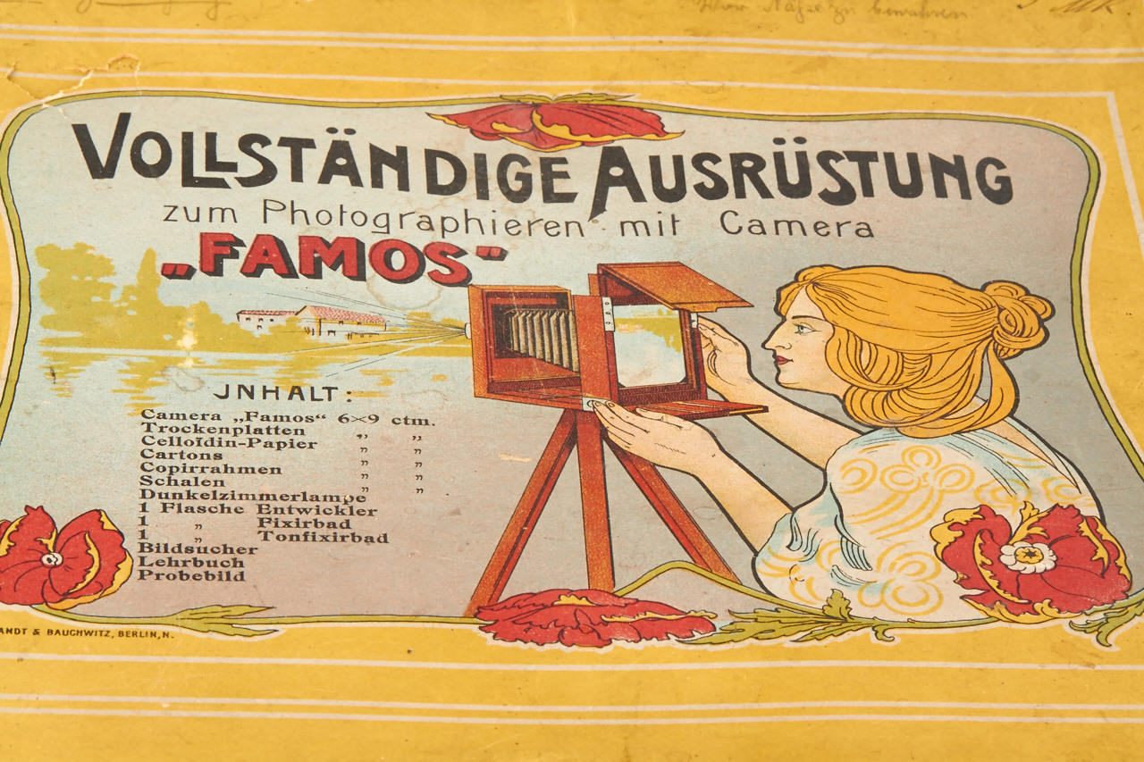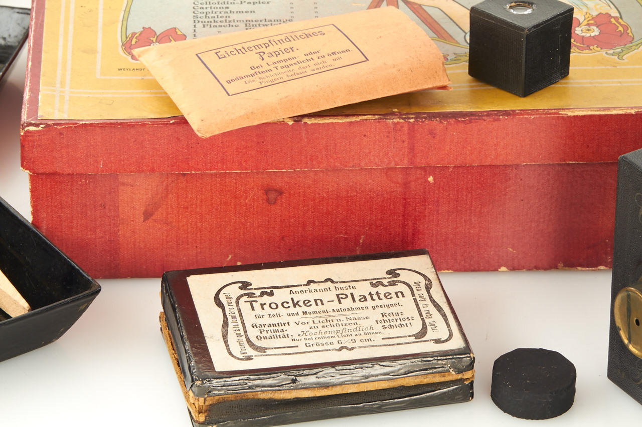rare complete 6x9cm camera outfit - a ready to use set with camera and plate developing kit, with glass plates, copying frame, darkroom lamp (glass missing), developing trays etc., everything in attractive maker's box