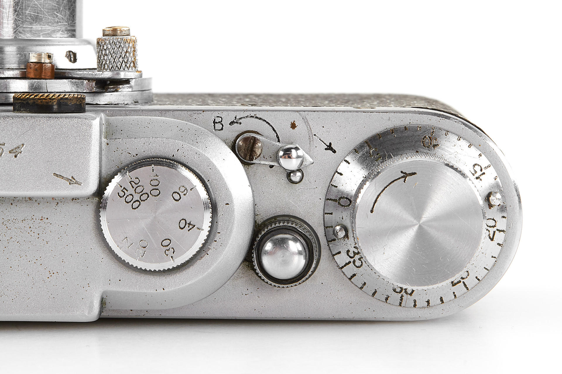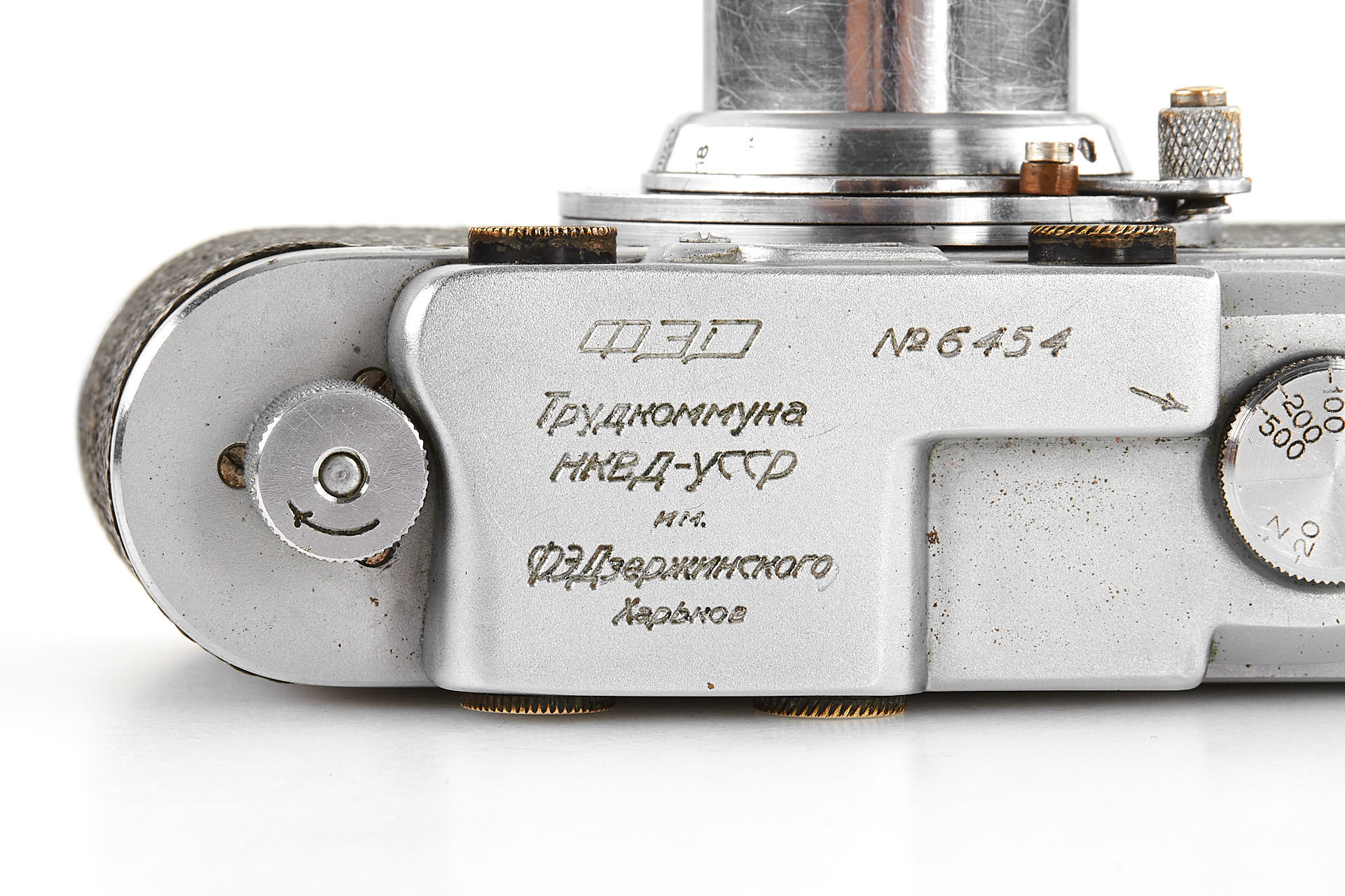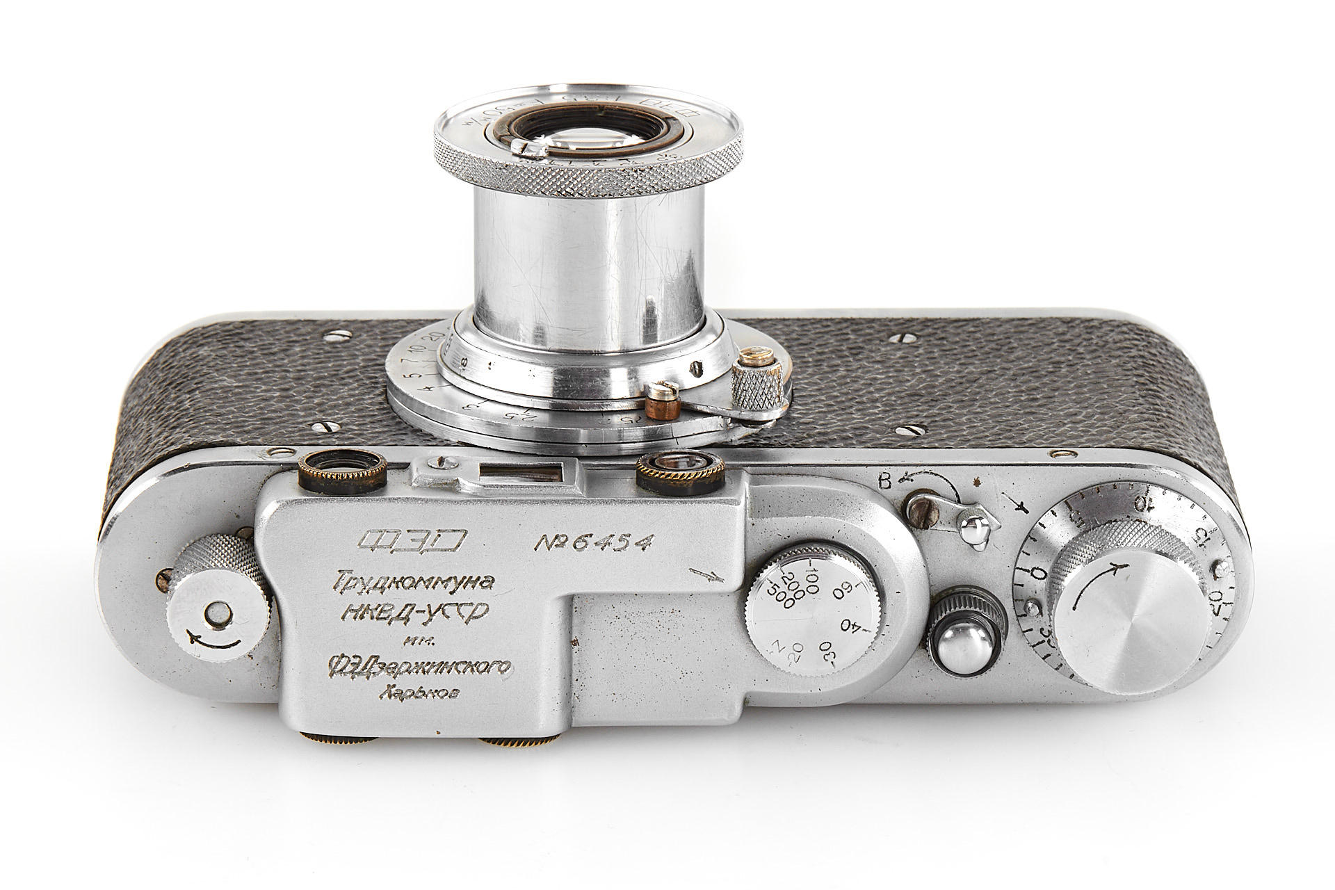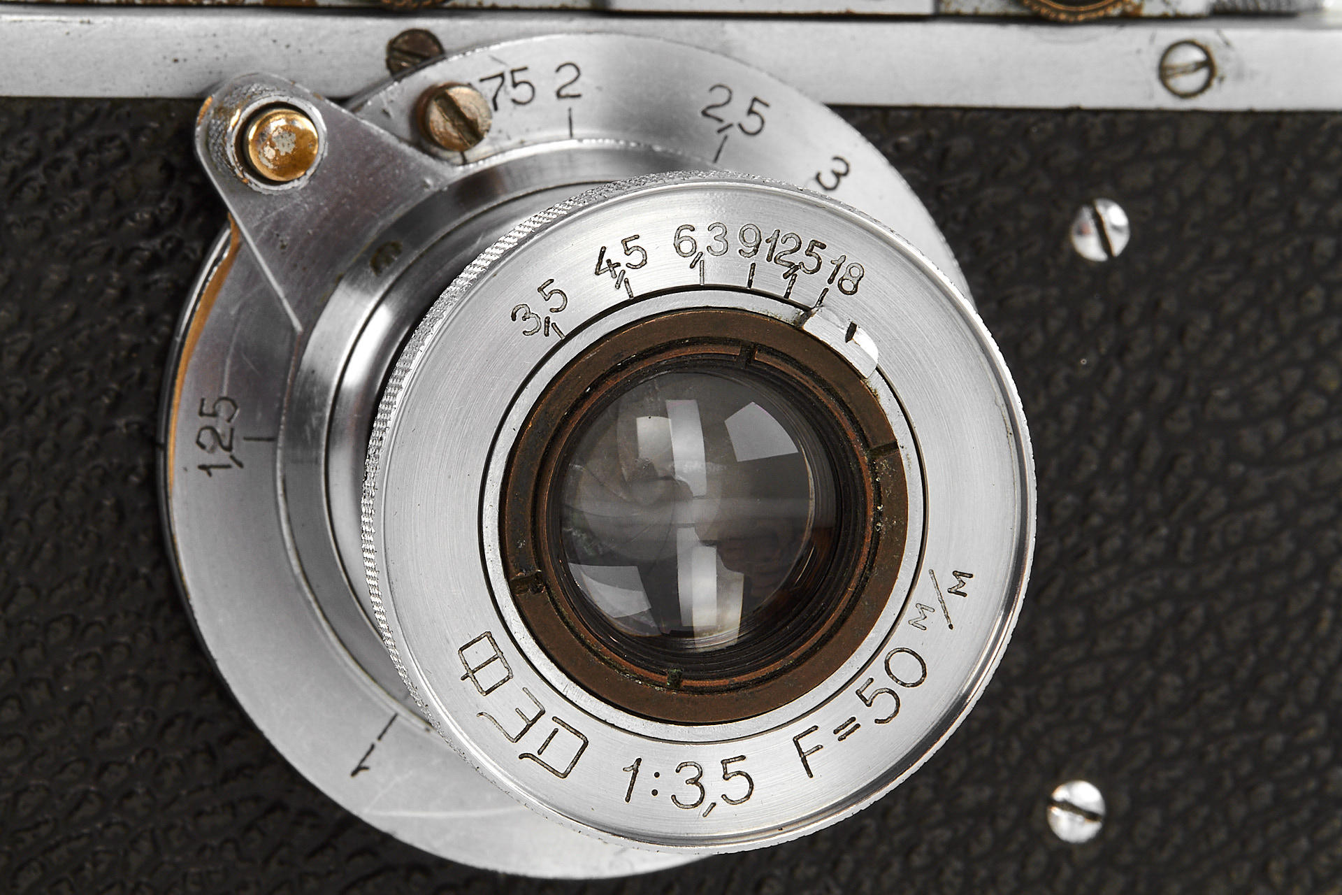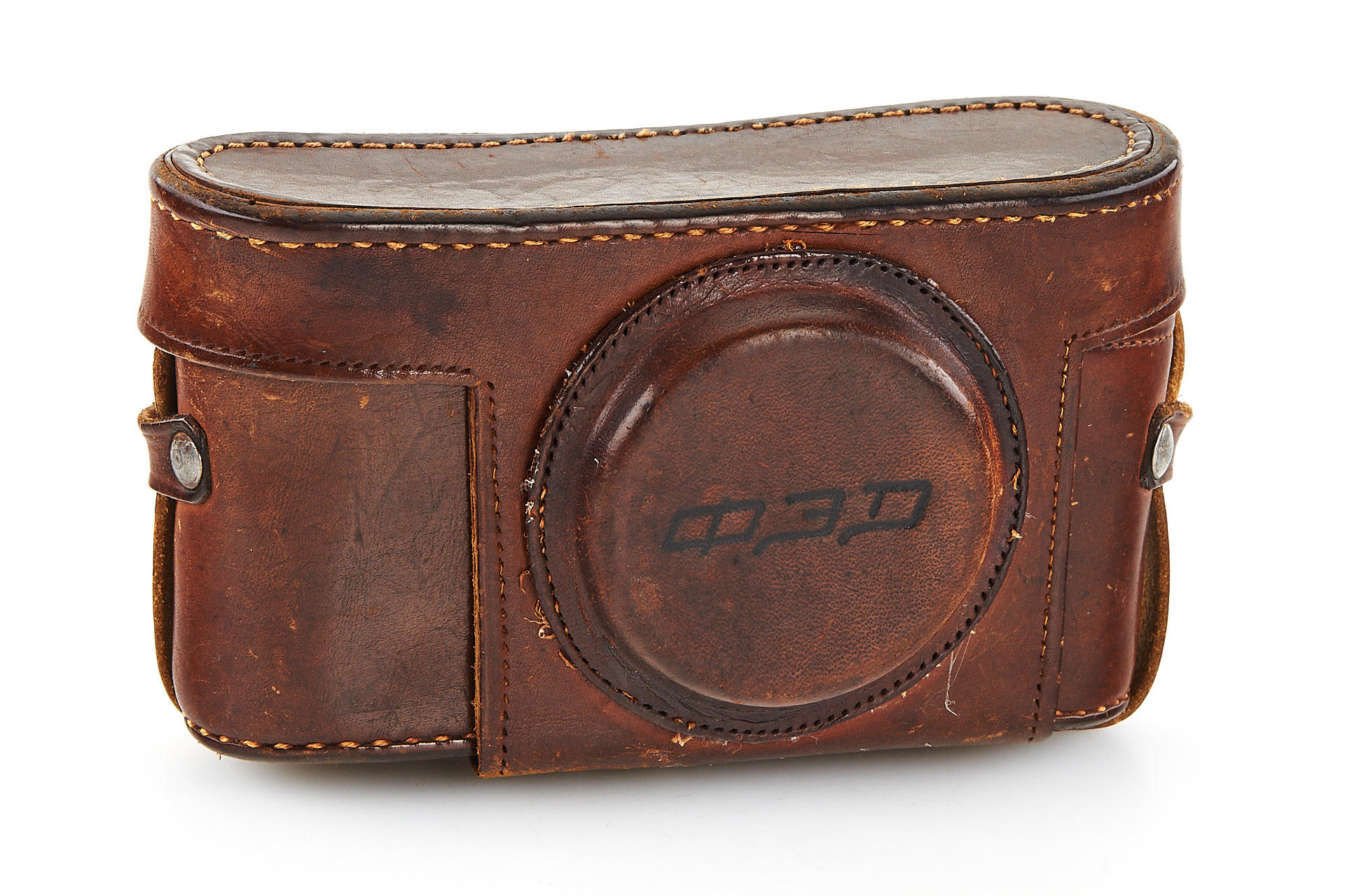 early and rare Fed in satin chrome finish, without a flash shoe, in very good condition, original green shutter curtain (not lightproof), special leather covering, with matching Fed 3.5/50mm (stamped on the mounting flange with the number 6399), matching early leather case (worn)