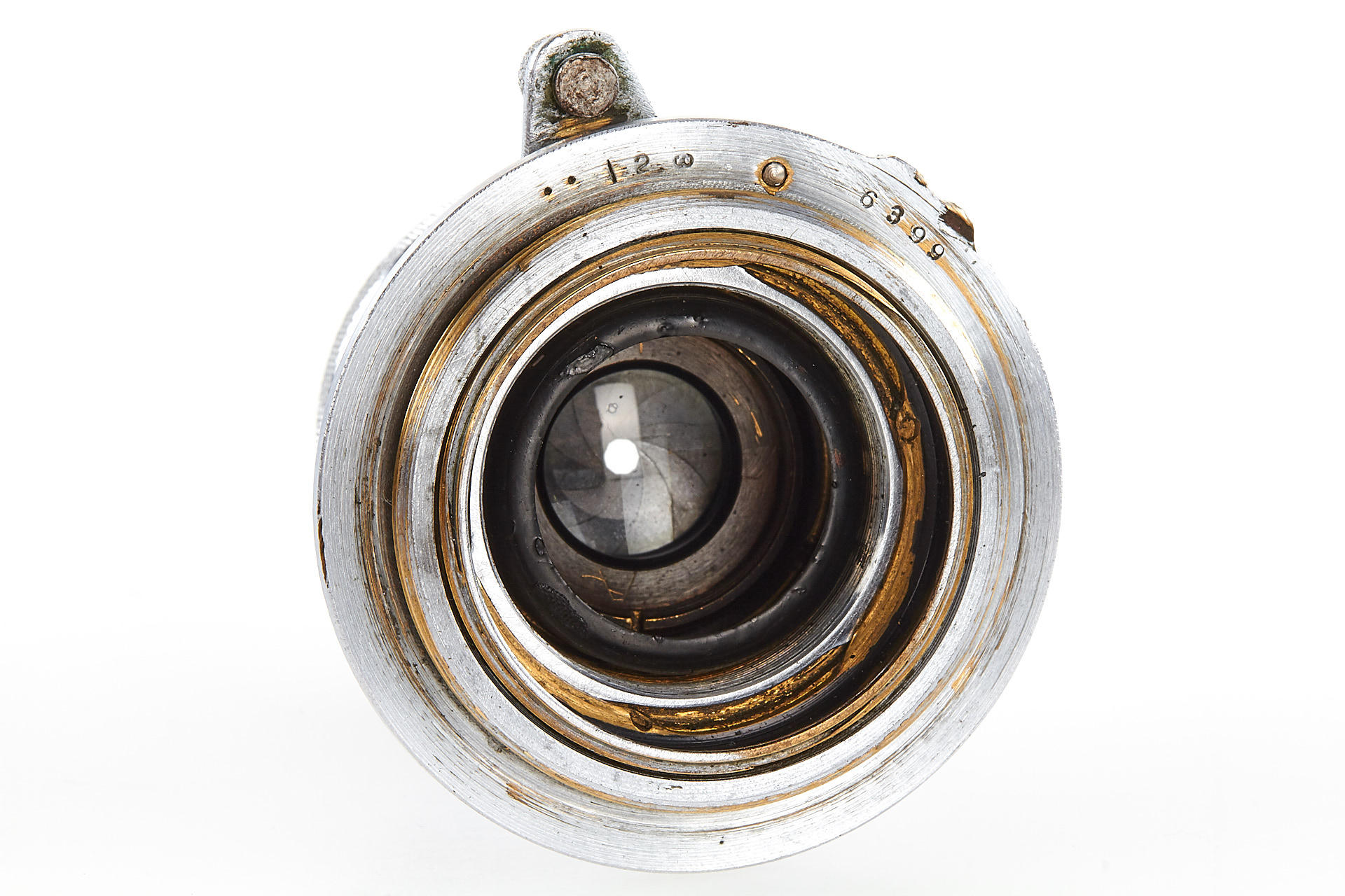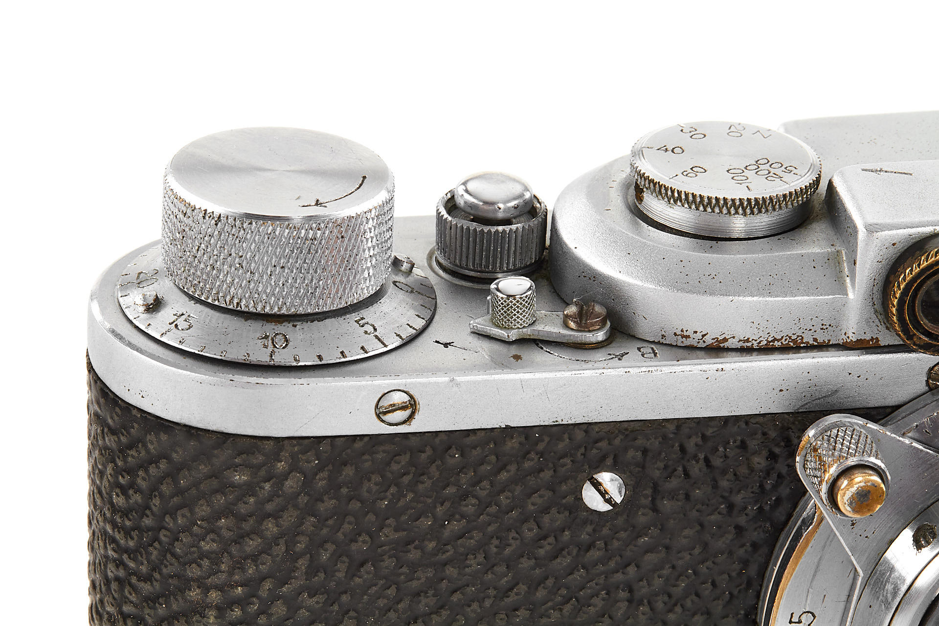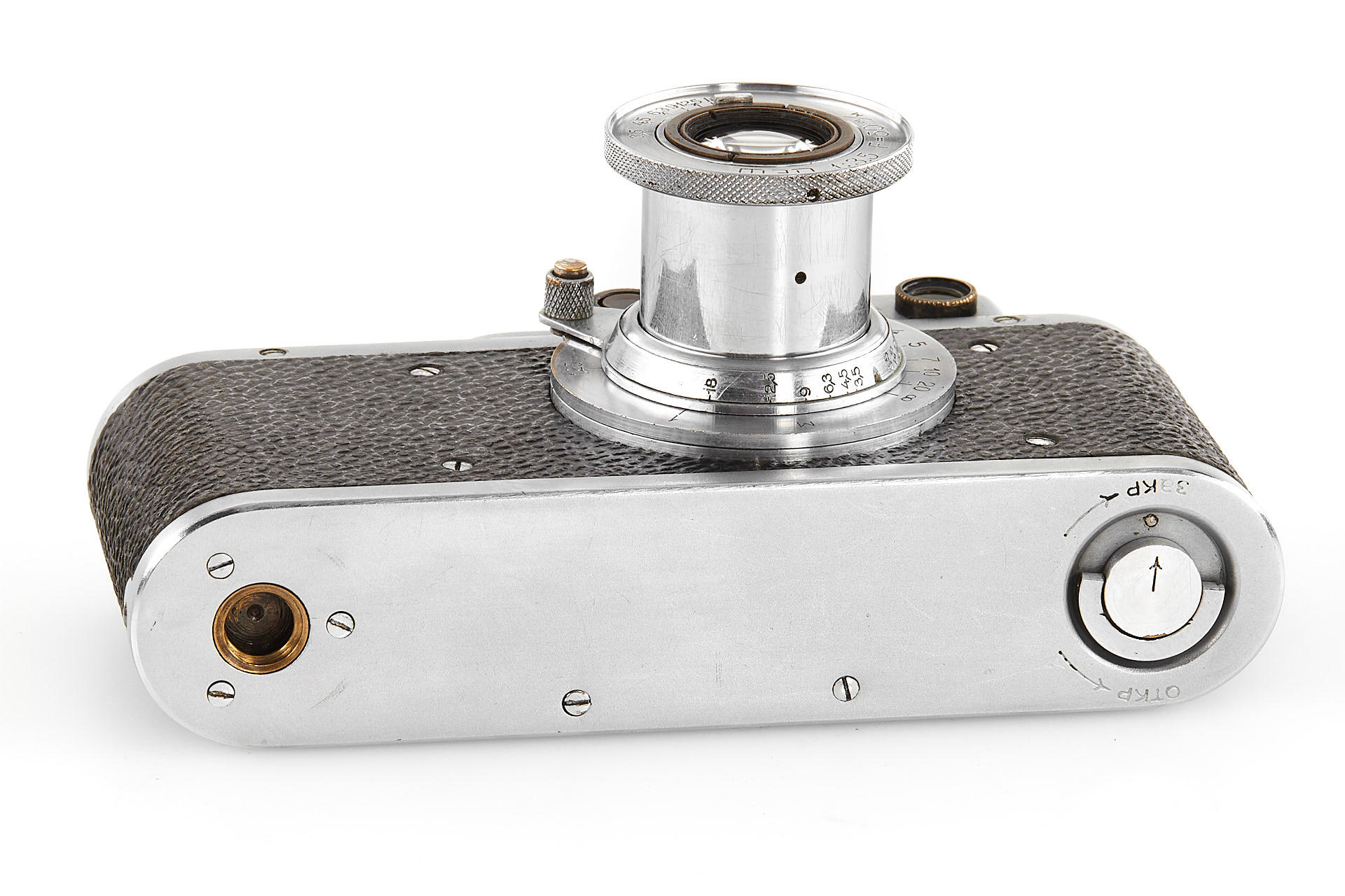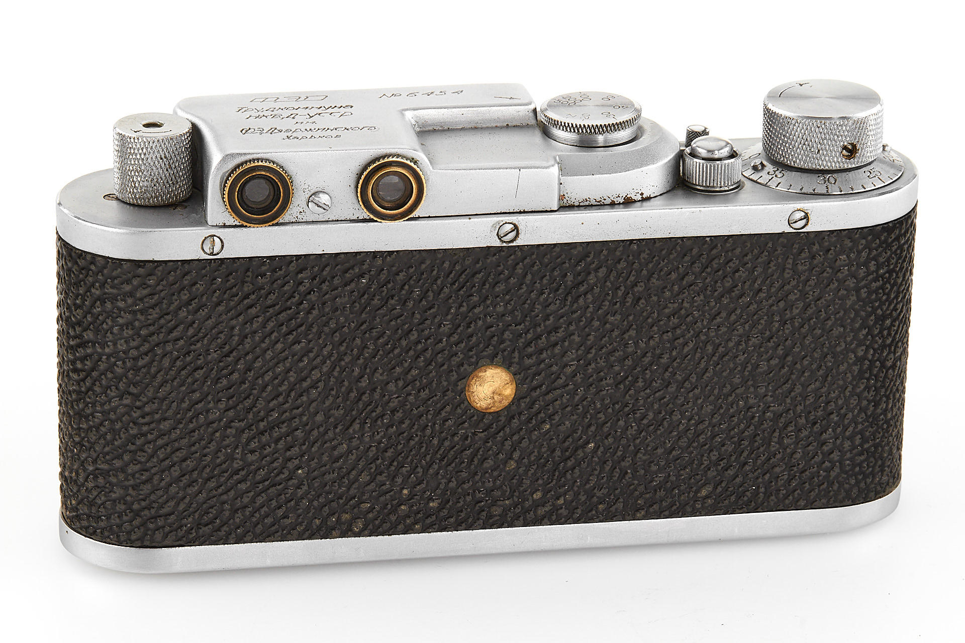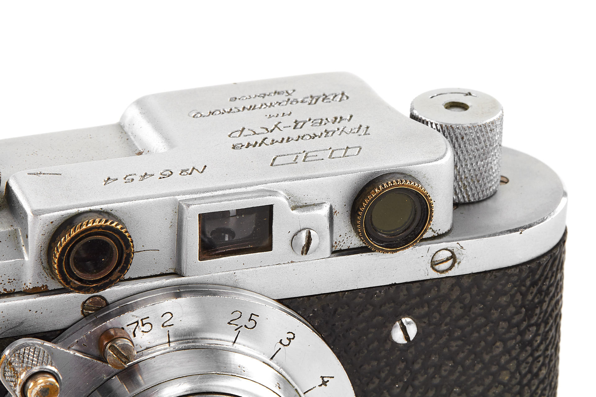 early and rare Fed in satin chrome finish, without a flash shoe, in very good condition, original green shutter curtain (not lightproof), special leather covering, with matching Fed 3.5/50mm (stamped on the mounting flange with the number 6399), matching early leather case (worn)