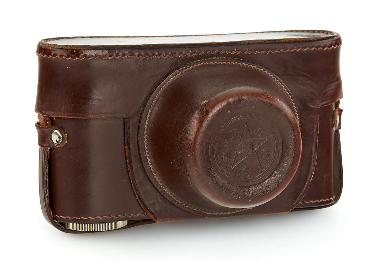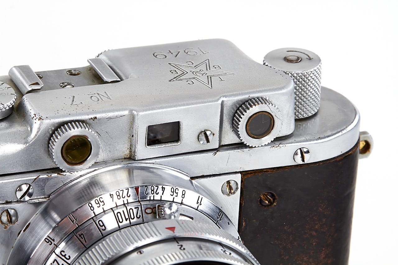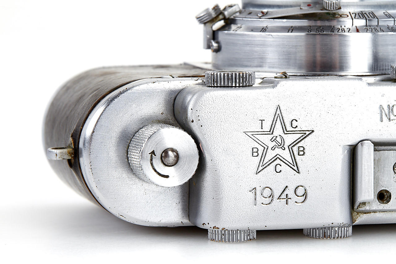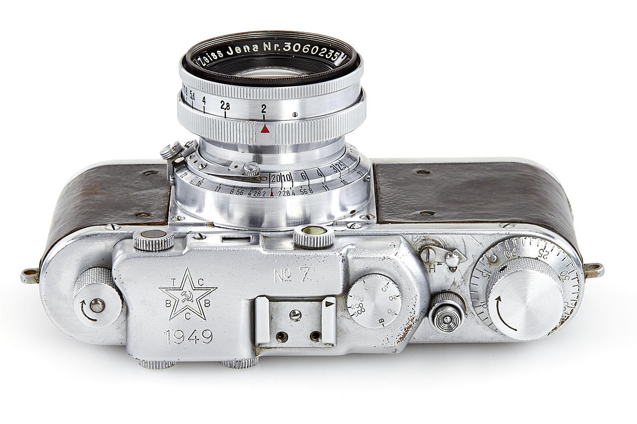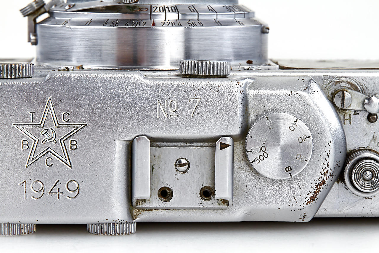 rare Russian Leica copy with Contax bayonet, the camera bears no maker's symbols, the TSVVS means Topographic Service of the Army Air Force, with matching Sonnar 2/5cm T no.3060235, in fine original condition, with rare original ever-ready case, with a serial number 7 this is the earliest example we have seen, the finish of the camera also differs from the later examples