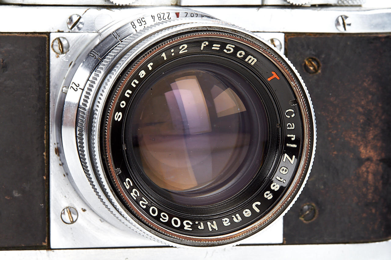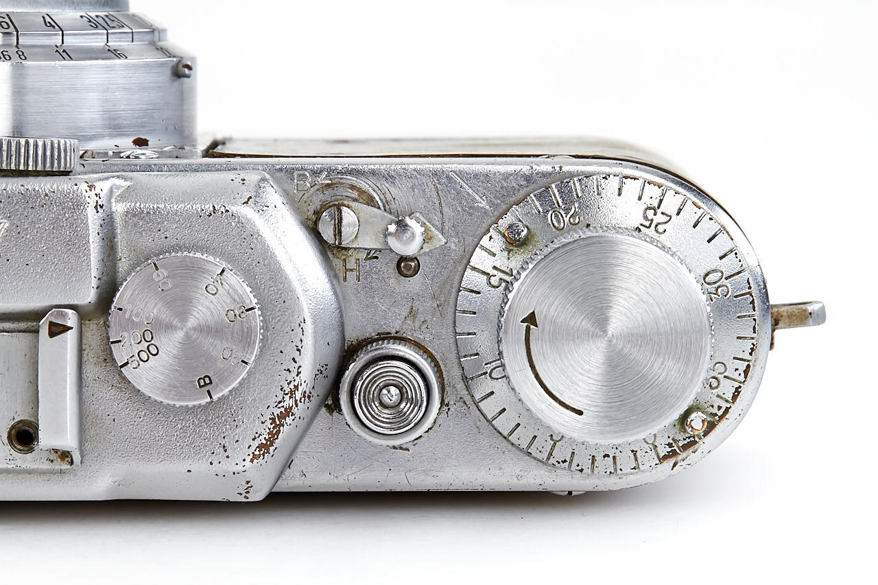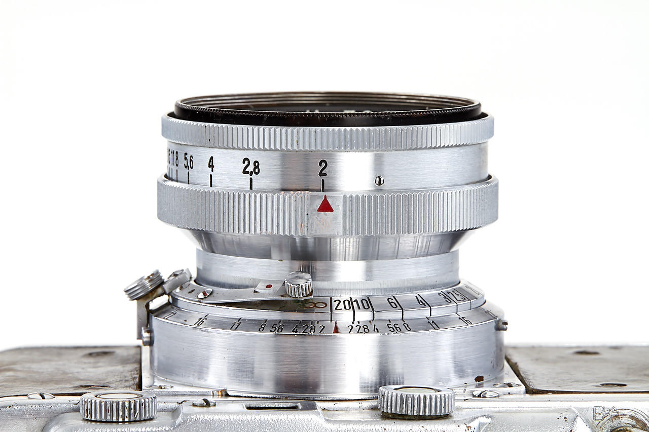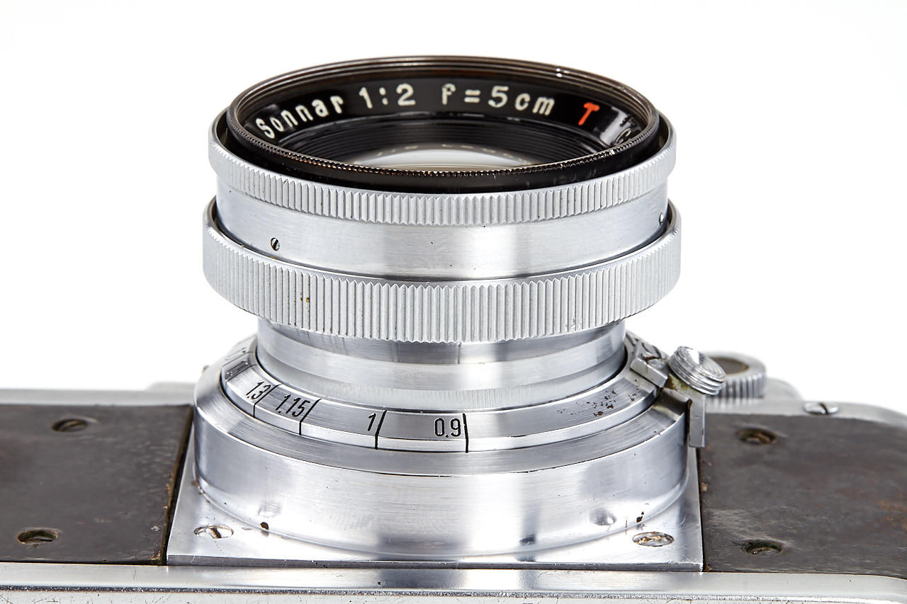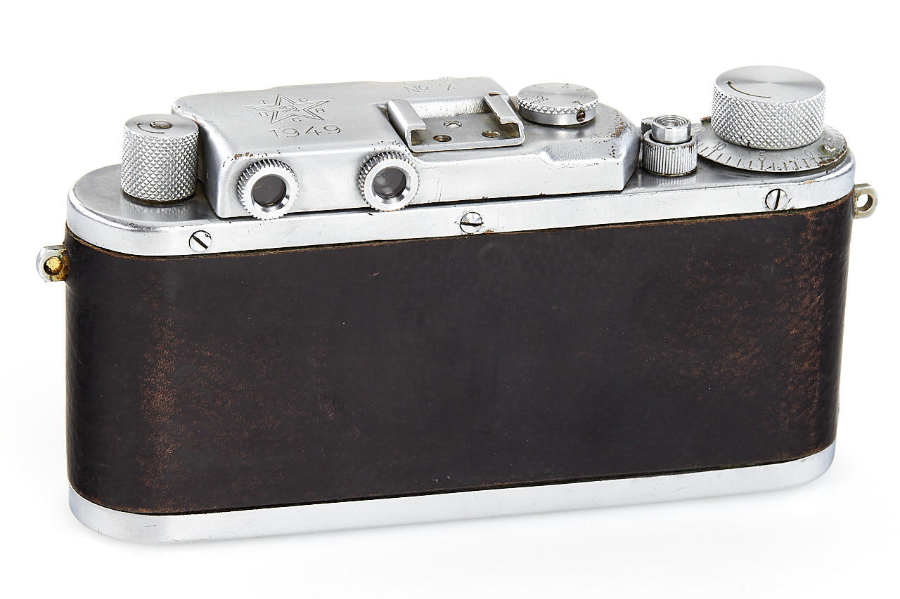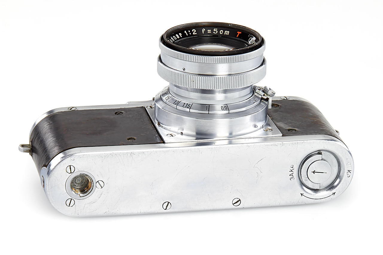 rare Russian Leica copy with Contax bayonet, the camera bears no maker's symbols, the TSVVS means Topographic Service of the Army Air Force, with matching Sonnar 2/5cm T no.3060235, in fine original condition, with rare original ever-ready case, with a serial number 7 this is the earliest example we have seen, the finish of the camera also differs from the later examples
