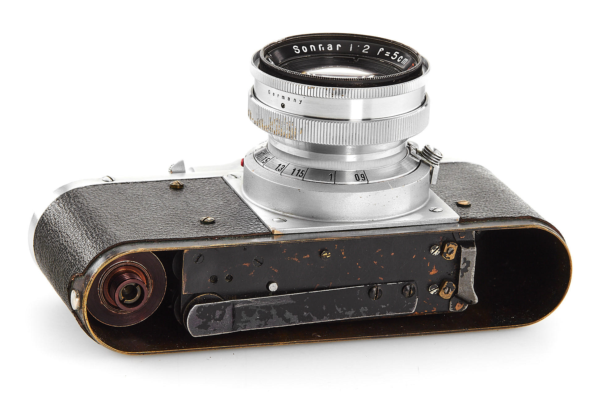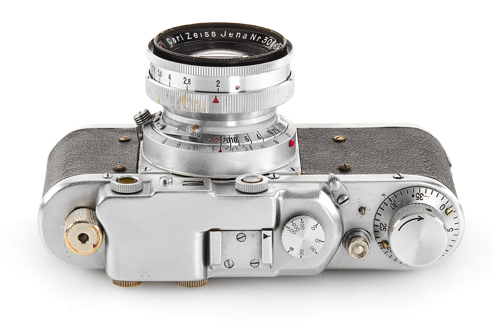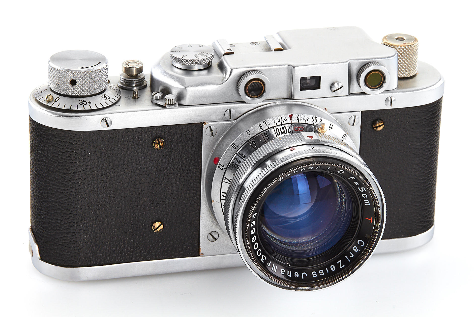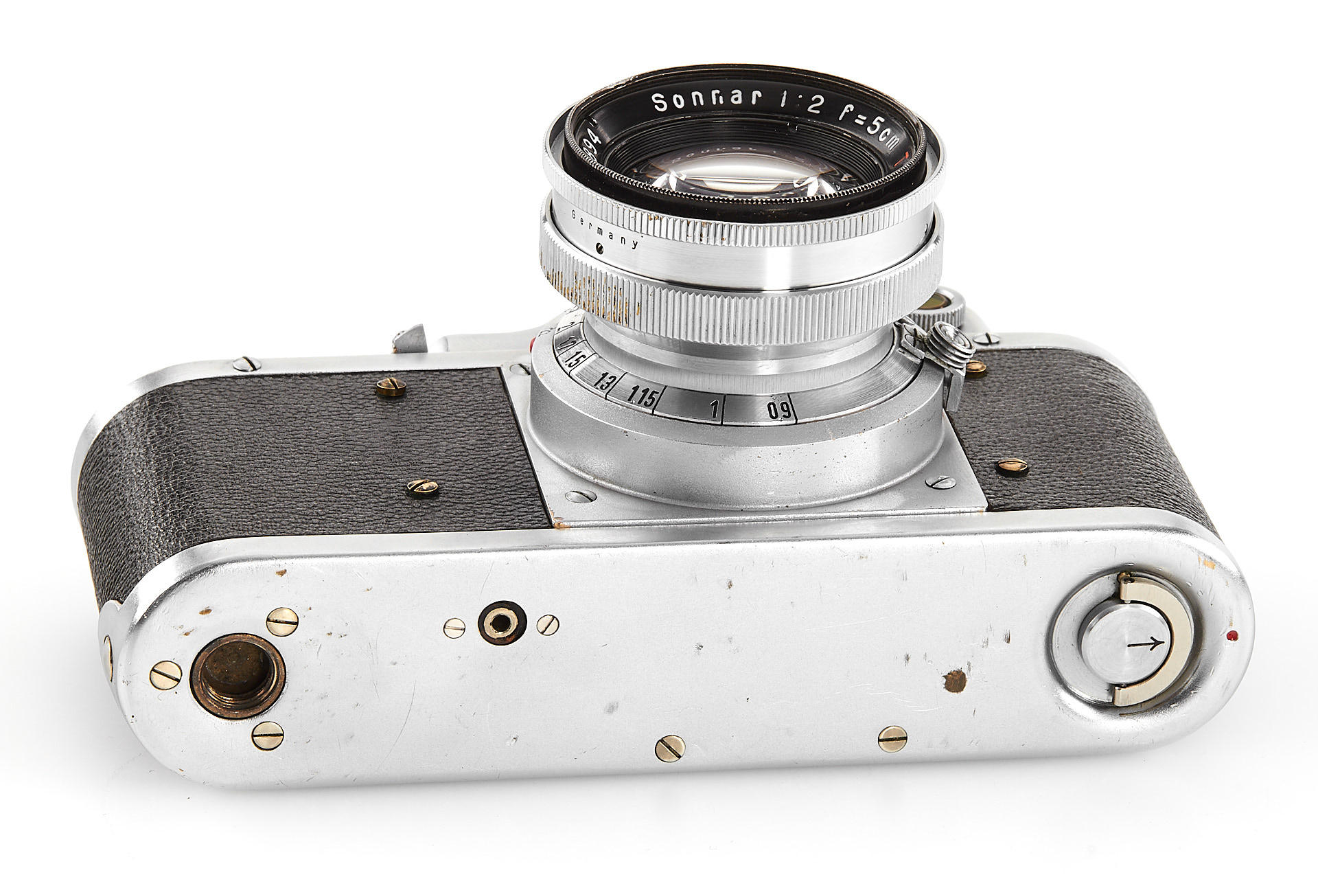 a prototype of the rare Russian Leica copy with Contax bayonet, unengraved body with several differences to the later production examples, such as the lack of strap lugs etc, special flash connection in the base plate, etc., with matching Sonnar 2/5cm T no.3006894, in very good original condition, with original ever-ready case