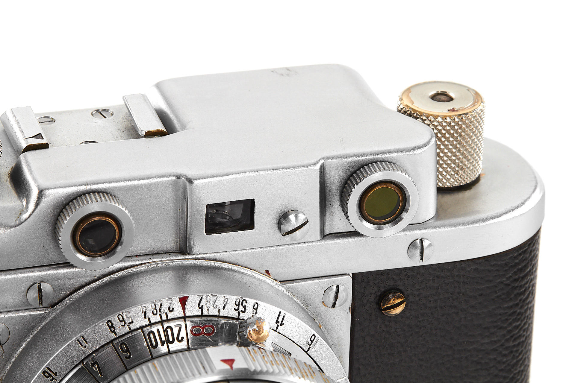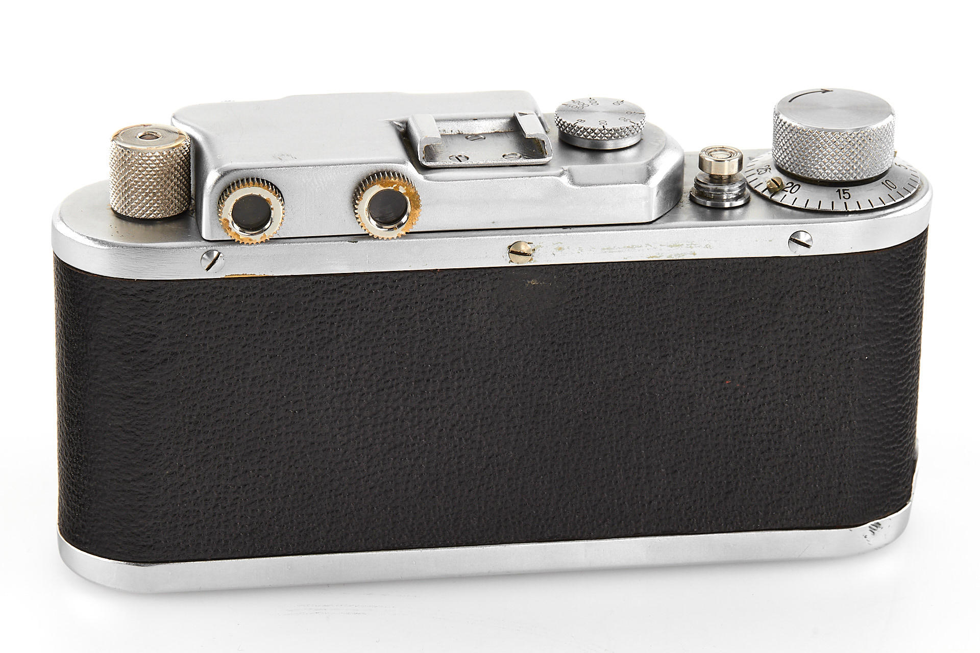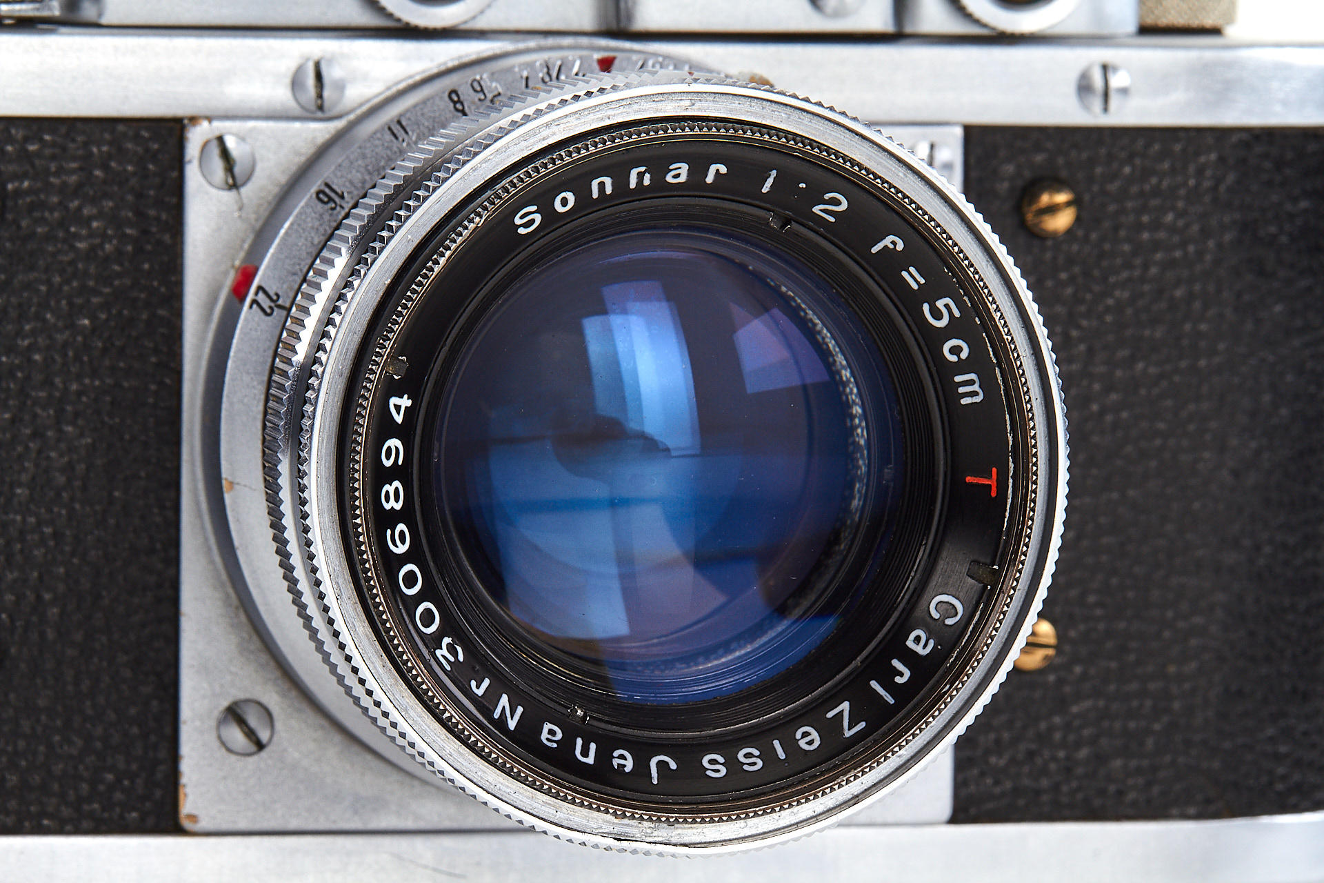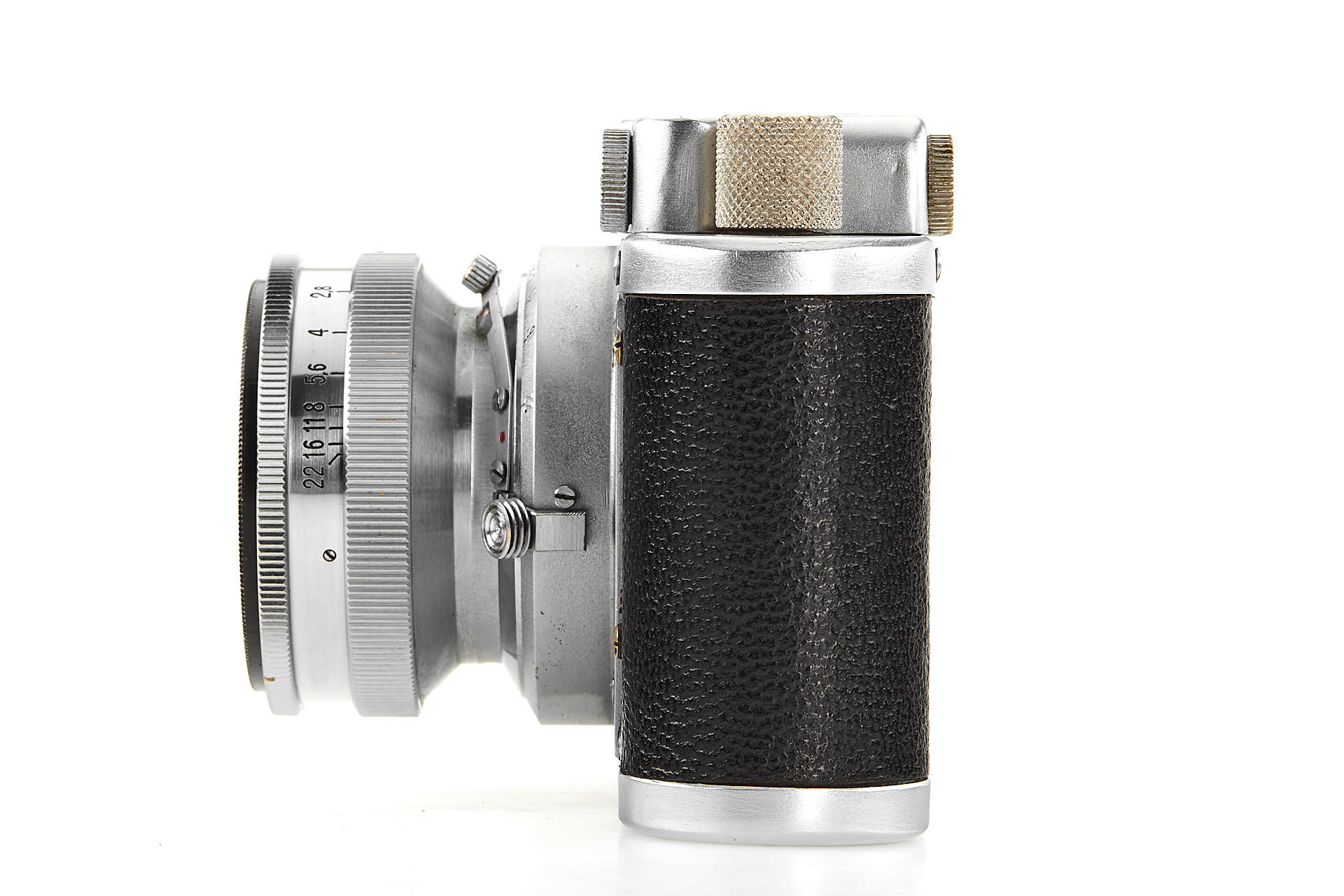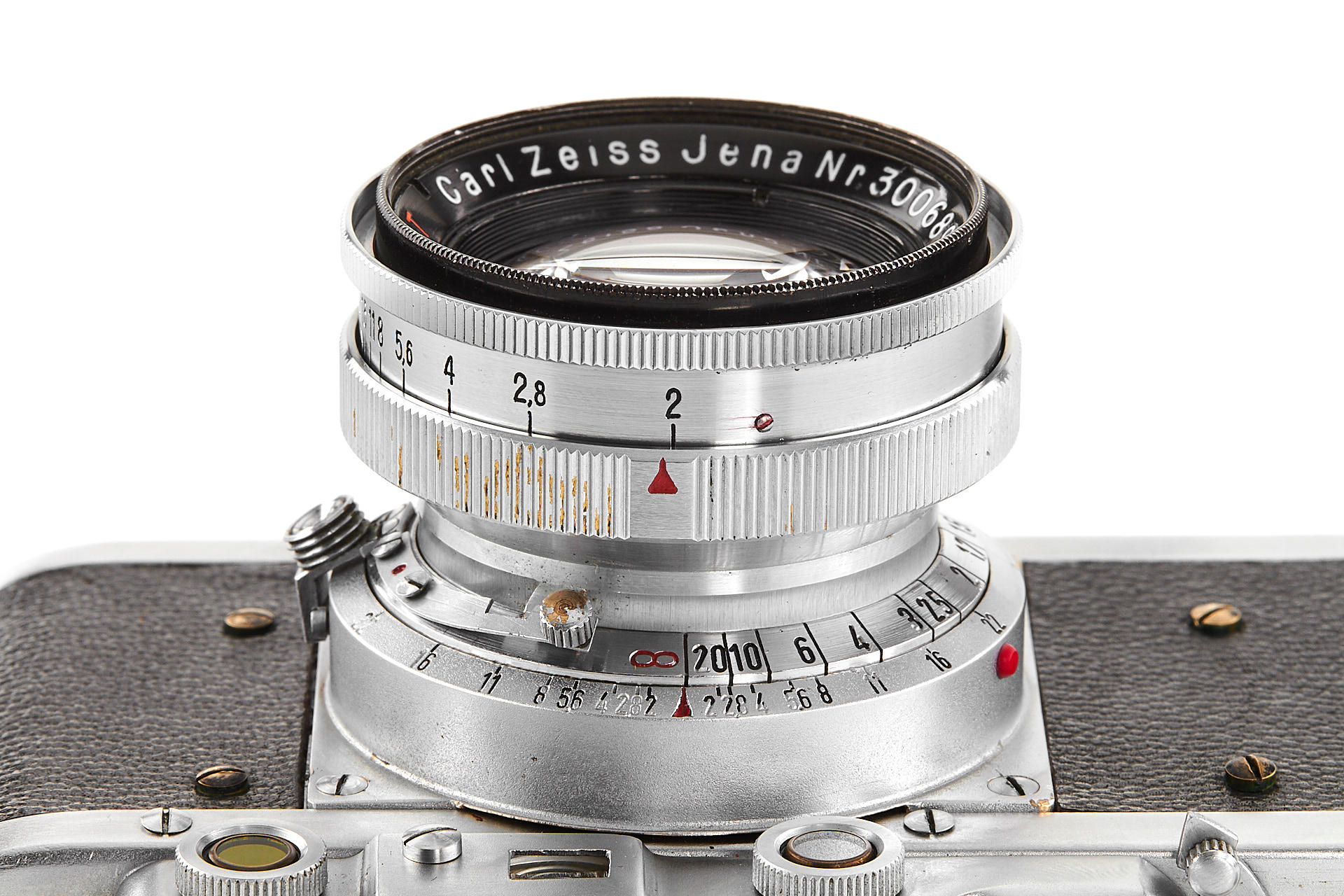 a prototype of the rare Russian Leica copy with Contax bayonet, unengraved body with several differences to the later production examples, such as the lack of strap lugs etc, special flash connection in the base plate, etc., with matching Sonnar 2/5cm T no.3006894, in very good original condition, with original ever-ready case