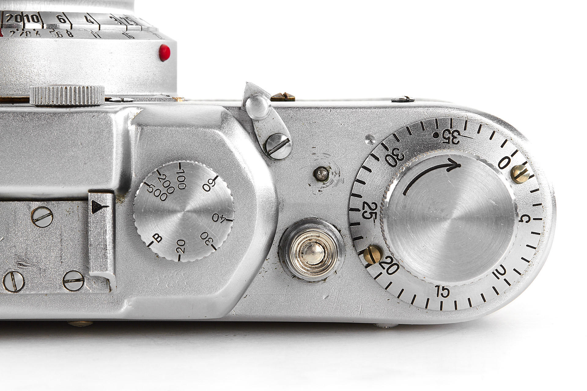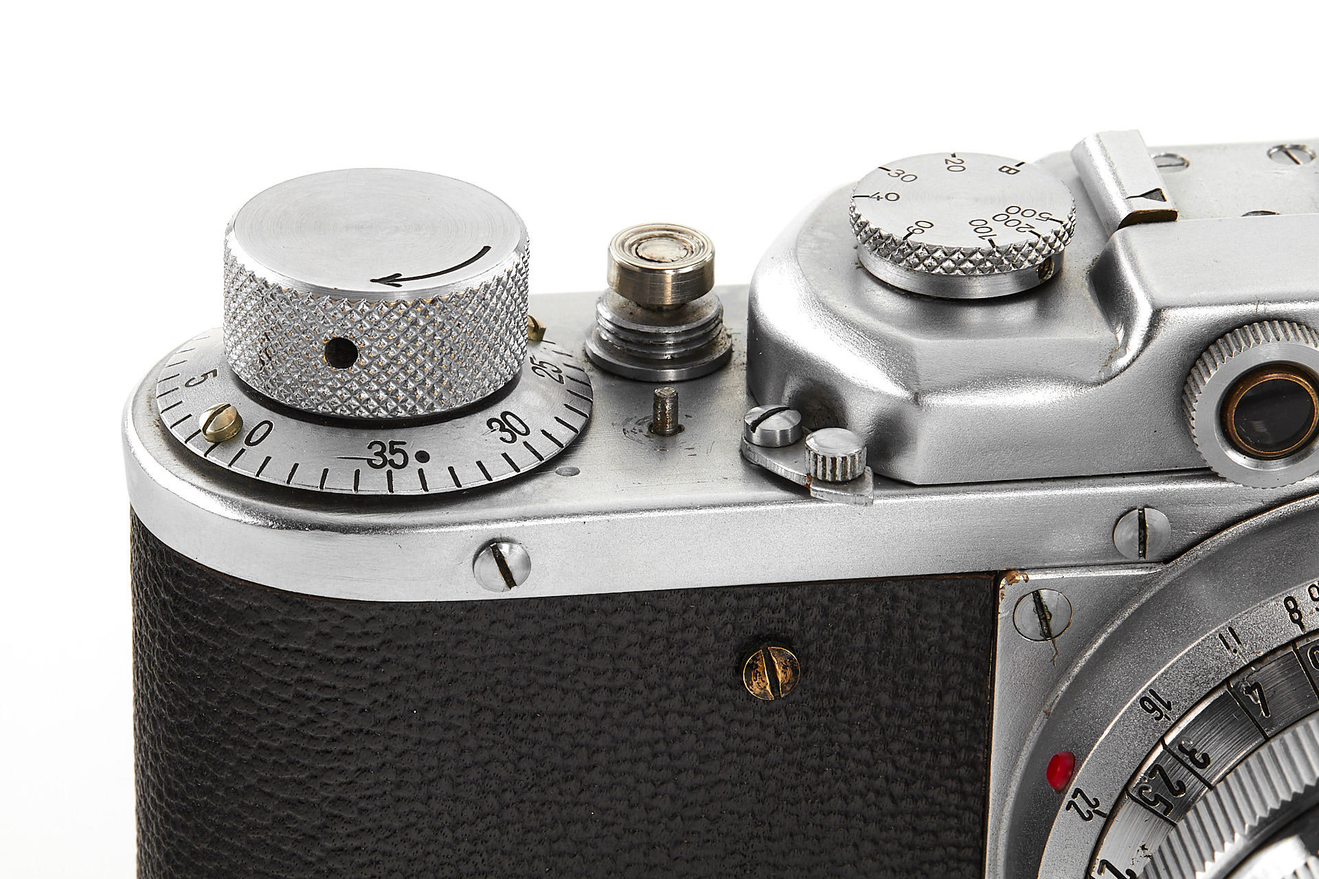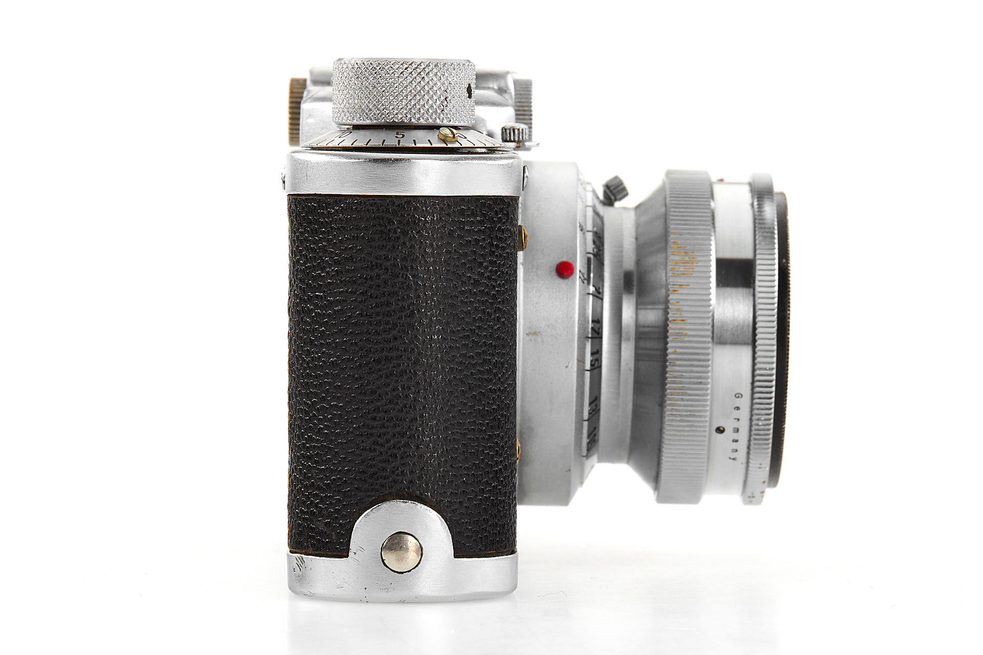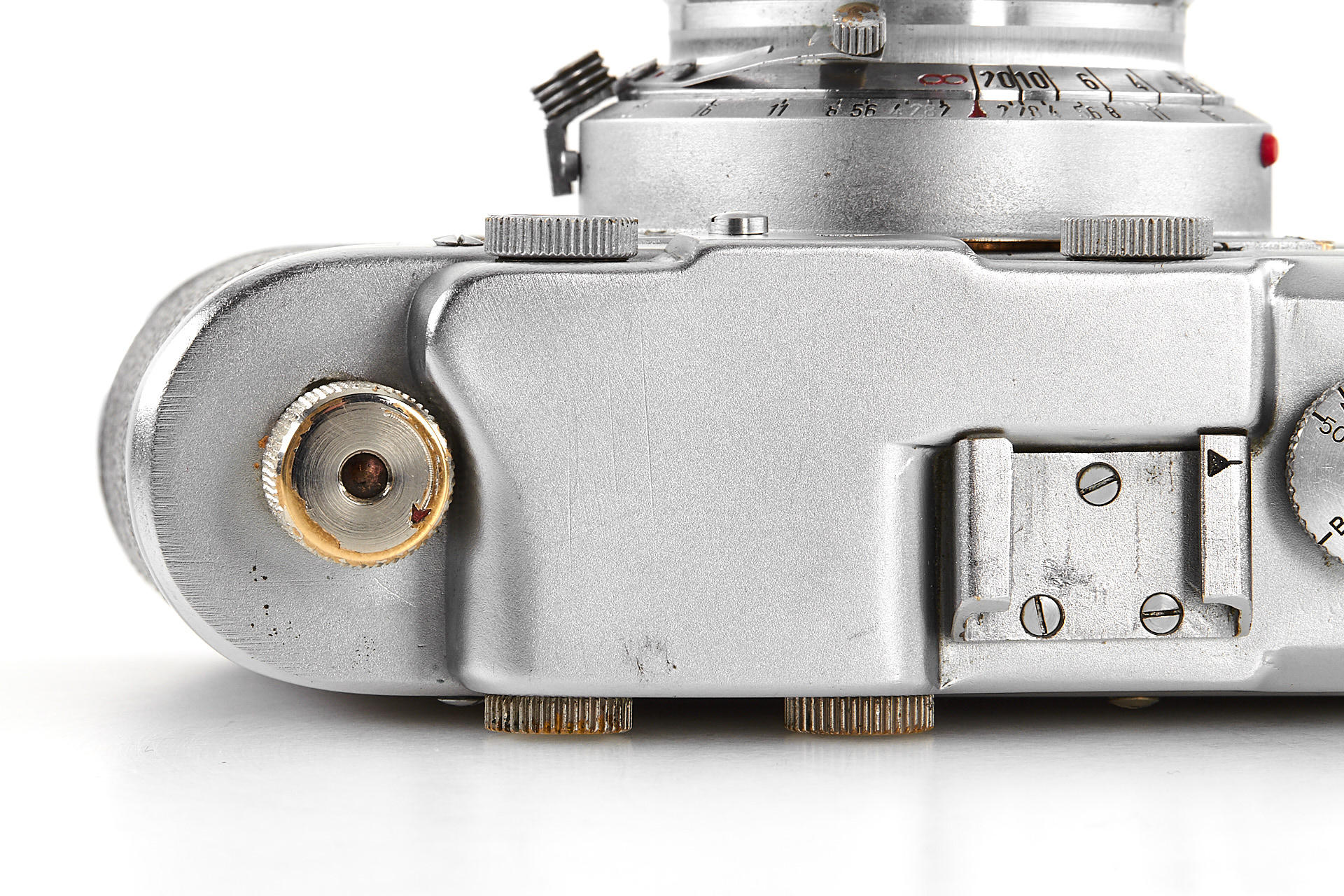 a prototype of the rare Russian Leica copy with Contax bayonet, unengraved body with several differences to the later production examples, such as the lack of strap lugs etc, special flash connection in the base plate, etc., with matching Sonnar 2/5cm T no.3006894, in very good original condition, with original ever-ready case