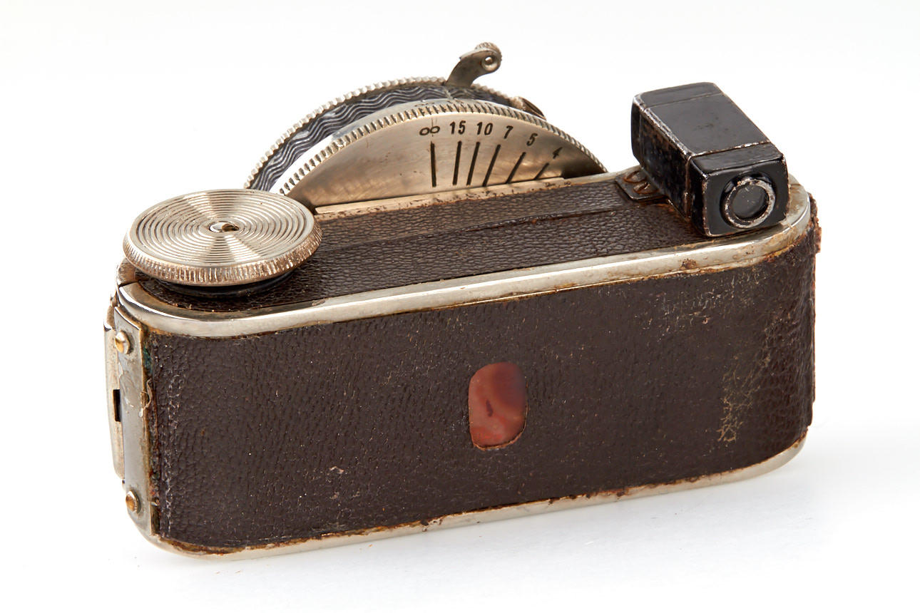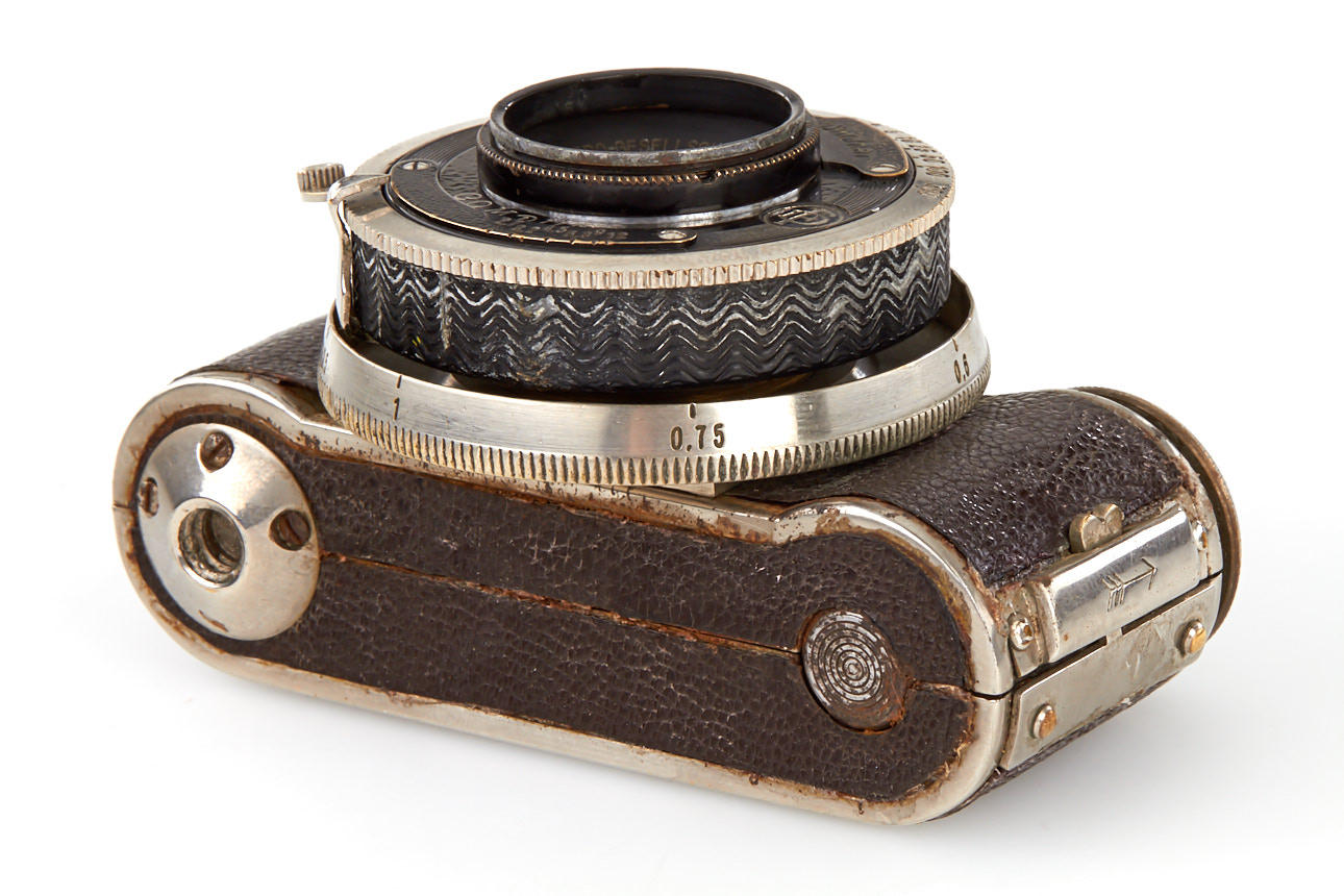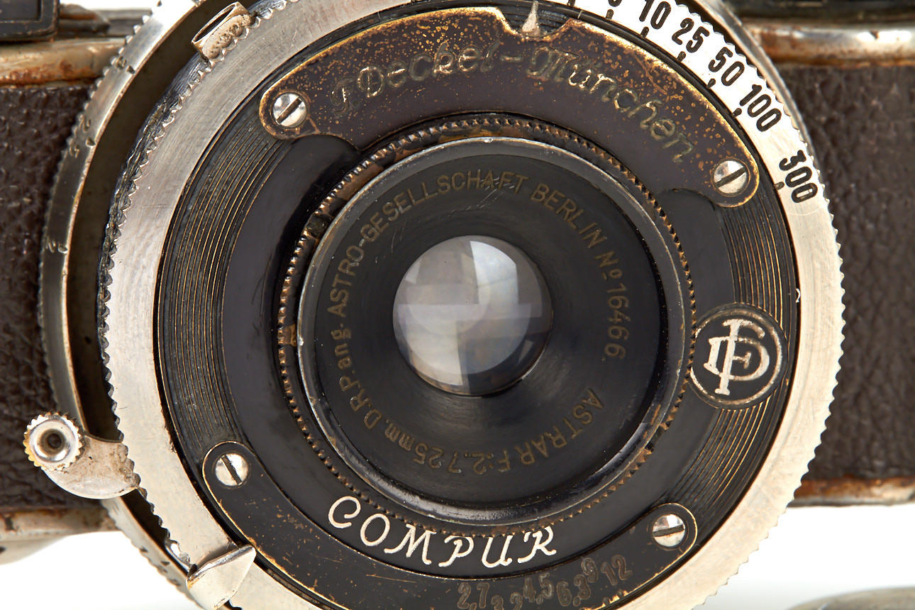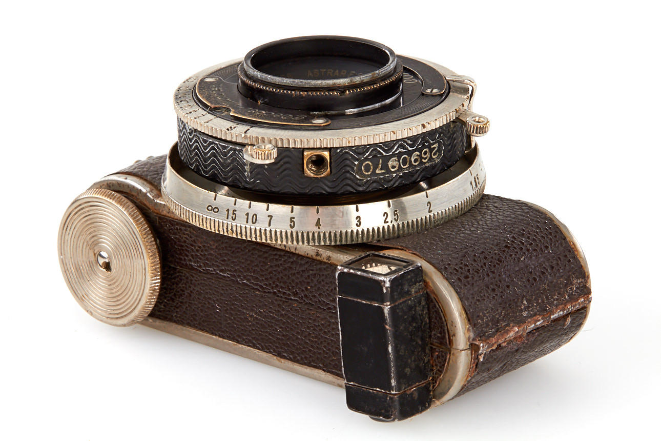 rare miniature camera with fast Astro-Berlin Astrar 2.7/27mm no.16466 in Compur shutter, in very good original condition, brown leather covering, lens cap