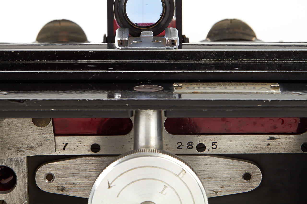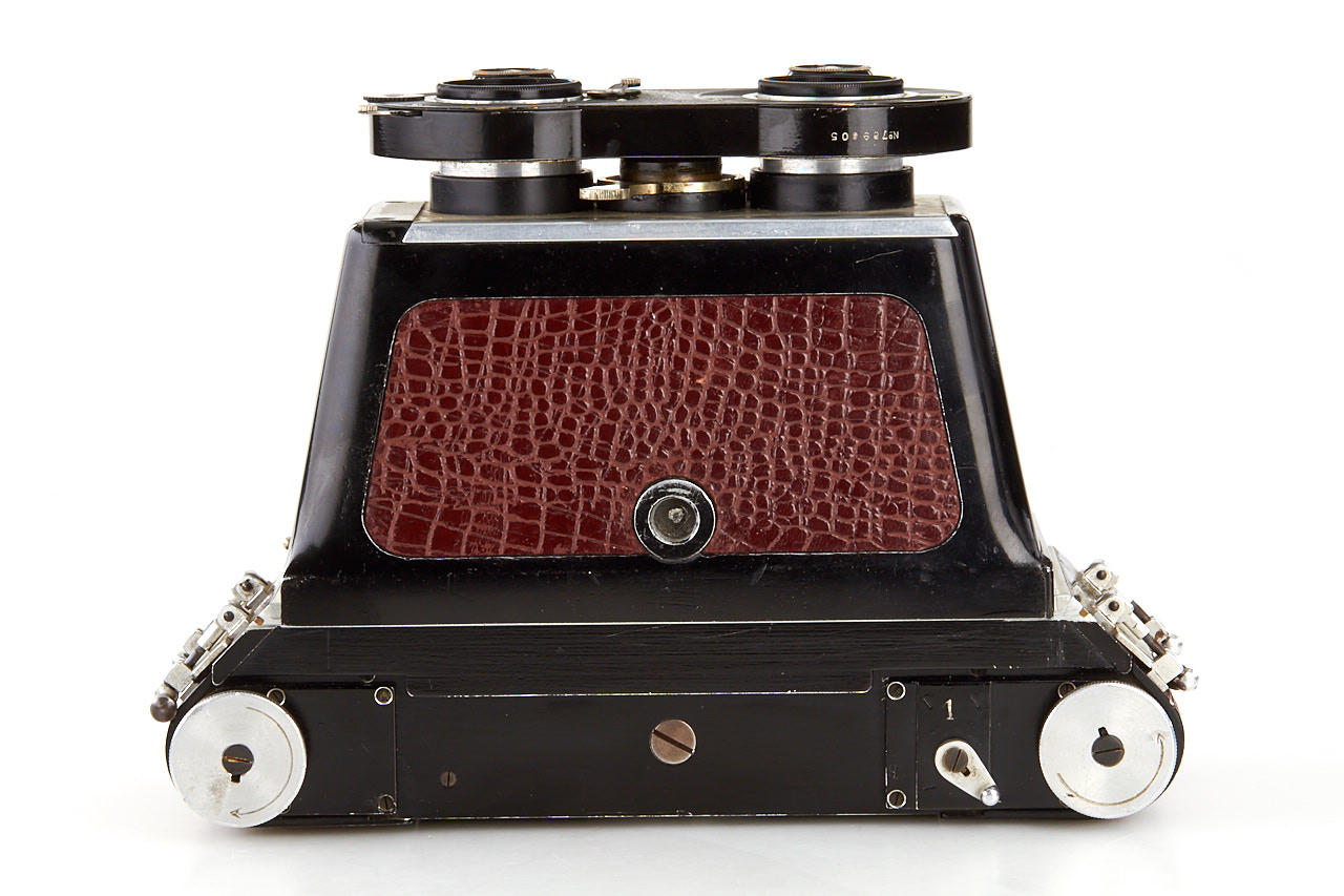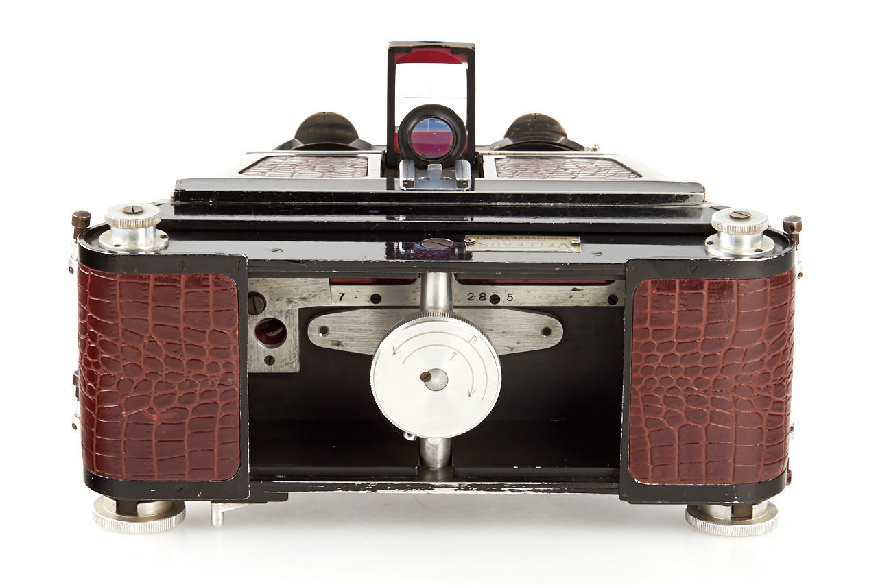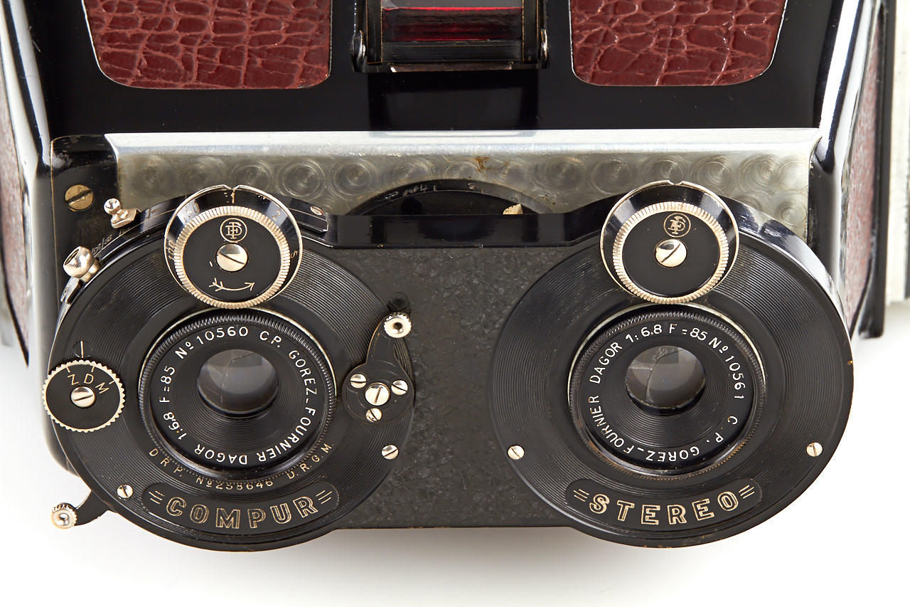 rare French stereo camera for dual 6x6cm exposures on roll film, cast aluminium body with red leather covering, dual Goerz-Fournier Dagor 6.8/85mm no.10560 and 10561 in Compur stereo shutter, Velleaus rollfilm back in matching finish to the camera, very unique and attractive