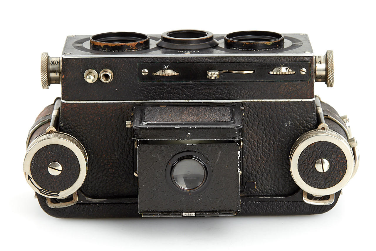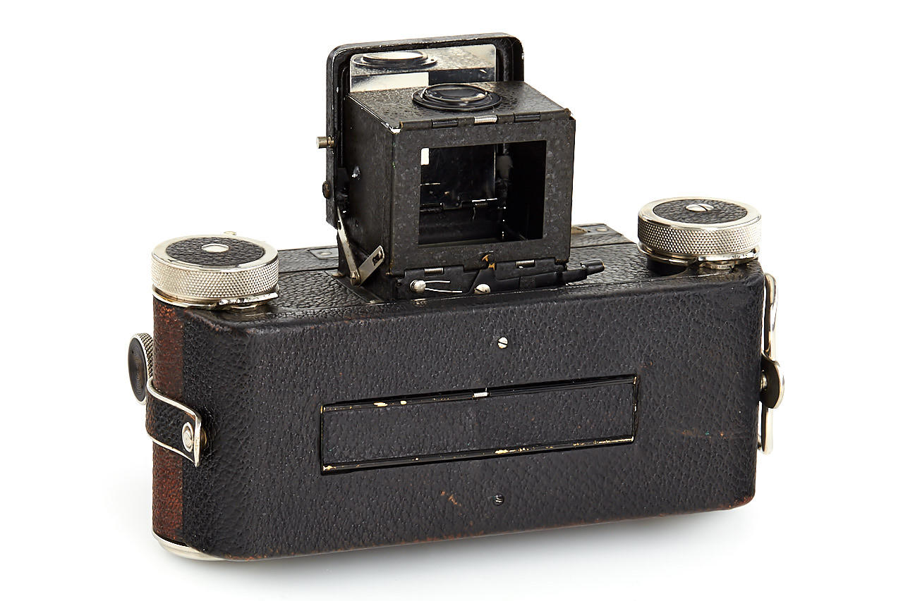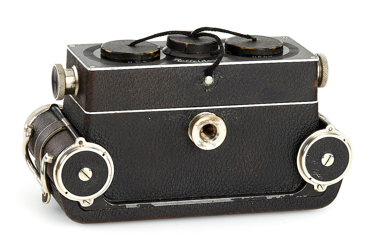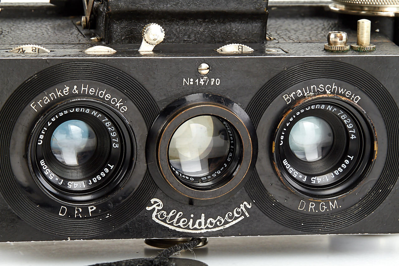 very rare small version Rolleidoscop for dual 4x4cm exposures on 127 film, there were only 391 'baby' Rolleidoscopes made from 1927 to 1932 (only 200 in this, second version), in very good original condition, with dual Tessar 4.5/5.5cm no.782973 and 78974, original lens caps and strap