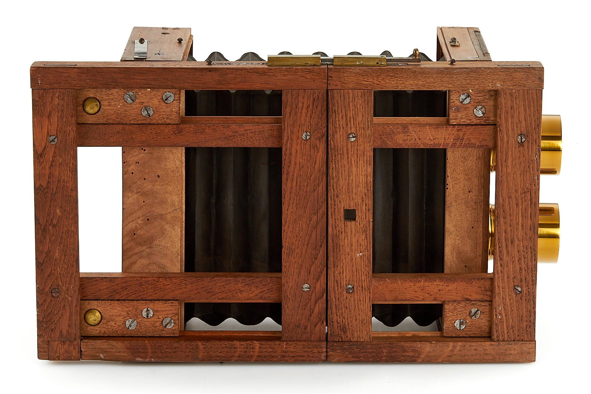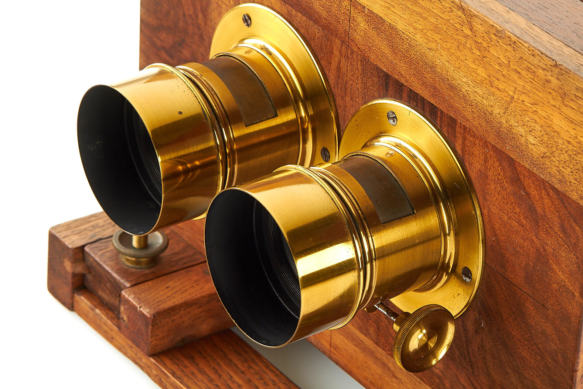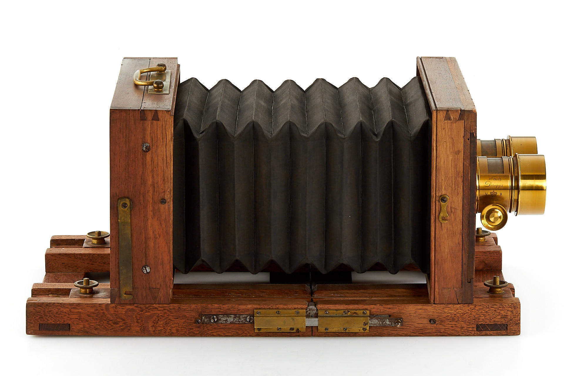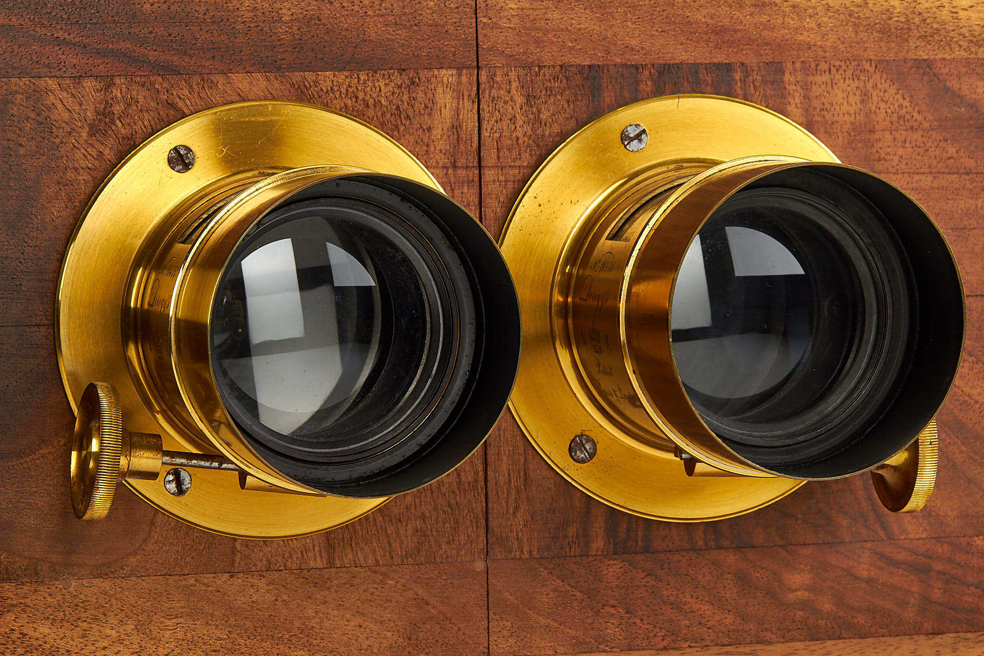 early French stereo camera for 12x21cm exposures on wet plates, in very good, unrestored condition, with two Derogy Petzval-type lenses no.11448 and 11453 (a matching stereo pair with one focusing knob on the left side and one on the right), two original plate holders