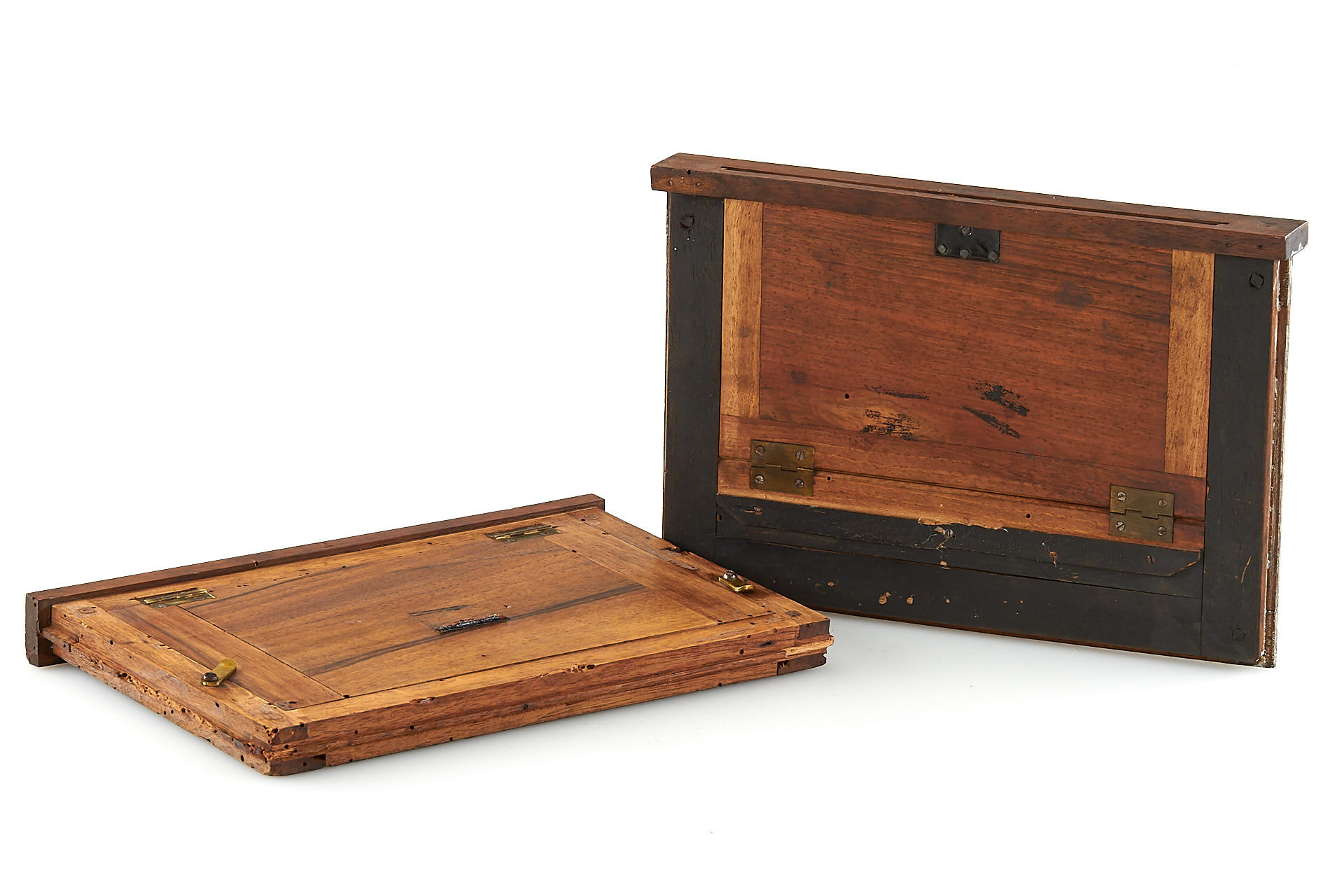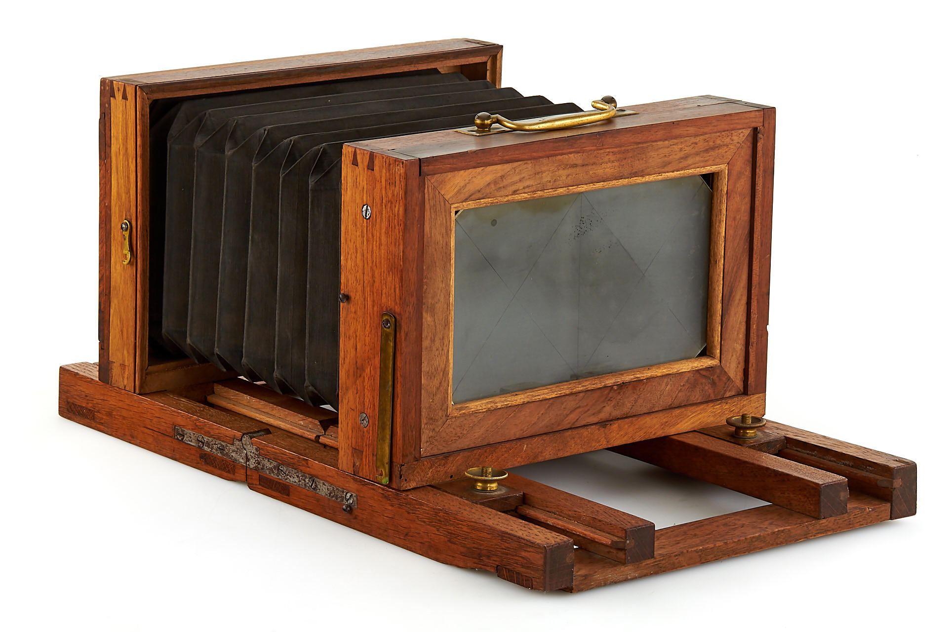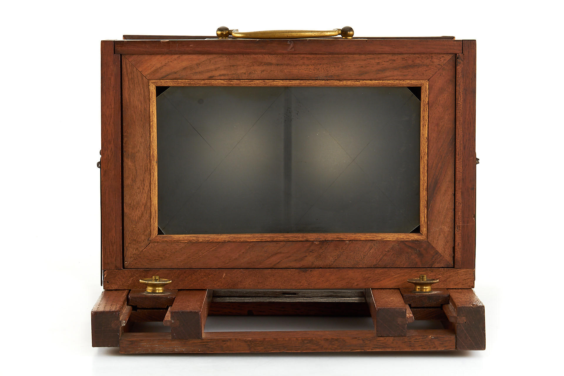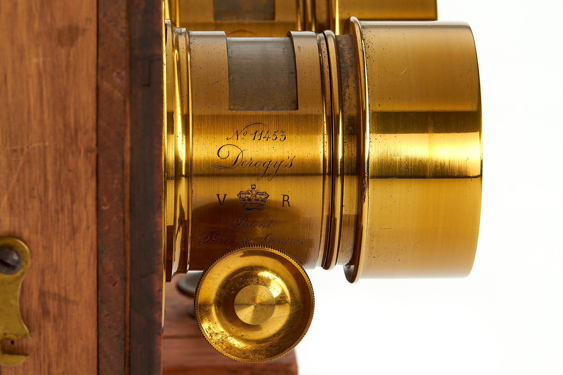 early French stereo camera for 12x21cm exposures on wet plates, in very good, unrestored condition, with two Derogy Petzval-type lenses no.11448 and 11453 (a matching stereo pair with one focusing knob on the left side and one on the right), two original plate holders
