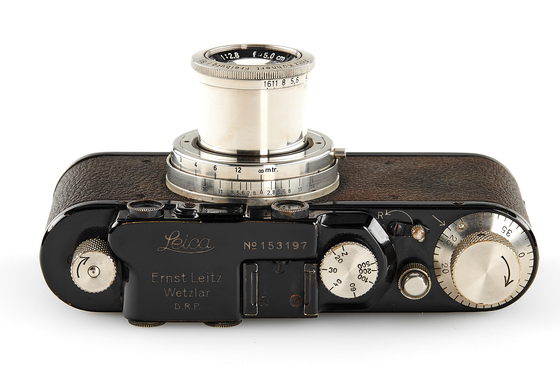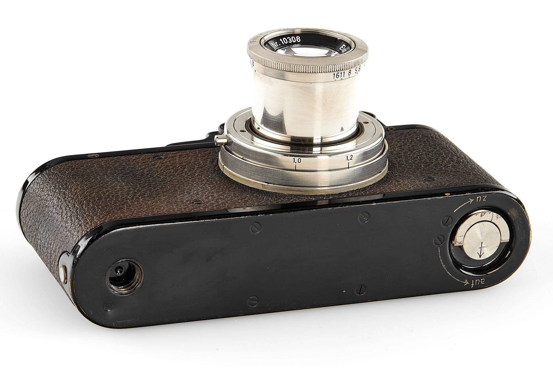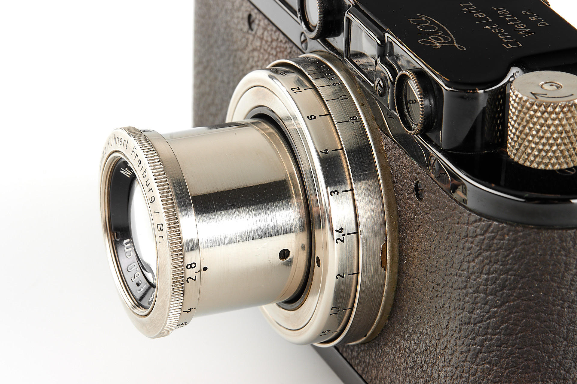 A very rare standard uncoated lens, rangefinder coupled for Leica M39 with nickel housing in mint condition, made by Fritz Kuhnert, Freiburg, Germany, who was best known for his Futura cameras, clean glass, with Leica II Mod. D no.153197 (1935) in very good condition and working order