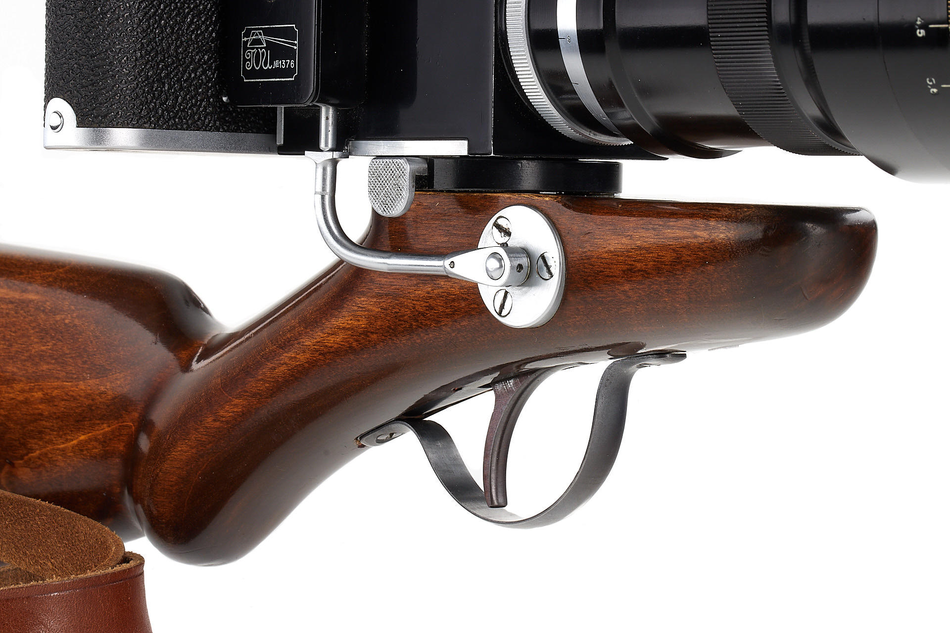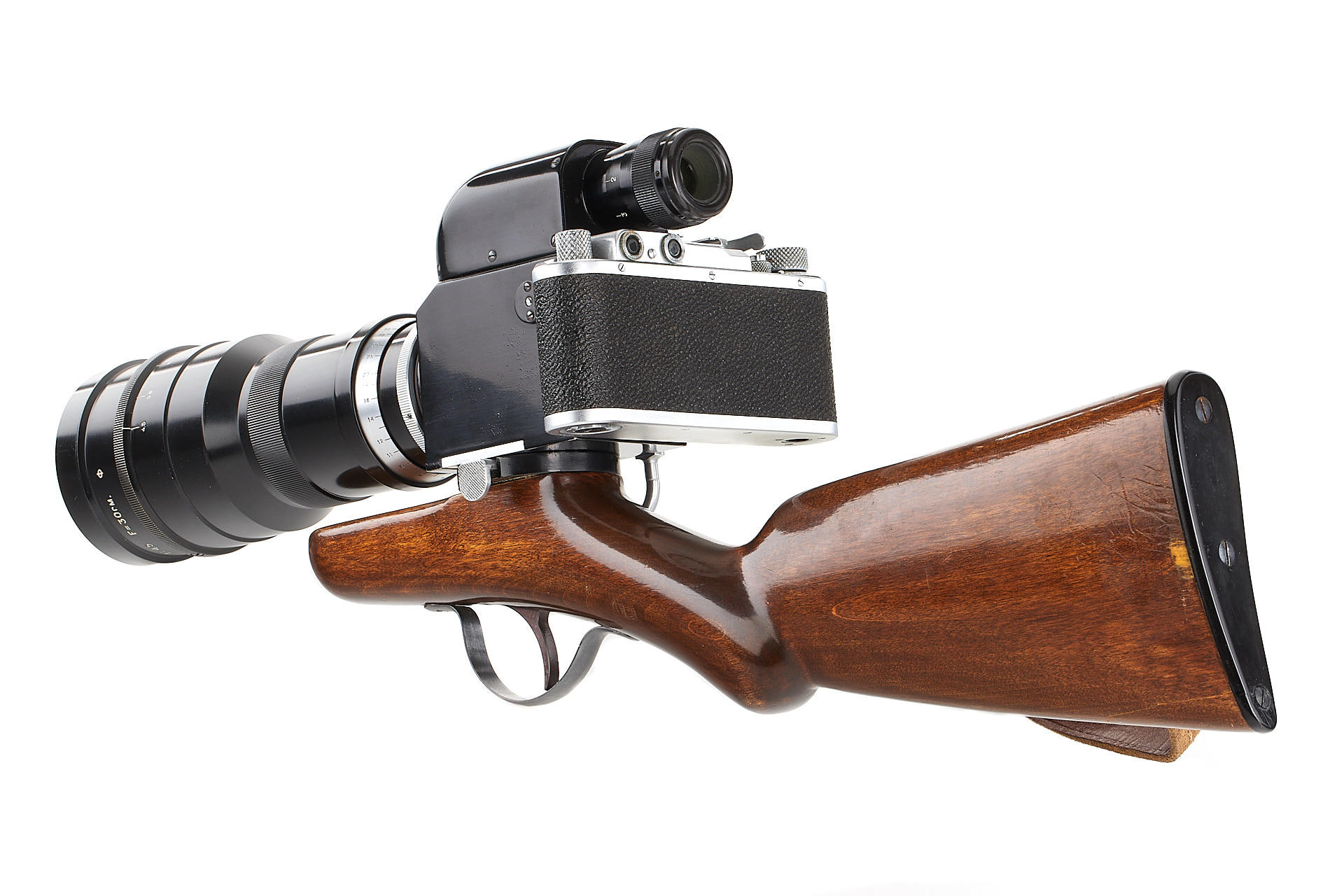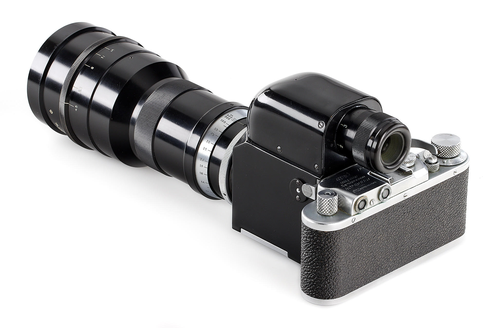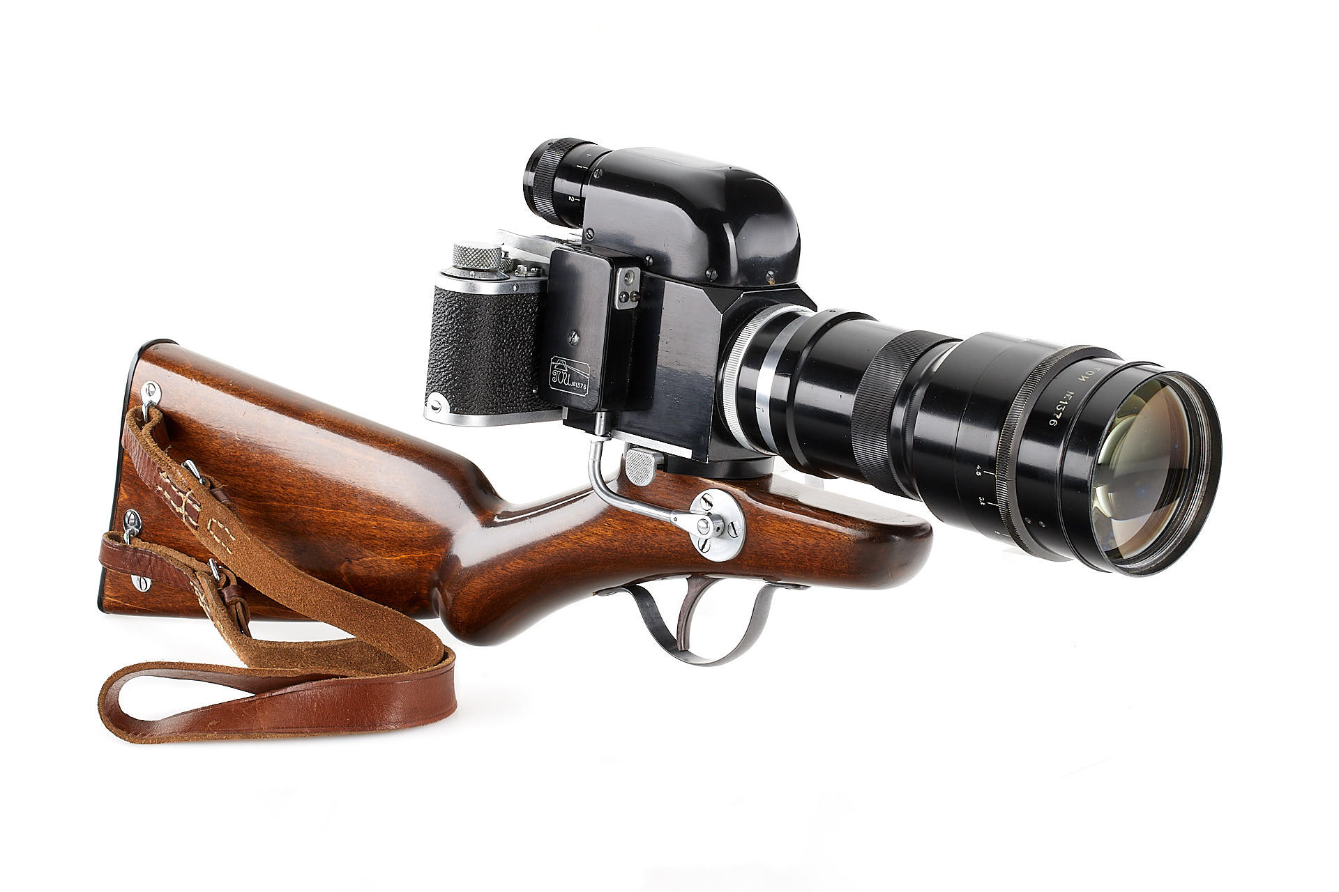 A very rare outfit only made in very small numbers for the Soviet Army in 1937-1941, the imposing mirror housing no.1376 showing an enlarged image, version with the shorter viewer, with GOI 4.5/300mm no.1379 in a special 44mm mount (including an original hood), the FED body no.170586 is mounted to the reflex housing via a quick-release screwed on to the camera body, included is also the original strap (missing in most of the examples we have seen), everything in working order and beautiful cosmetic condition. A very impressive combination of a sniper rifle and a camera.