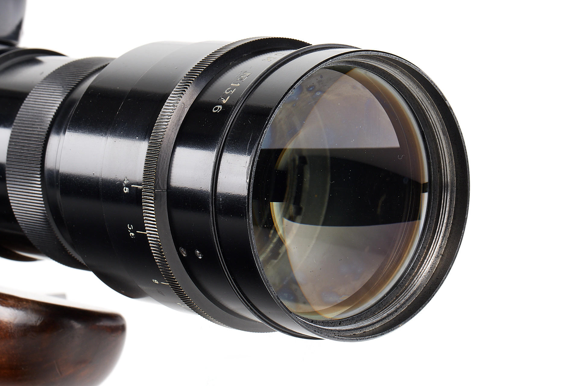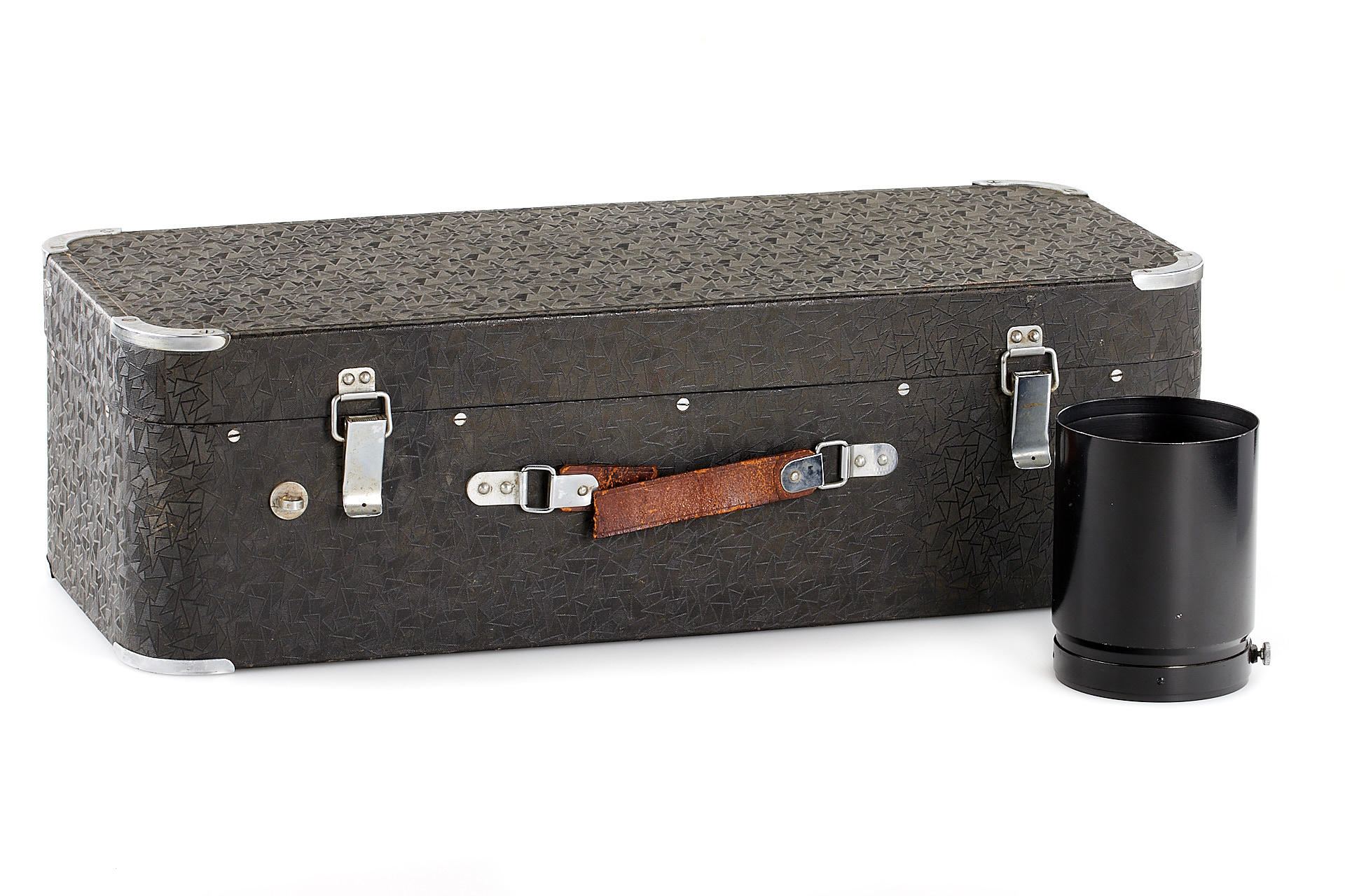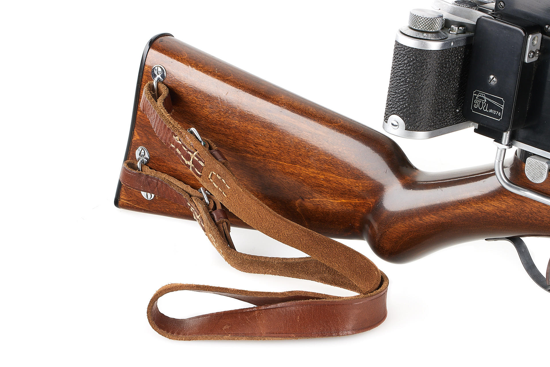 A very rare outfit only made in very small numbers for the Soviet Army in 1937-1941, the imposing mirror housing no.1376 showing an enlarged image, version with the shorter viewer, with GOI 4.5/300mm no.1379 in a special 44mm mount (including an original hood), the FED body no.170586 is mounted to the reflex housing via a quick-release screwed on to the camera body, included is also the original strap (missing in most of the examples we have seen), everything in working order and beautiful cosmetic condition. A very impressive combination of a sniper rifle and a camera.