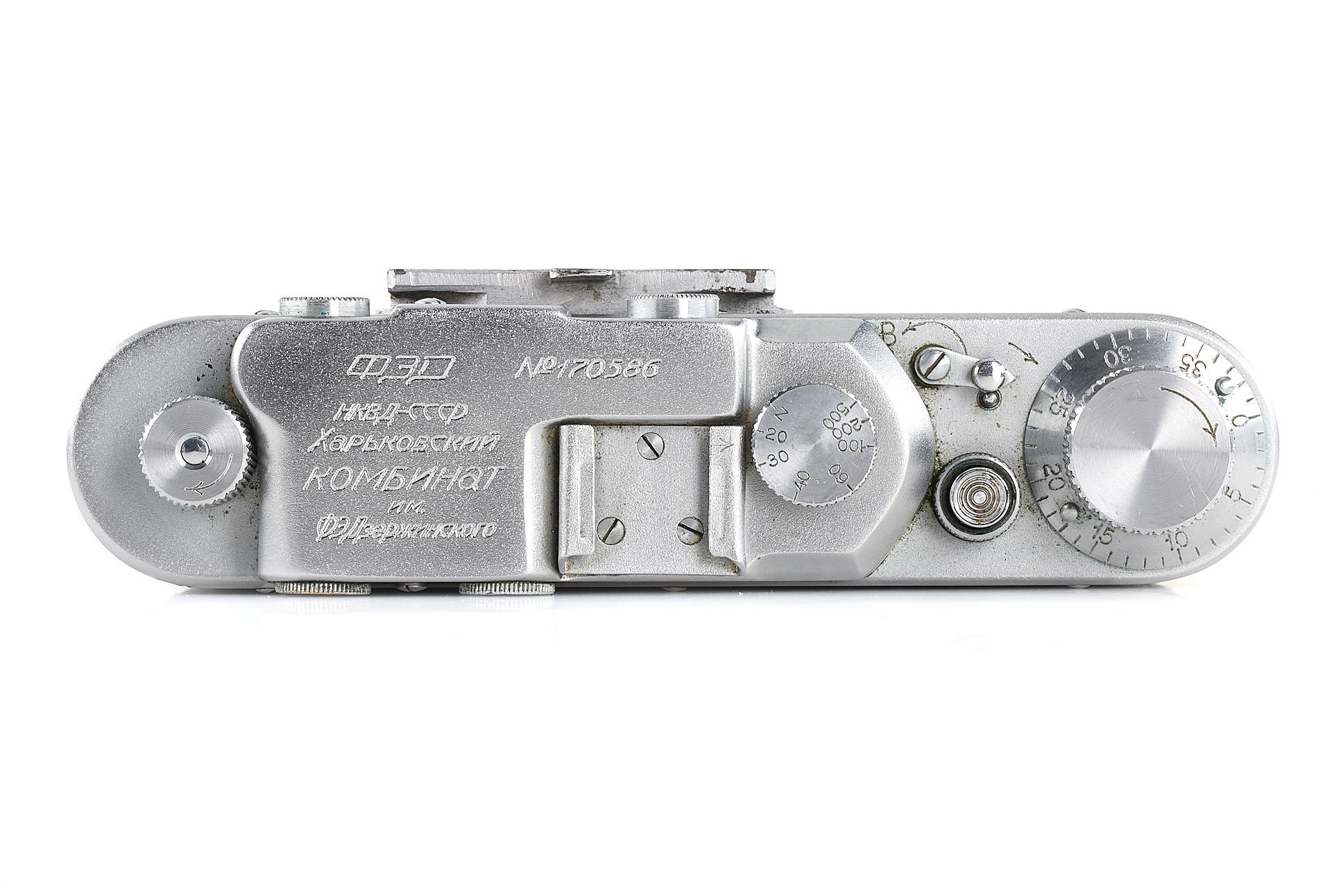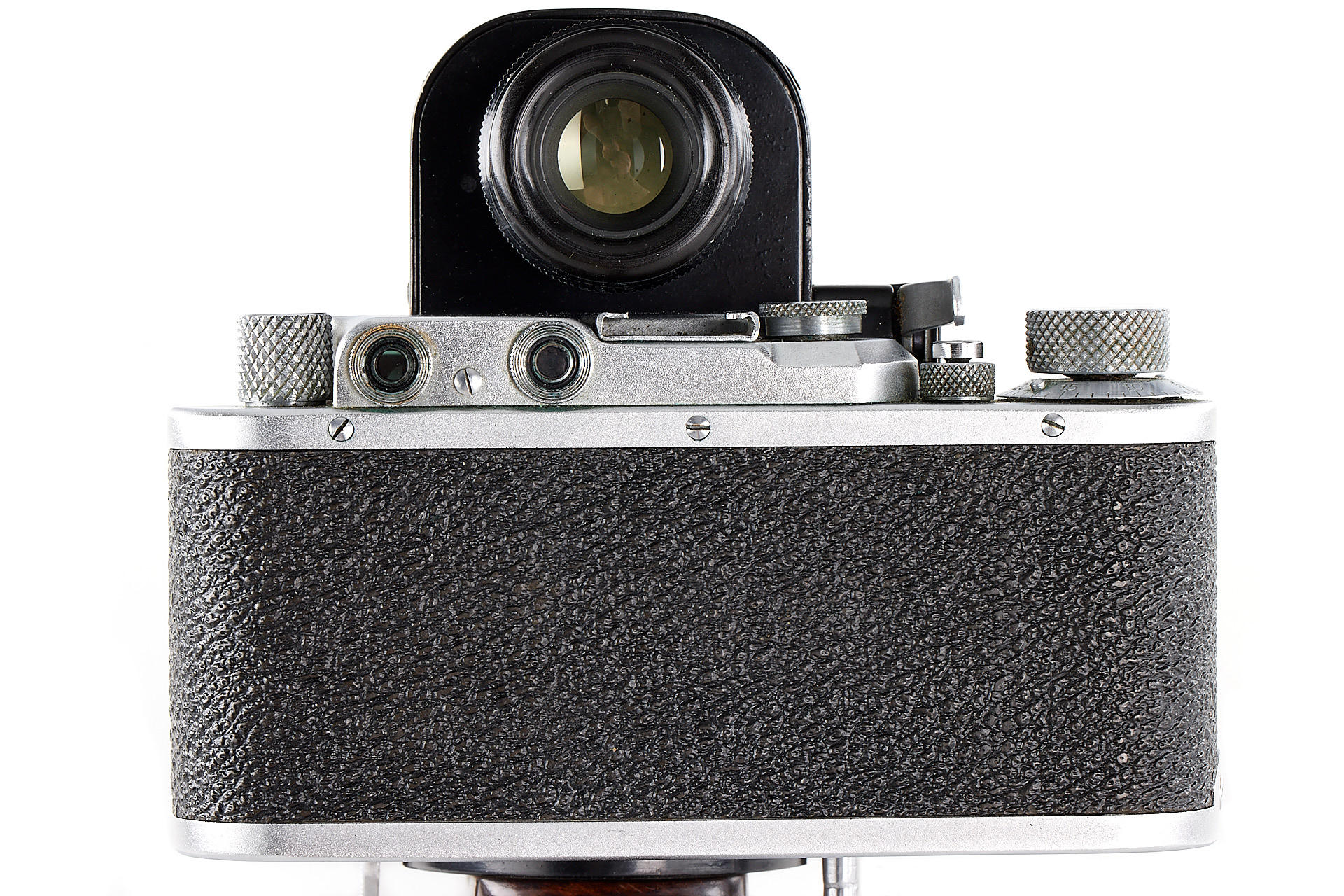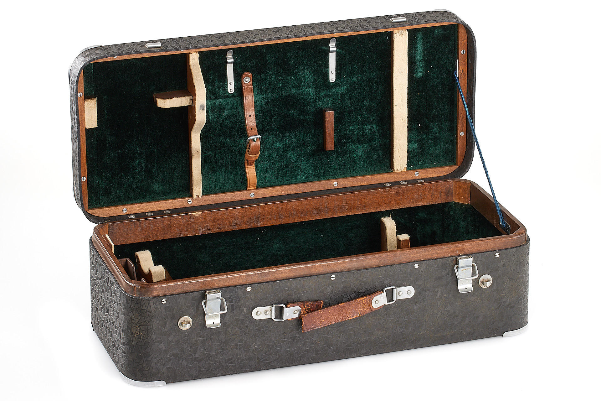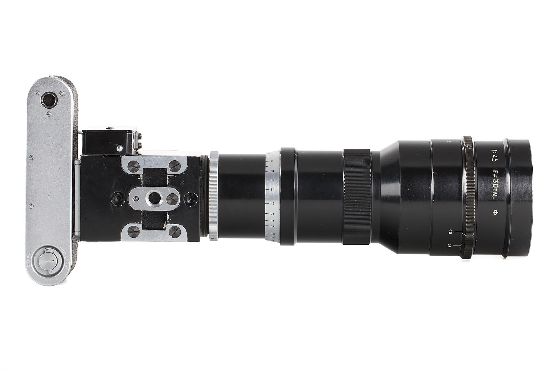 A very rare outfit only made in very small numbers for the Soviet Army in 1937-1941, the imposing mirror housing no.1376 showing an enlarged image, version with the shorter viewer, with GOI 4.5/300mm no.1379 in a special 44mm mount (including an original hood), the FED body no.170586 is mounted to the reflex housing via a quick-release screwed on to the camera body, included is also the original strap (missing in most of the examples we have seen), everything in working order and beautiful cosmetic condition. A very impressive combination of a sniper rifle and a camera.