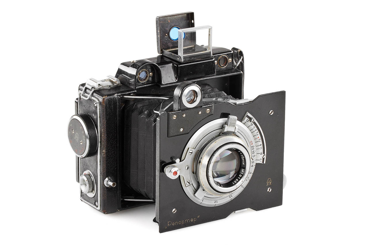 Very rare and highly sophisticated strut-folding camera, the Reporter combines the best features of the Plaubel Makina and Zeiss Nettar, it is a proof, that Russian engineers mastered a complex technology in only a few years, for 6.5x9cm plates, folding finder with blue-tinted eyepiece glass, interchangeable Industar-7 3.5/10.5cm no.191461, maker's front cap with logo, less than 20 of these cameras are known to exist.