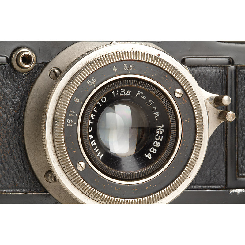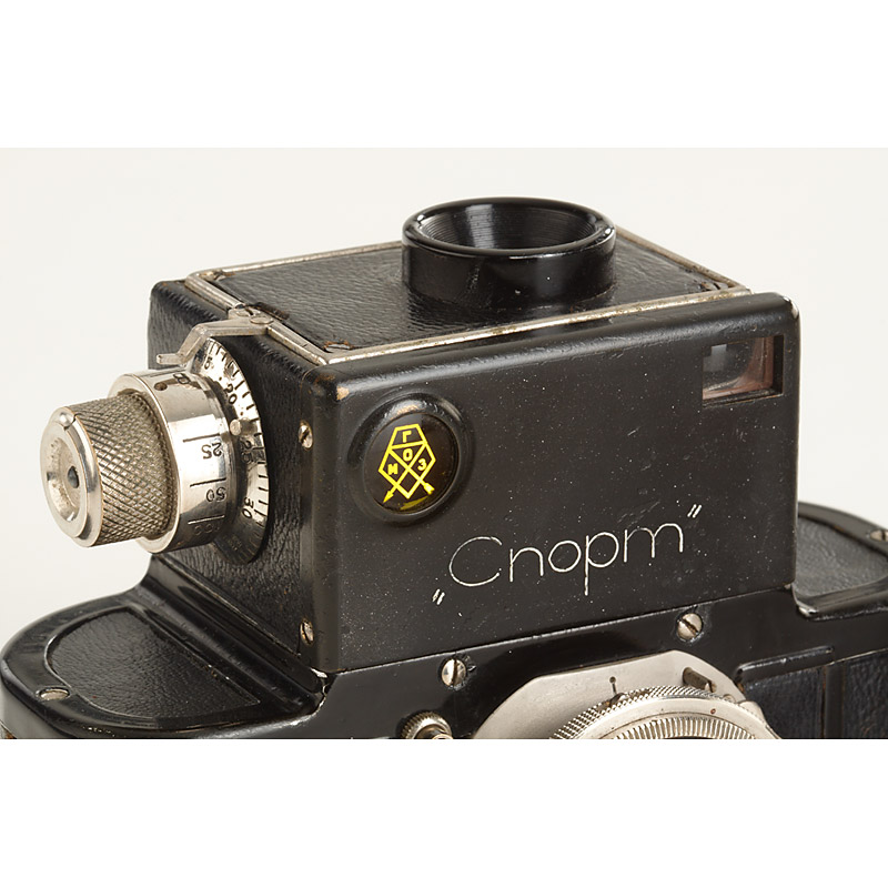 2nd type in very good condition with yellow logo and nickel fittings, both spools, shutter in working order, original case - the Russian Sport was one of the very first 35mm SLR cameras
