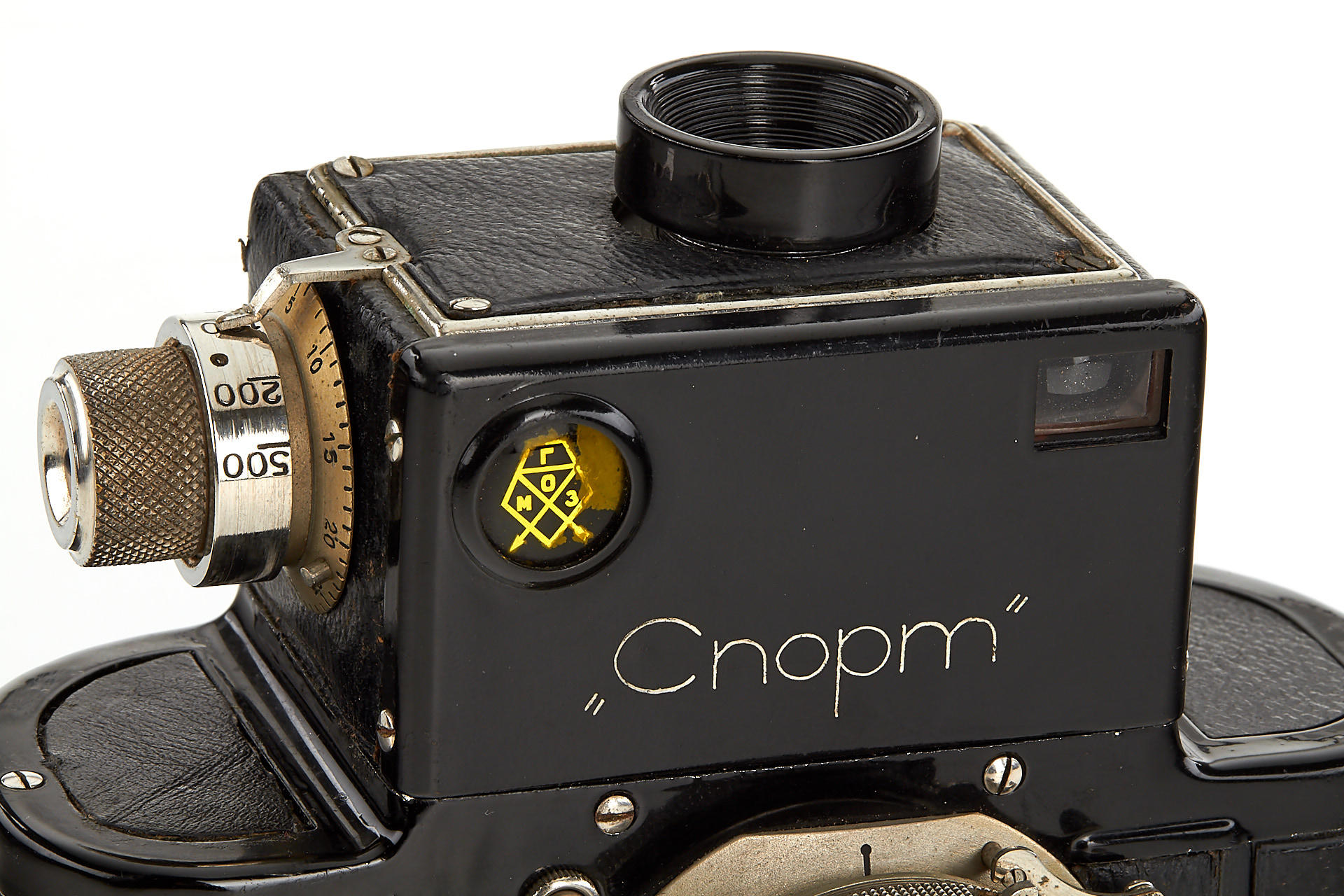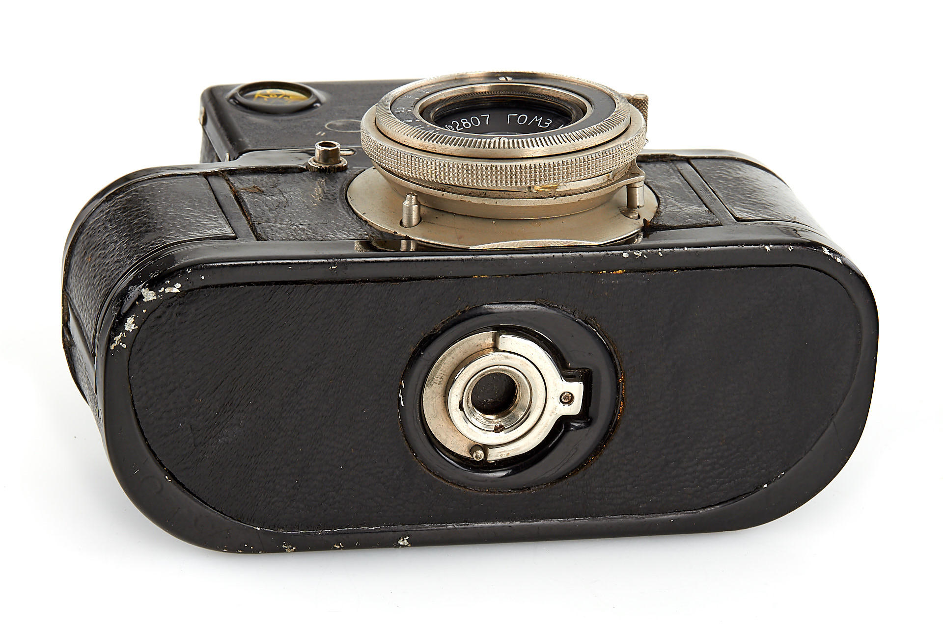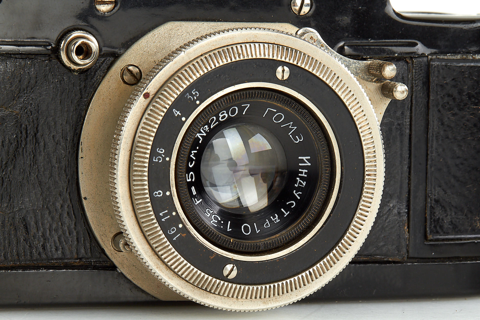 very early Russian 35mm SLR camera in fine condition, nickel fittings, Industar-10 3.5/5cm no.2087 in special mount, decent optics, in good working order, complete with a spool, maker's ever-ready case (worn) with second spool inside
