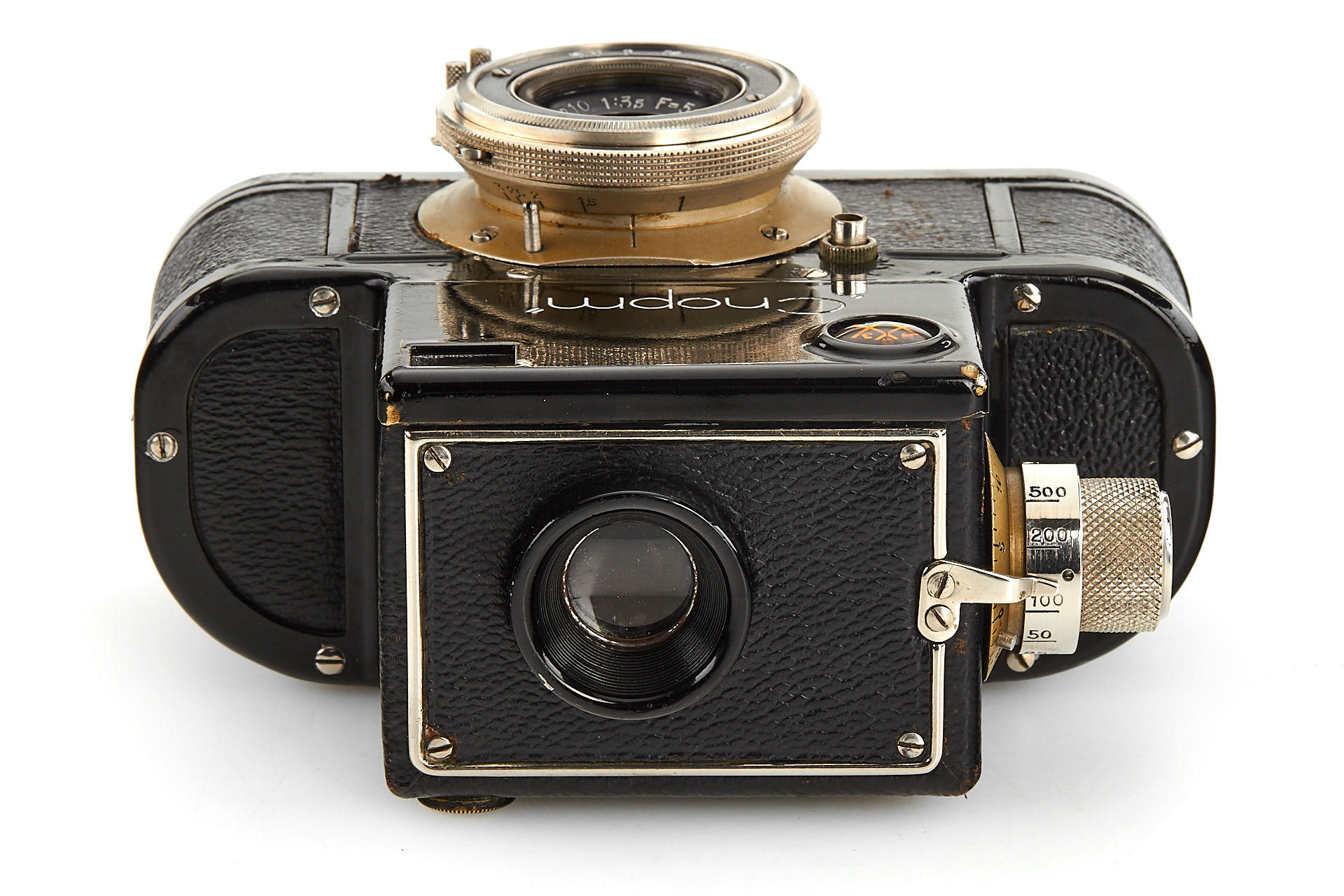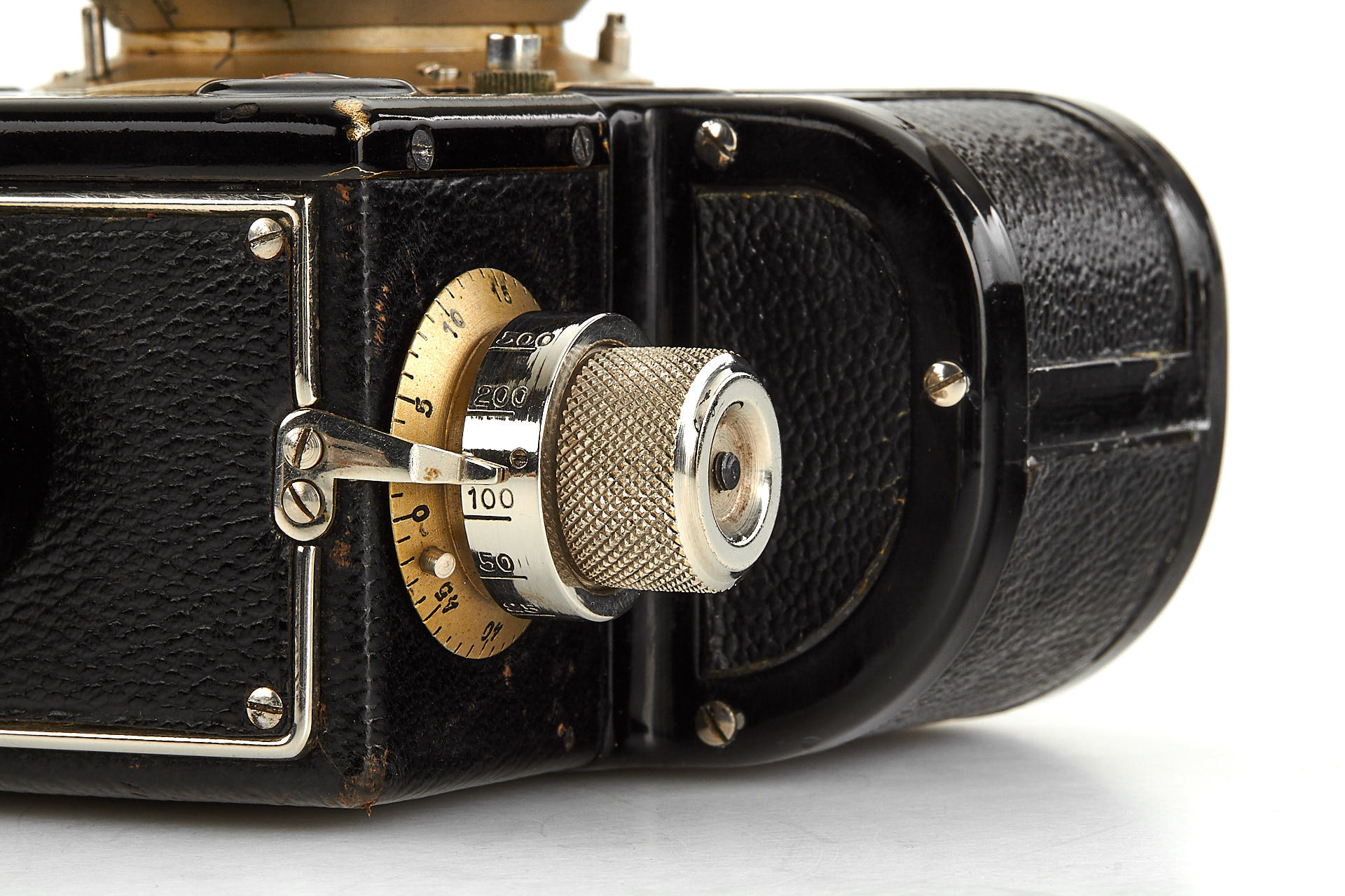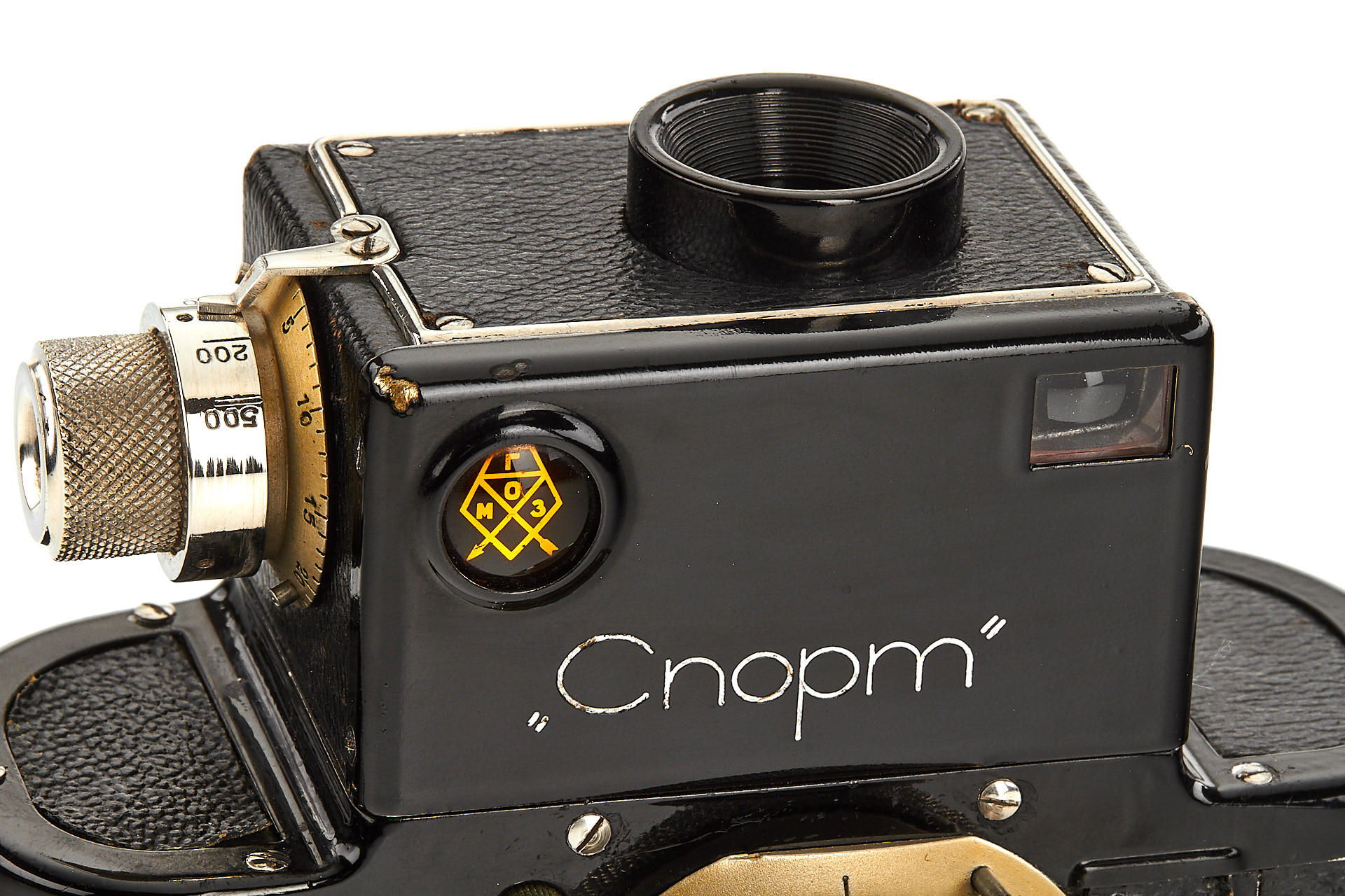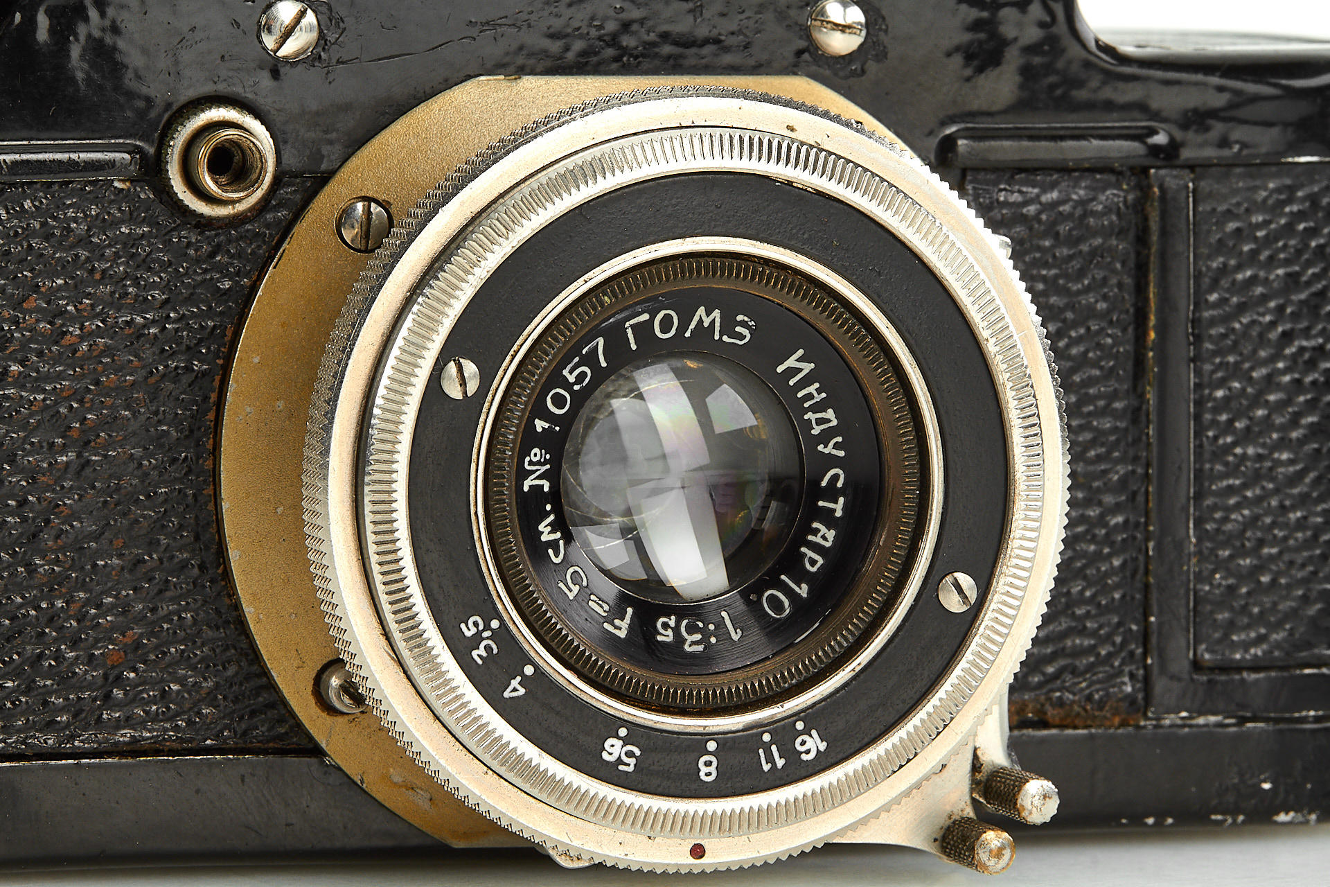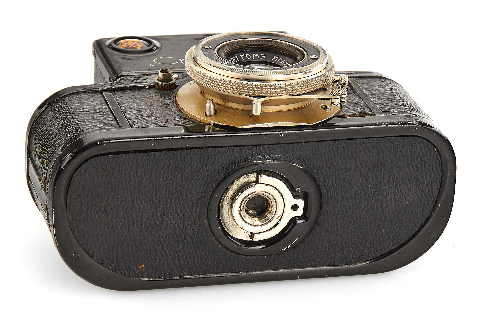 very early Russian 35mm SLR camera in good condition, nickel fittings, engraved in left spool chamber with'71', Industar-10 3.5/5cm no.1057 in special mount, decent optics, in good working order, complete with 2 spools and maker's ever-ready case