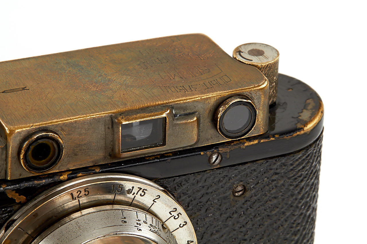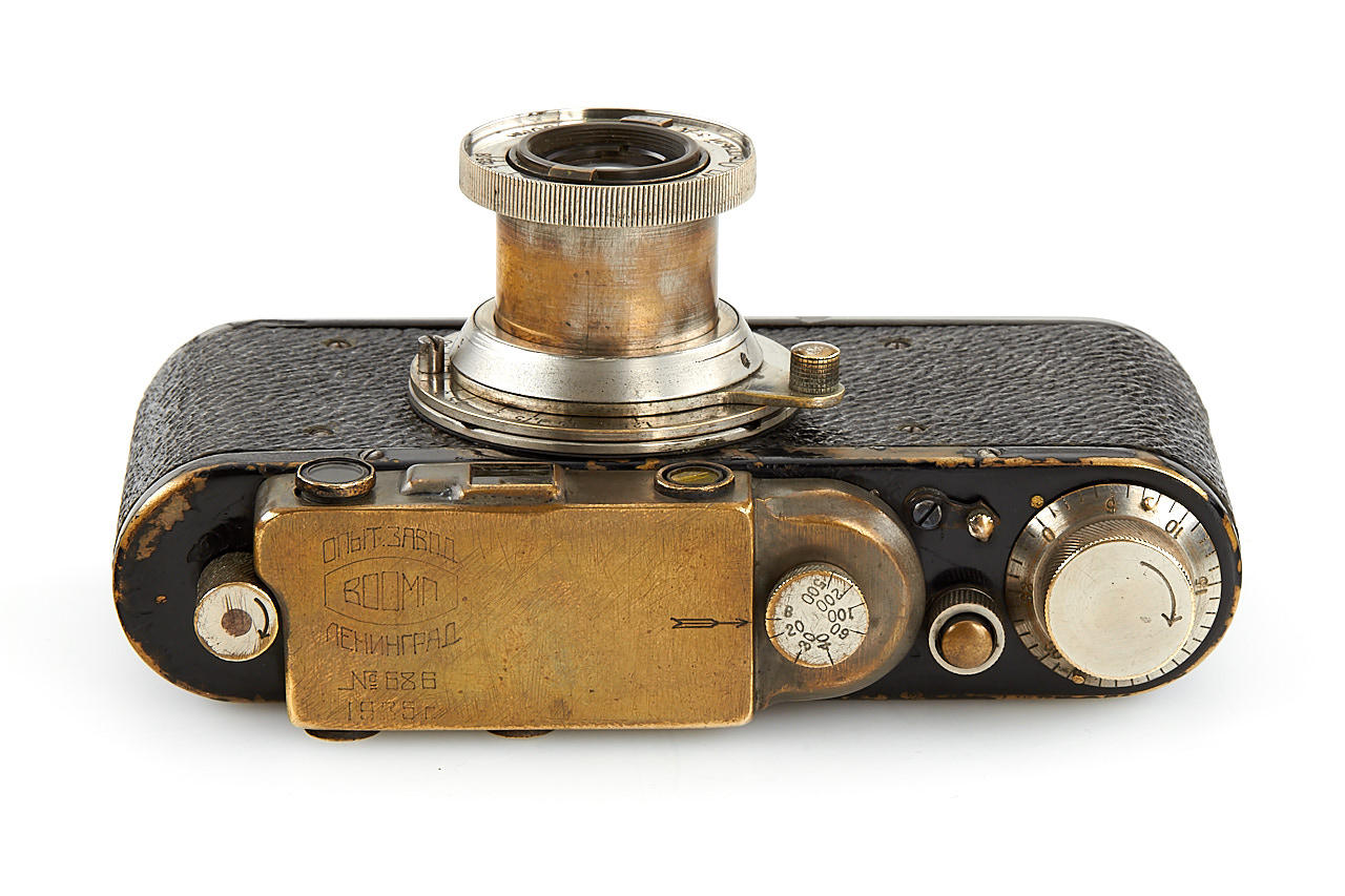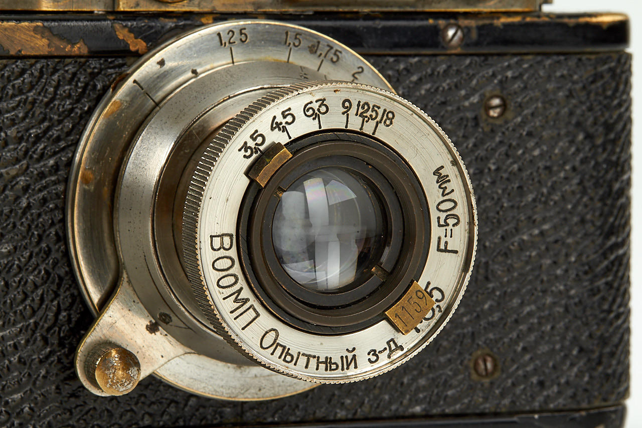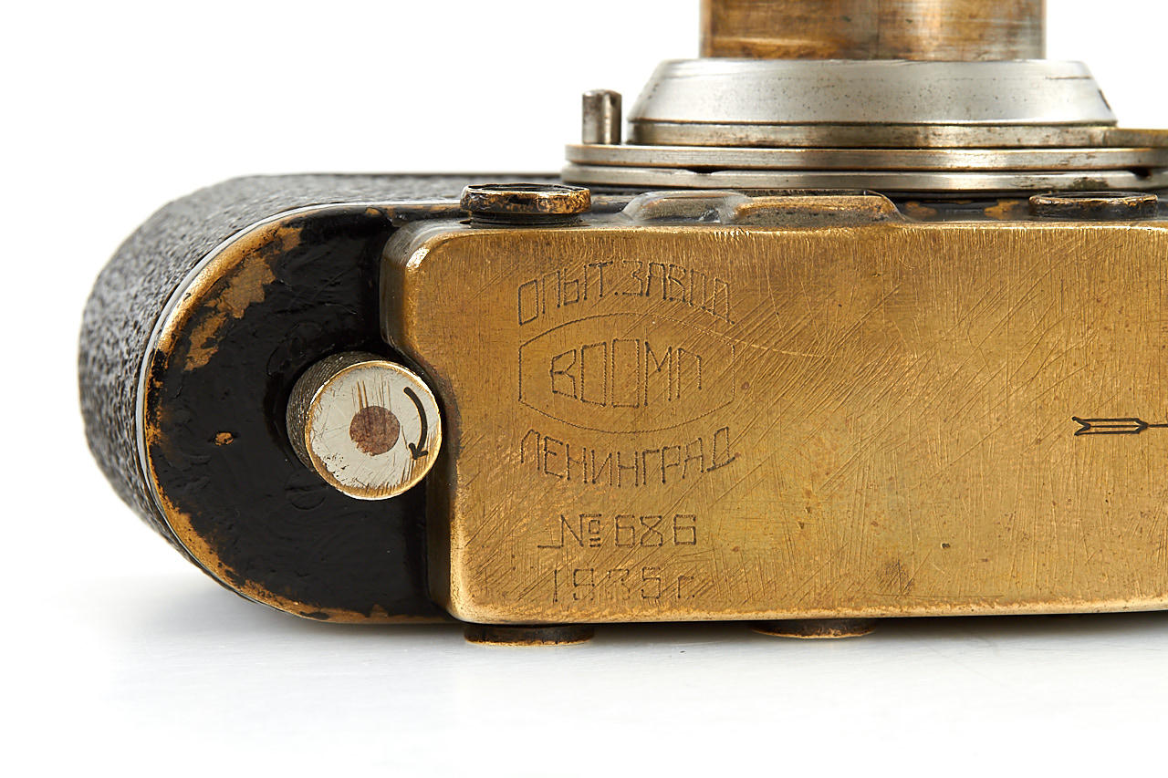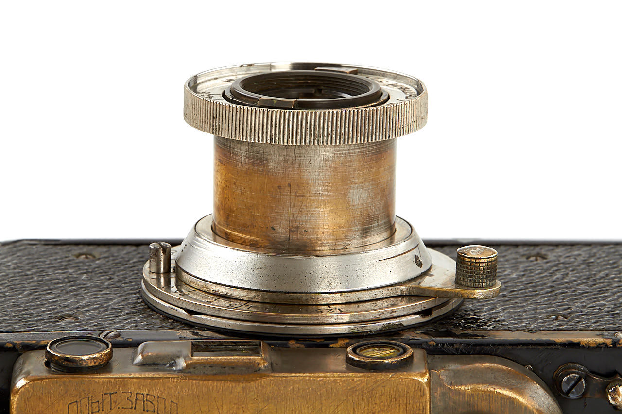 Very rare and well made Russian Leica II copy made by GOMZ. The camera was designed by Muratov in 1933 and only very few of them survived. With nickel VOOMP 3.5/50mm no.1159 (a Tessar copy in 40mm thread mount). In used condition, with all typical features like unique style of knobs, special Vulkanite etc., with unmarked leather case
