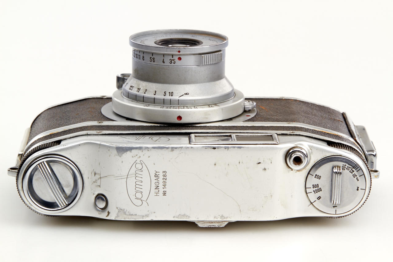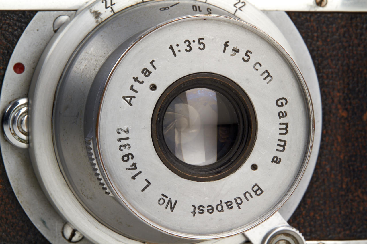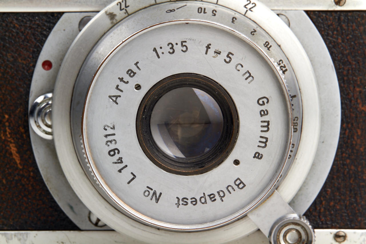 very rare and important Hungarian 35mm SLR with viewfinder, first camera to have a metal focal plane shutter and instant return mirror, in good and original condition, working (!) shutter, Artar 3.5/5cm no.L149312