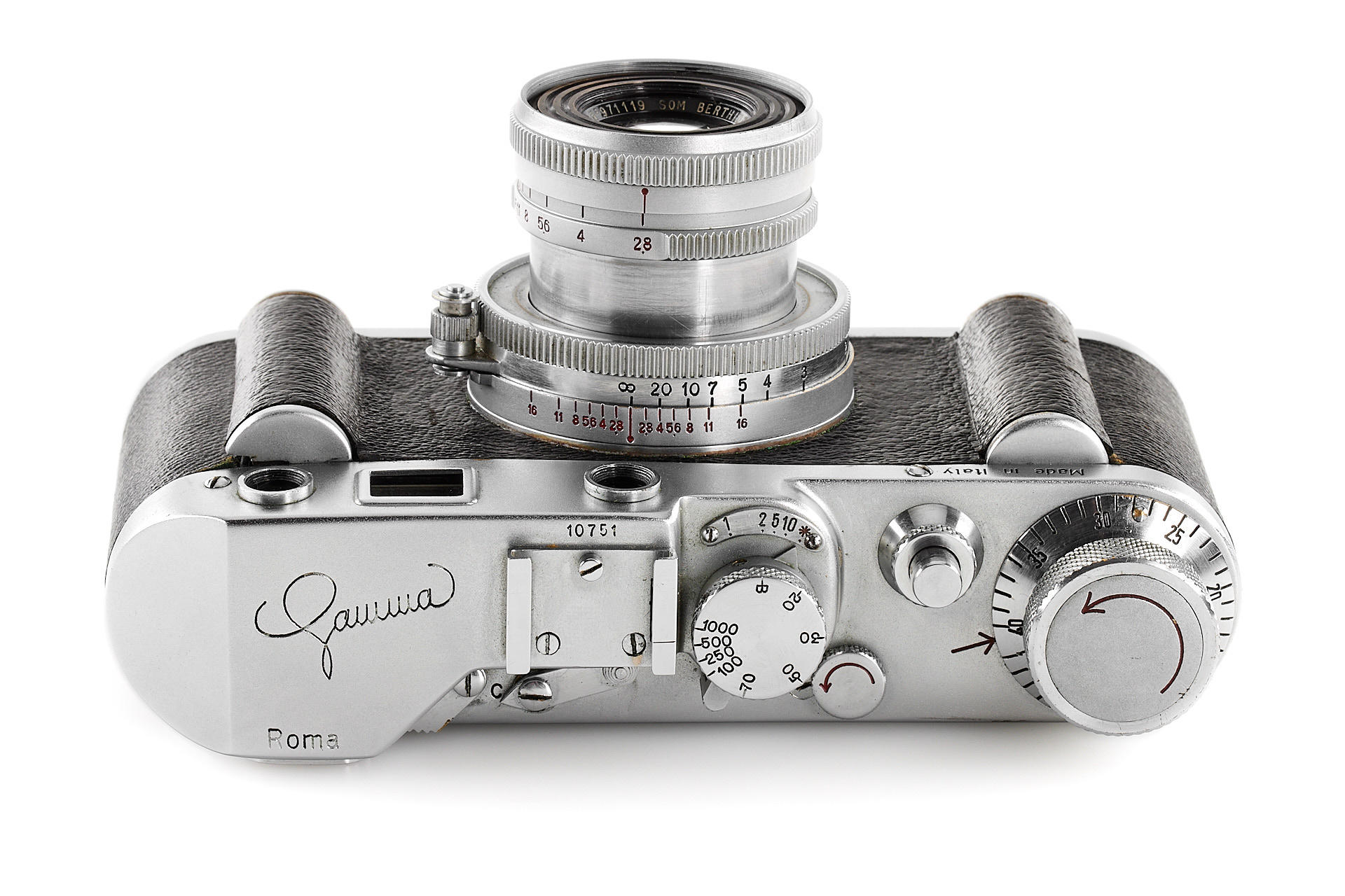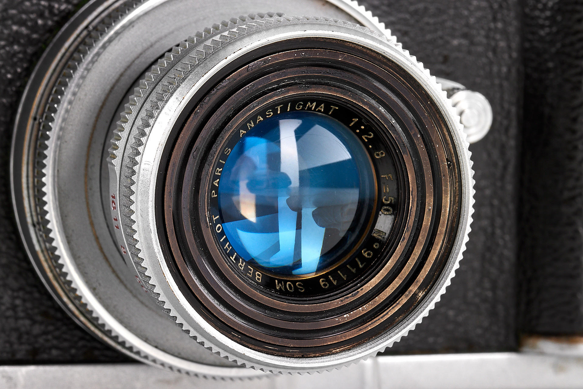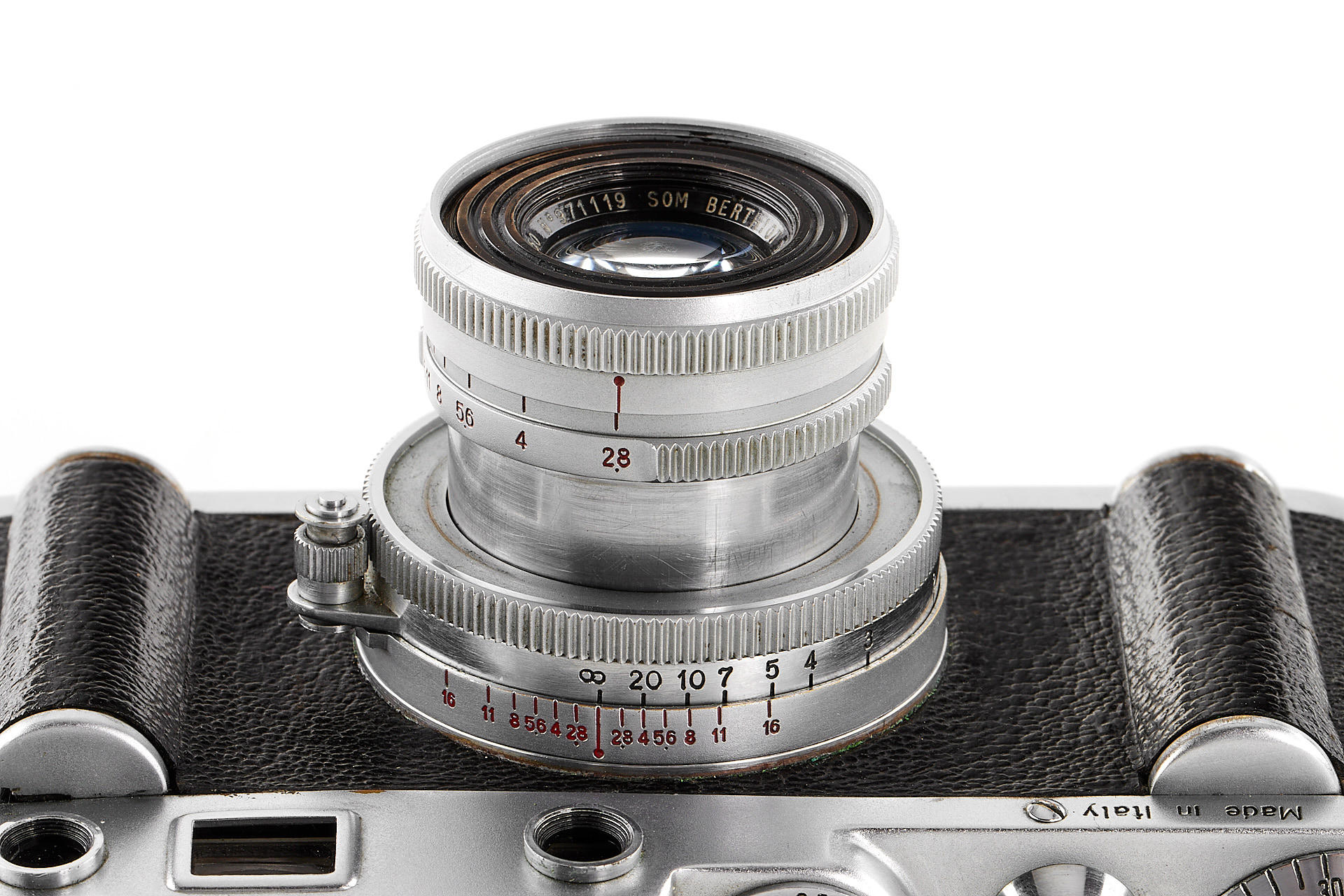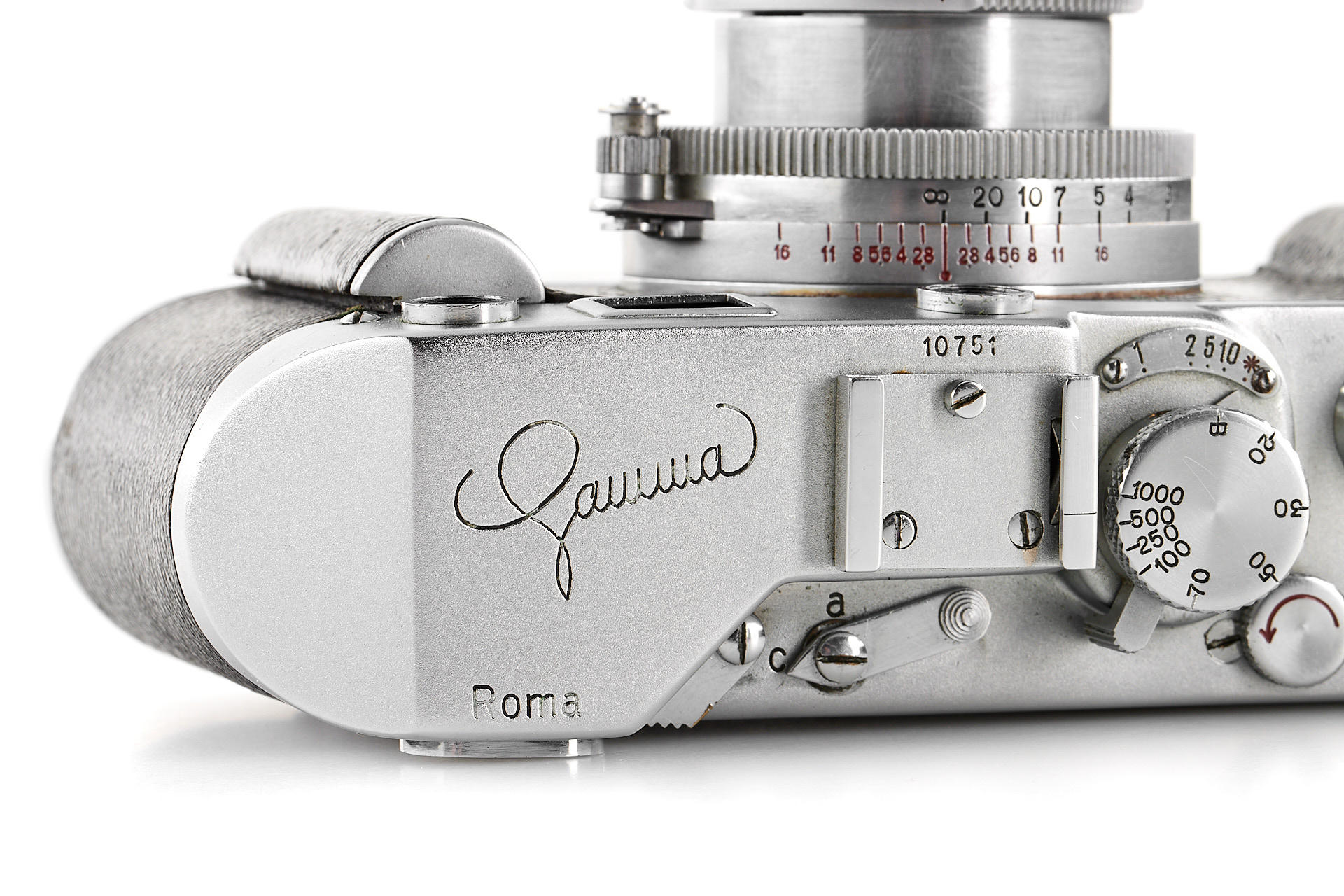 rare Italian Leica copy with M39 screw mount, here in beautiful, near mint condition and working order, rangefinder with low contrast, with very rare coated Som Berthiot Anastigmat 2.8/50mm no.971119, showing some cleaning marks on the front element, note the 'GAMMA' engraved on the barrel