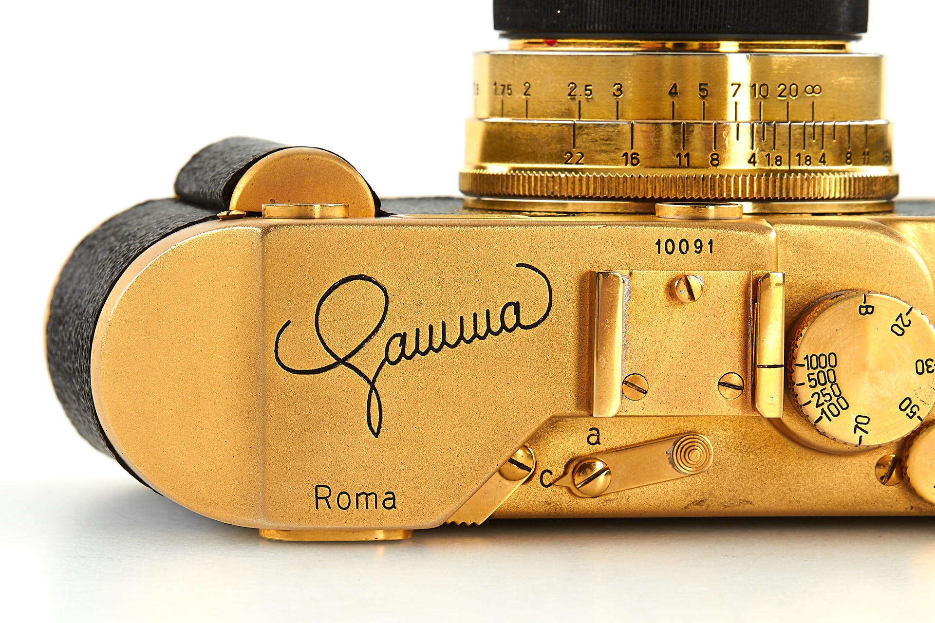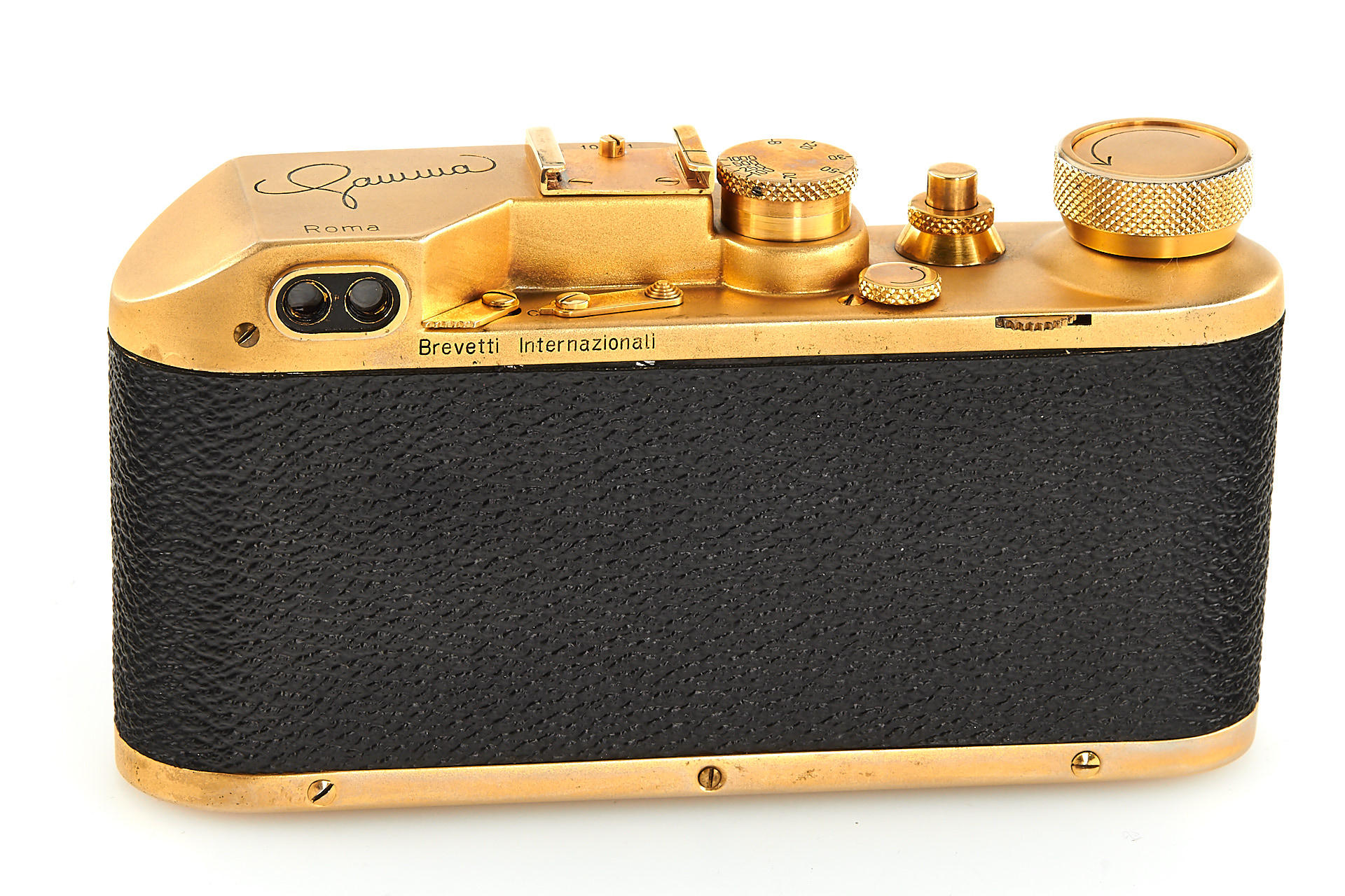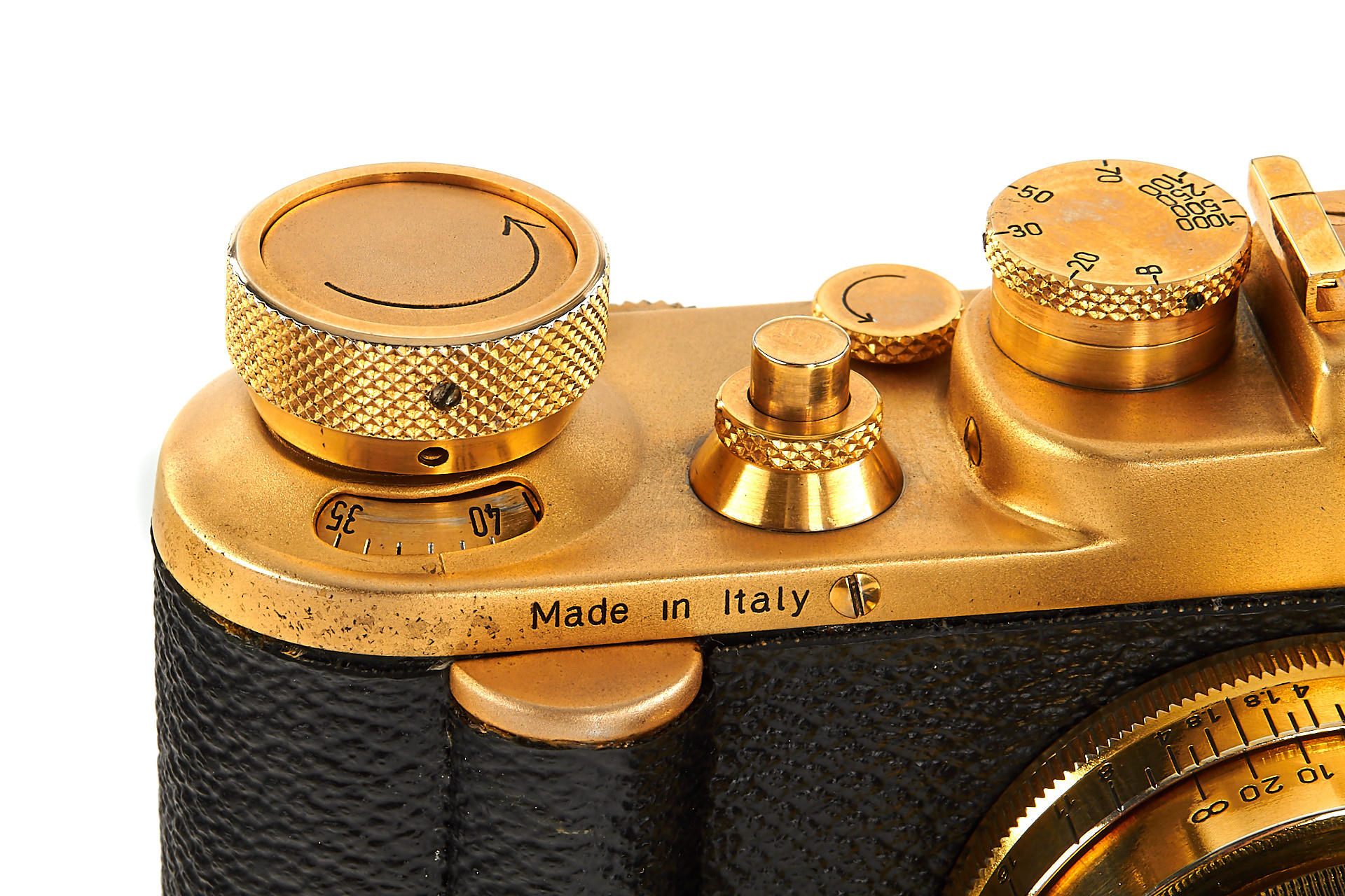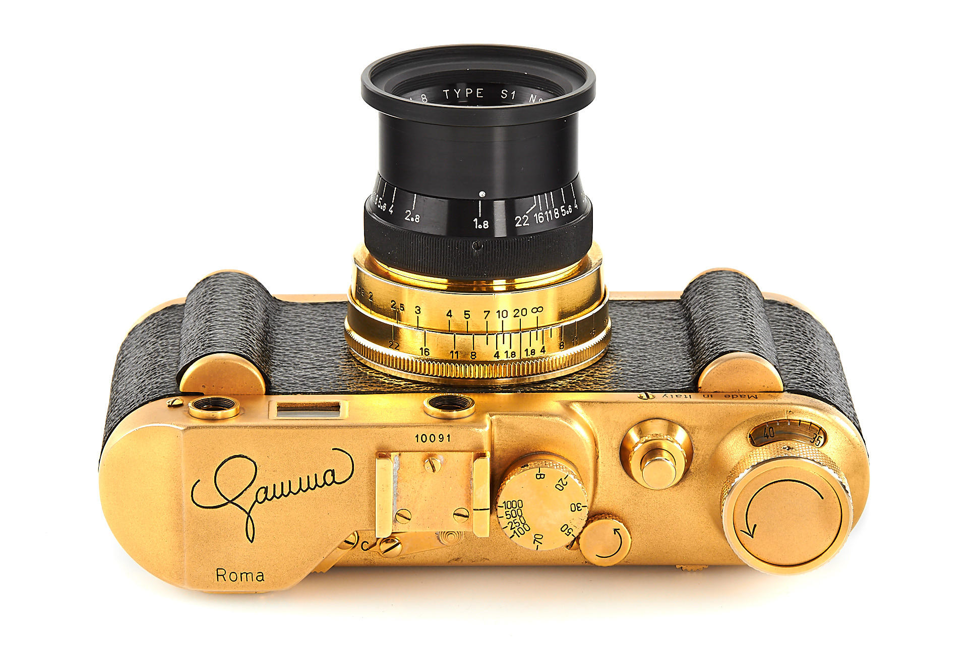 Italian Leica copy in very fine and working condition, later gold plating of the camera and lens mount, with sought-after Angenieux Type S1 1.8/50mm no.160772 (very good, clean optics)