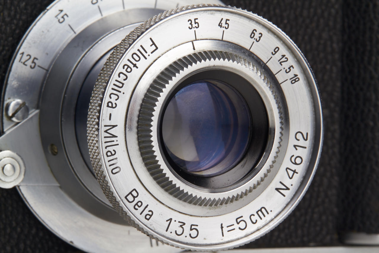 Italian Leica copy in very fine and working condition, very early number with matching screw mount Filotecnica-Milano Bela 3.5/5cm no.4612