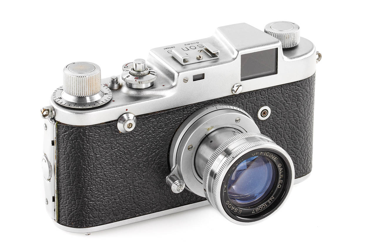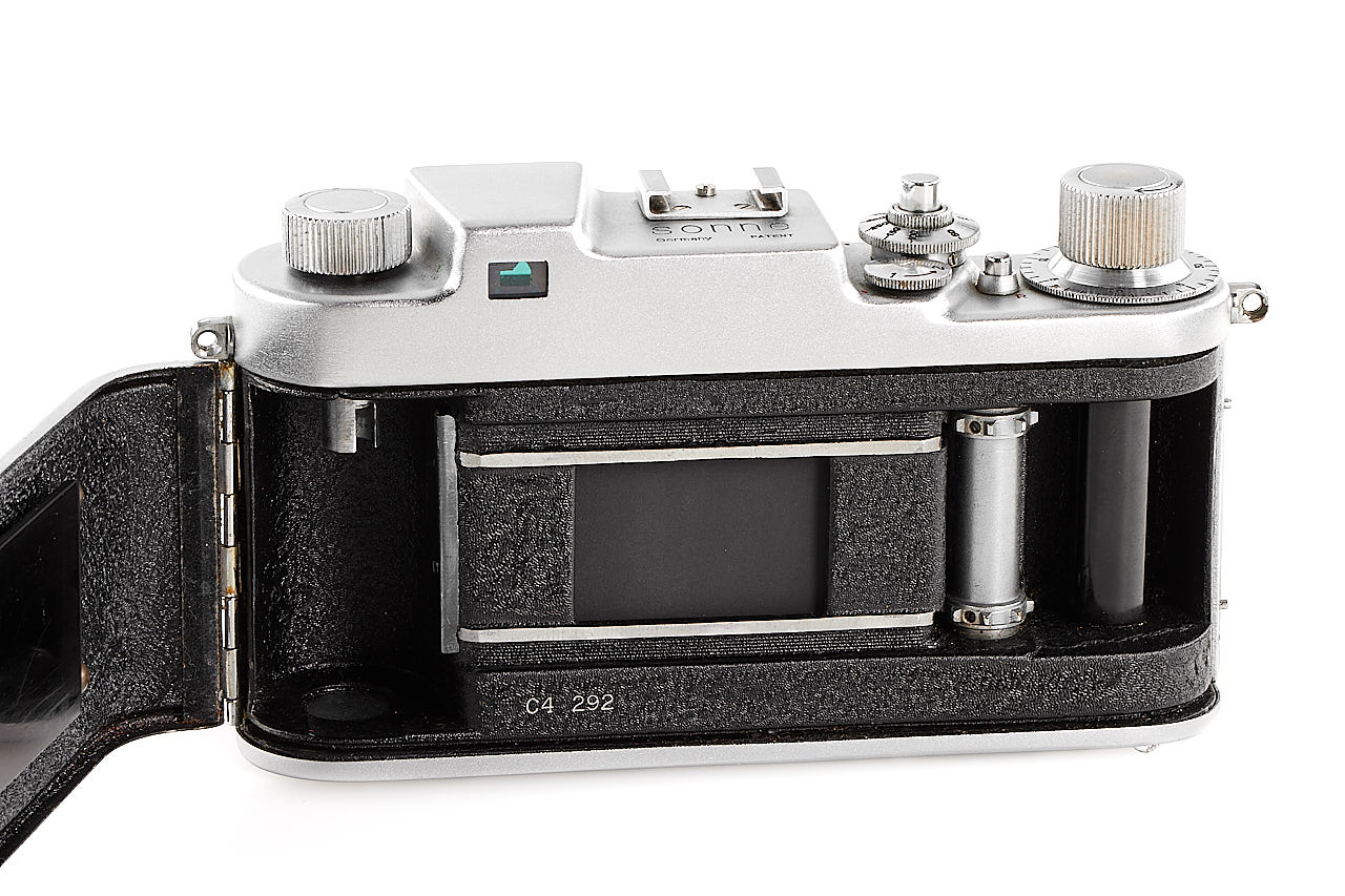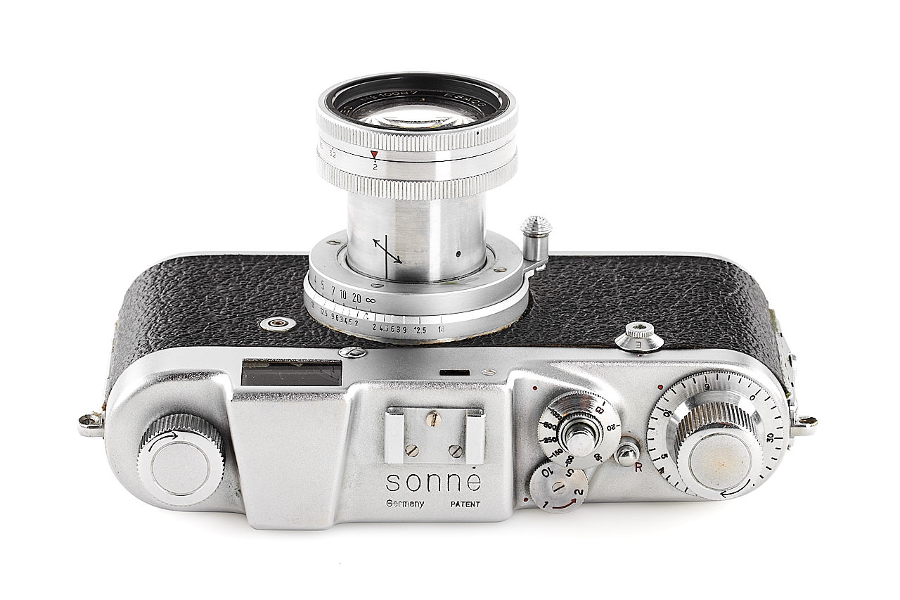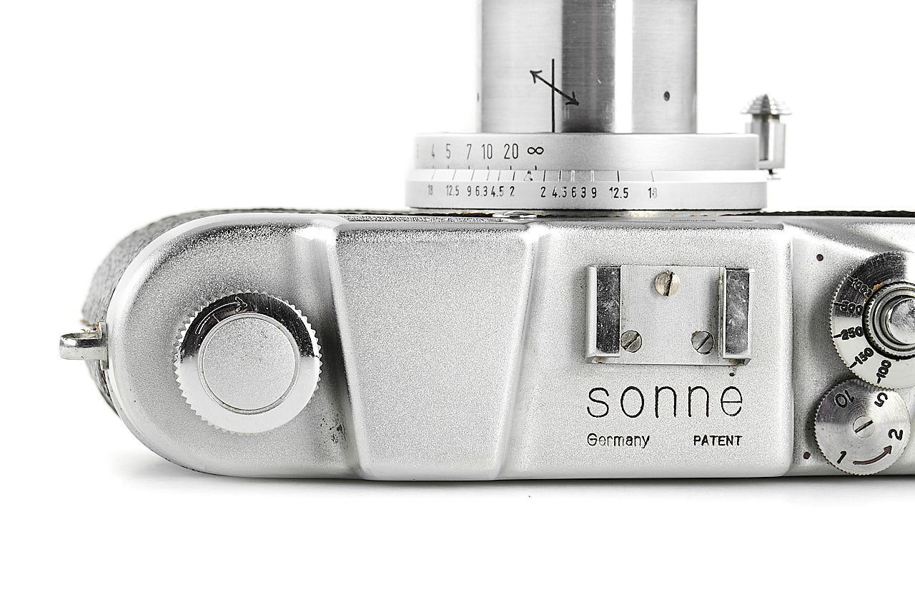 Rare and very late Italian Leica copy, for rangefinder coupled M39 lenses, 'SONNE Germany PATENT' graved on the top plate, in very good condition and working order, some signs of corrosion can be seen on the back side, with rare fast collapsible ESAOG 2/5cm no.10087, coated optics showing cleaning marks on the front element, with third party yellow filter/hood and original leather case (front part removed).