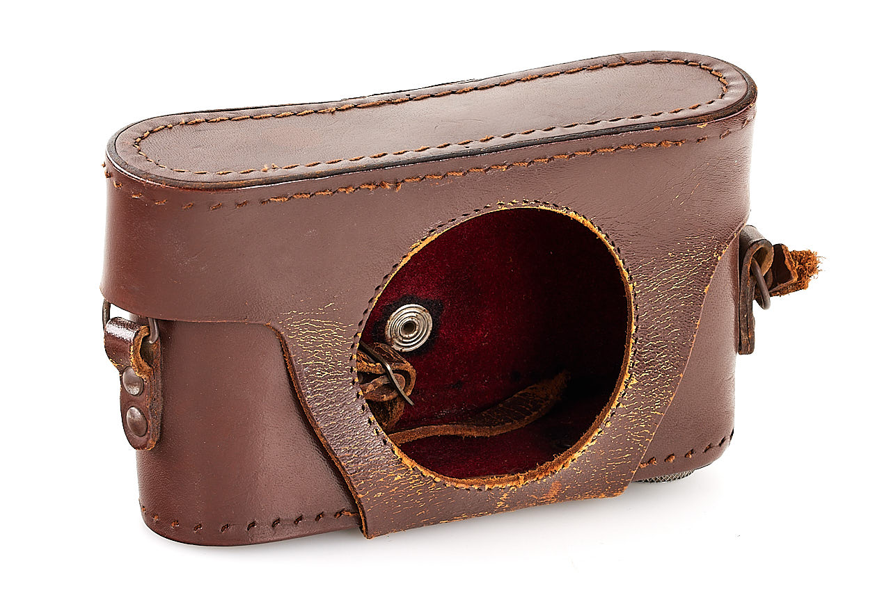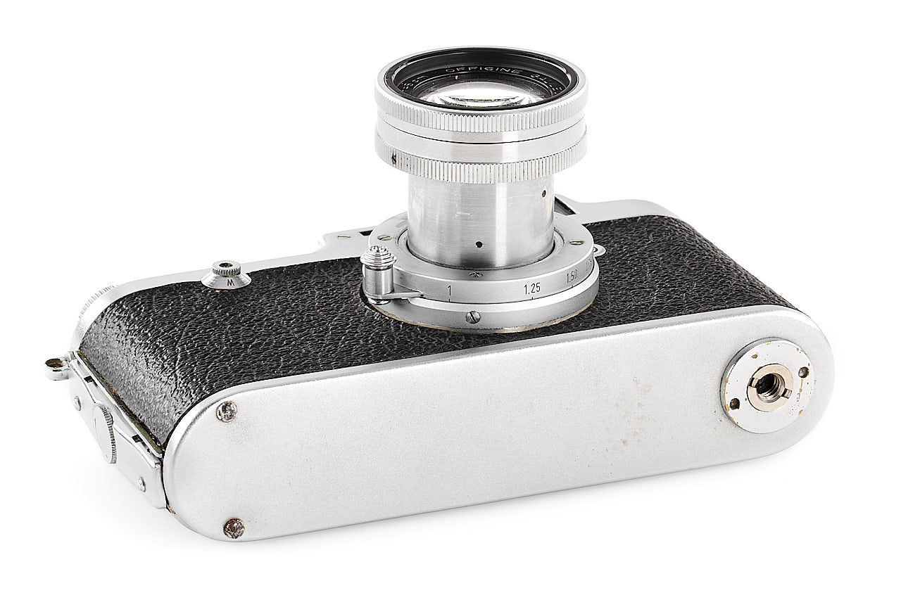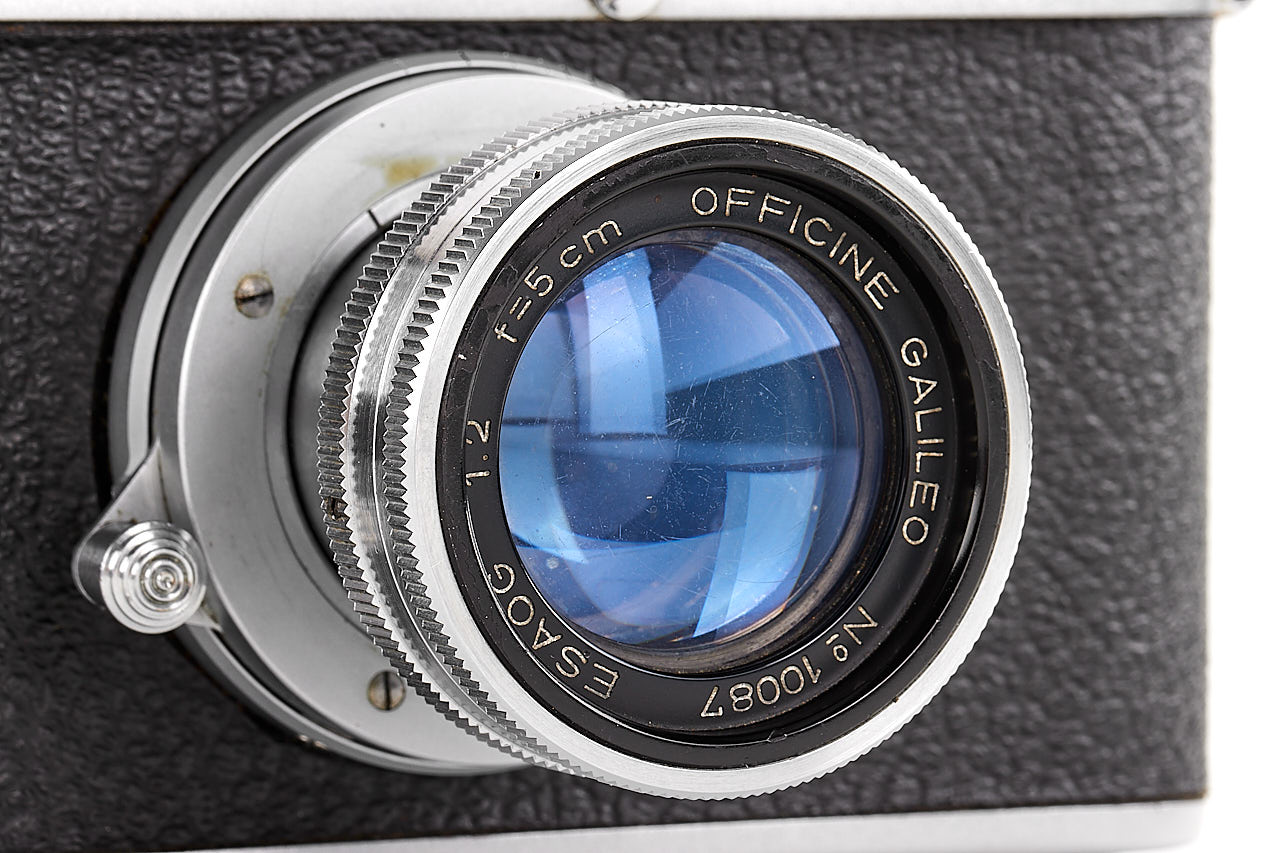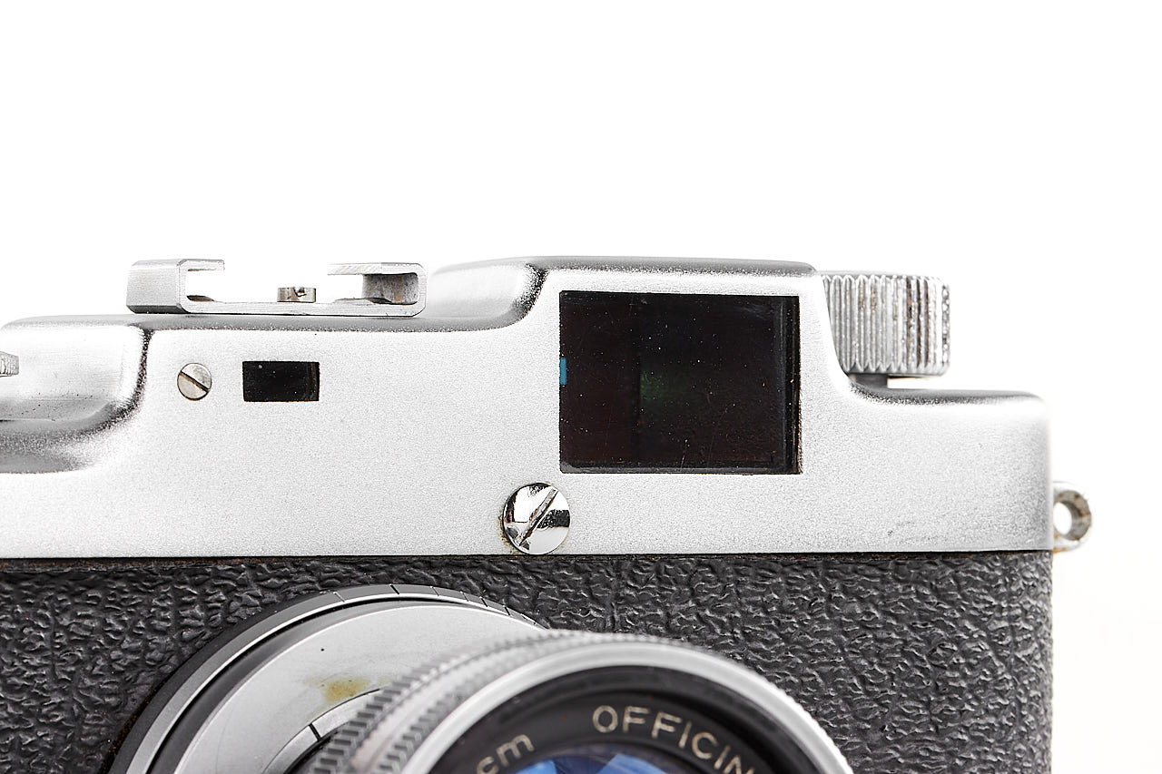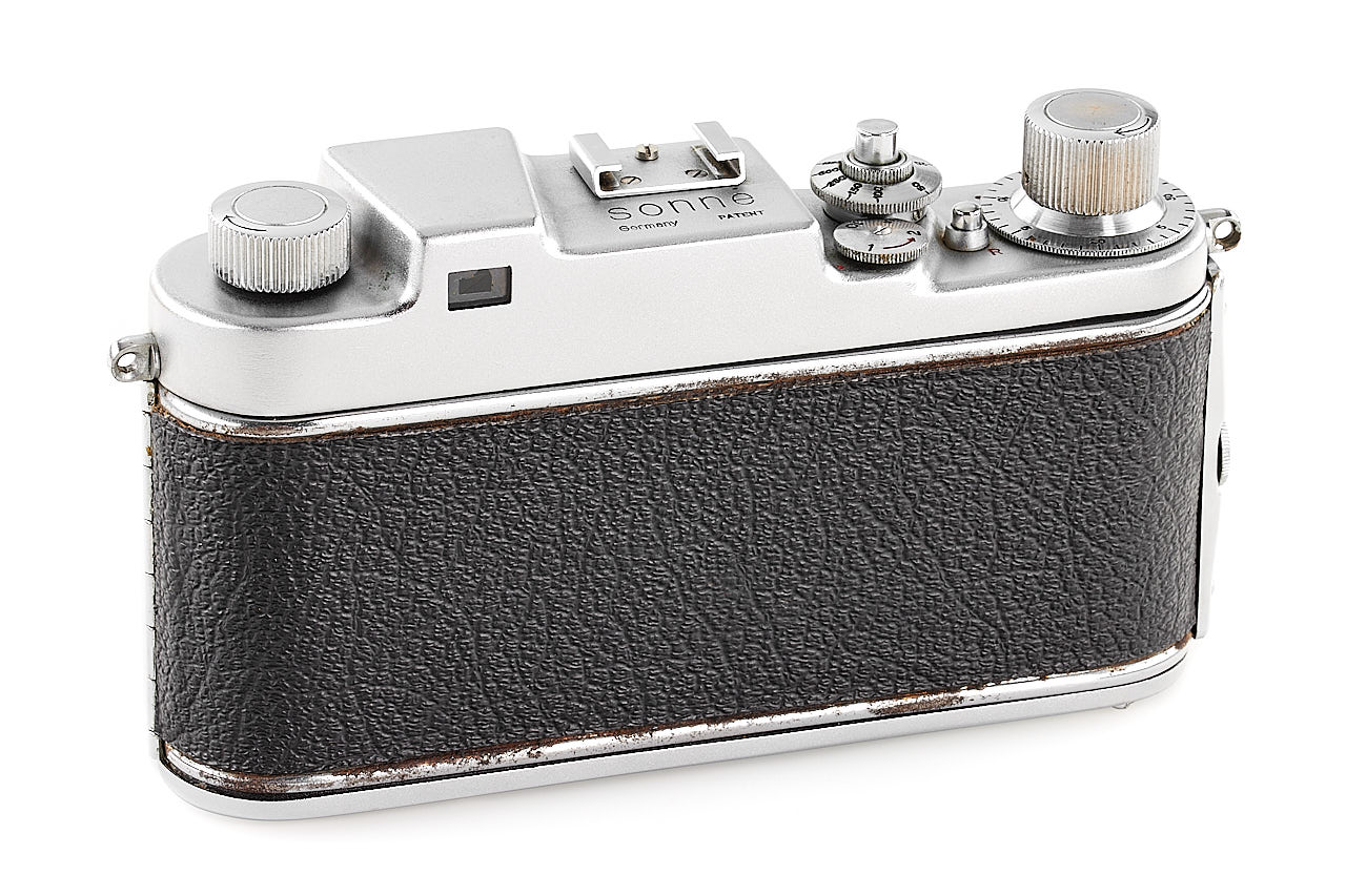 Rare and very late Italian Leica copy, for rangefinder coupled M39 lenses, 'SONNE Germany PATENT' graved on the top plate, in very good condition and working order, some signs of corrosion can be seen on the back side, with rare fast collapsible ESAOG 2/5cm no.10087, coated optics showing cleaning marks on the front element, with third party yellow filter/hood and original leather case (front part removed).