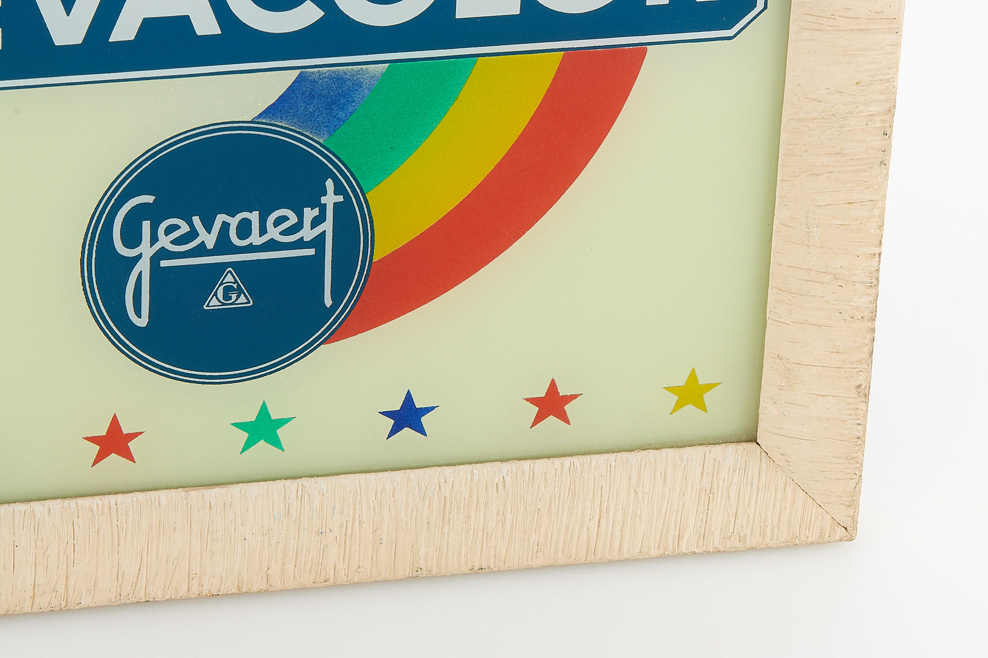 Very nice Gevacolor (Gevaert) advertising wall lamp in very good condition, made of glass and metal in wooden frame (not tested)