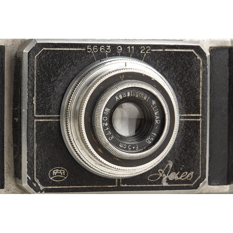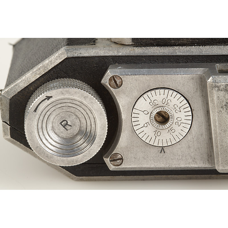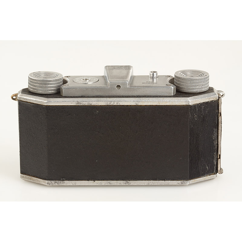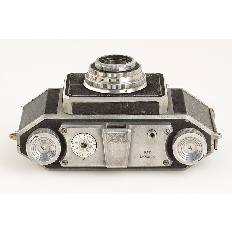 extremely rare Italian stainless light alloy prototype 35mm camera for 24x36mm and 18x24mm exposures, Anastigmat Elinar 5.6/5cm no.02173, metal guillotine shutter, 'patent no.25025' engraved on top plate, the standard version was only delivered with f/4.5 lenses
