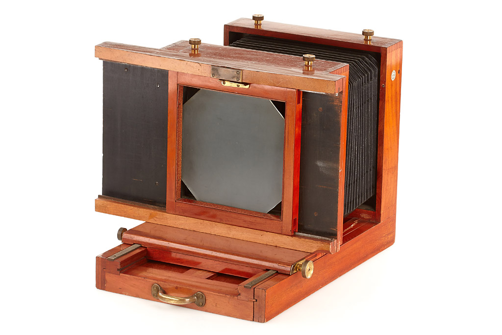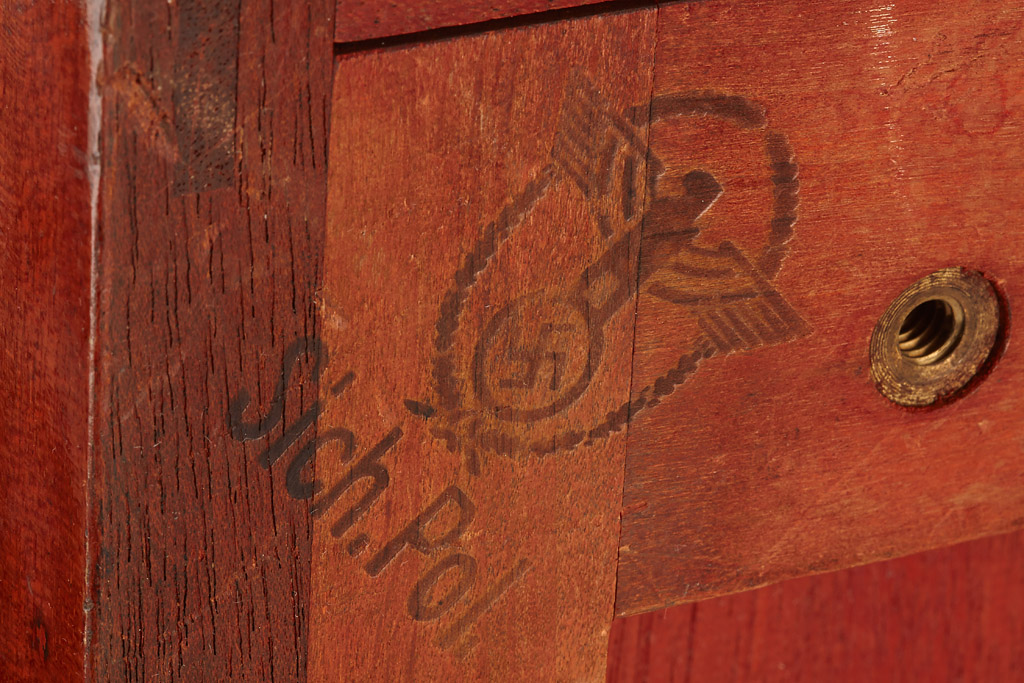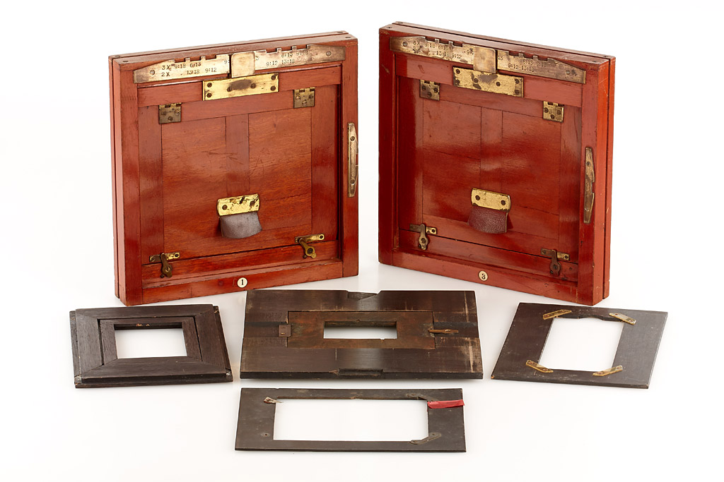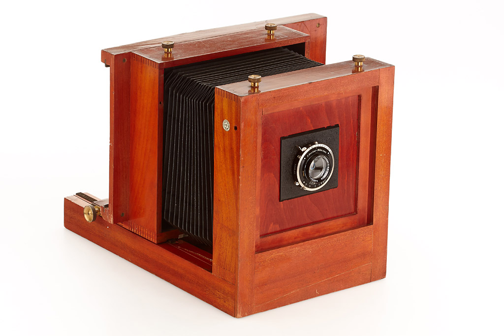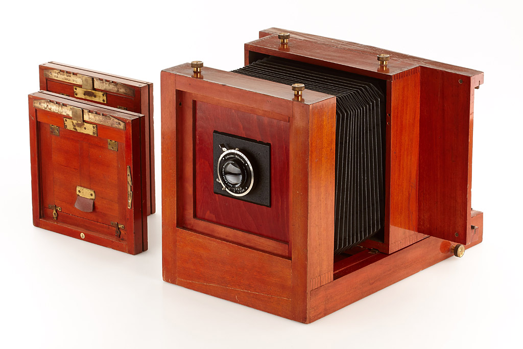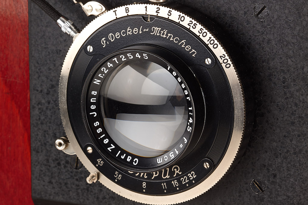 13x18cm, beautiful designed wooden studio camera (Neue Görlitzer Camera-Werke), with black bellows, brass fittings, on base stamped with Reichsadler, Hakenkreuz and 'Sich. Pol.' (Gestapo), Tessar 4.5/15cm no.2472545 in good working Compur shutter (caps), sliding focusing ground glass, two original platefilm holders with brass plates to adjust the camera for various exposure sizes (9x12, 6x13 9x18 or 13x18), various inserts for both holders