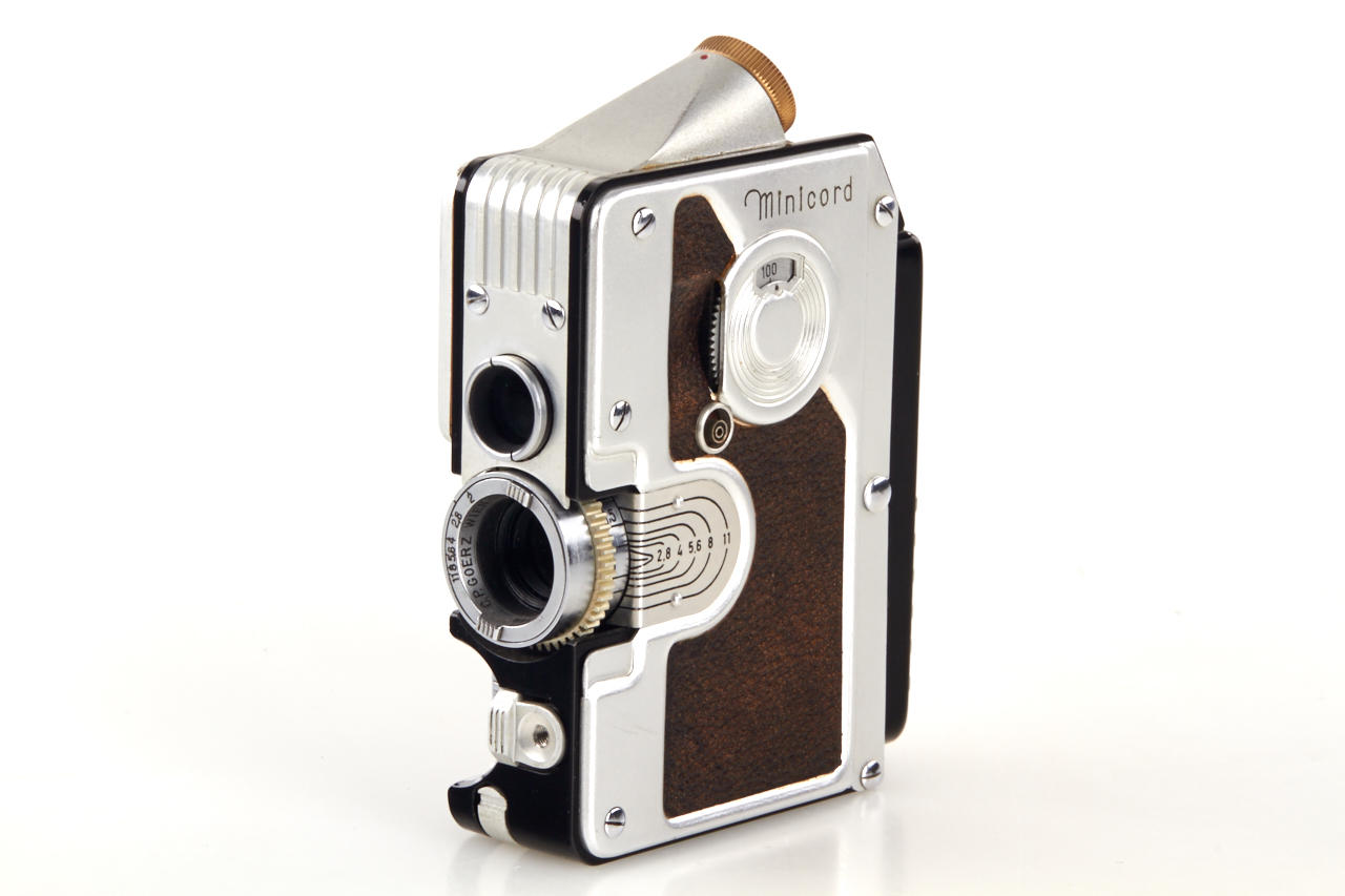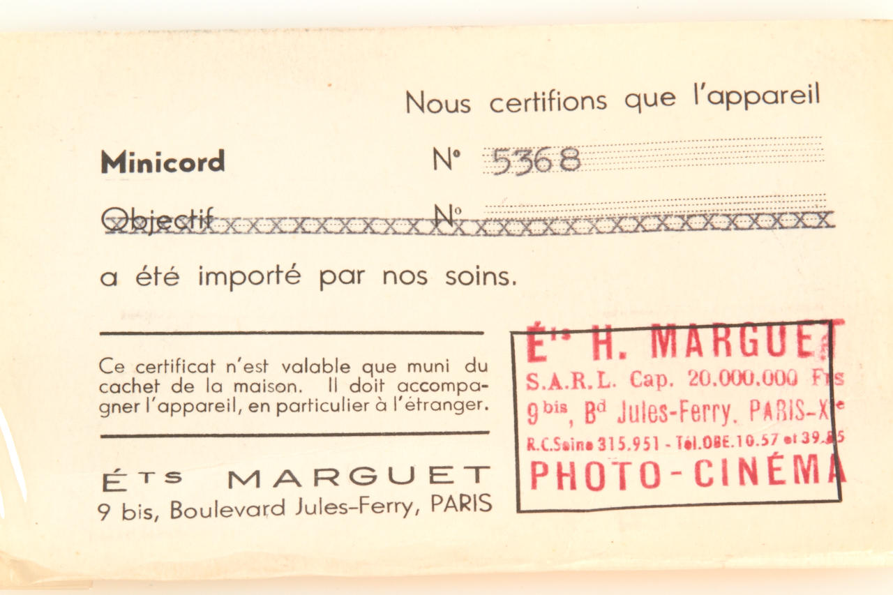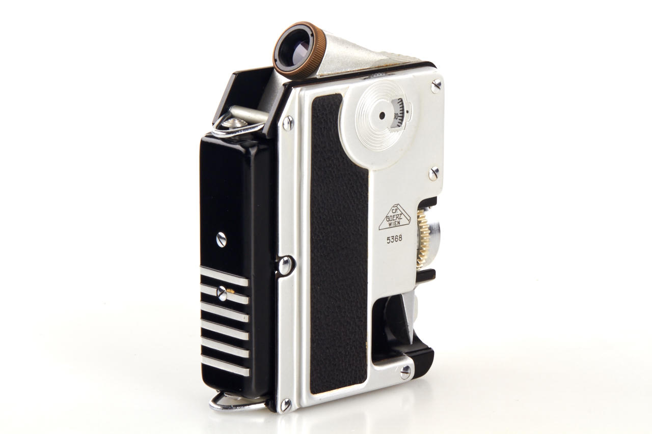 first chrome version with black leather covering in near mint and working condition, with matching maker's box, complete French papers, tripod adapter, three sealed films, two take up spools (one sealed), a set of slide film frames