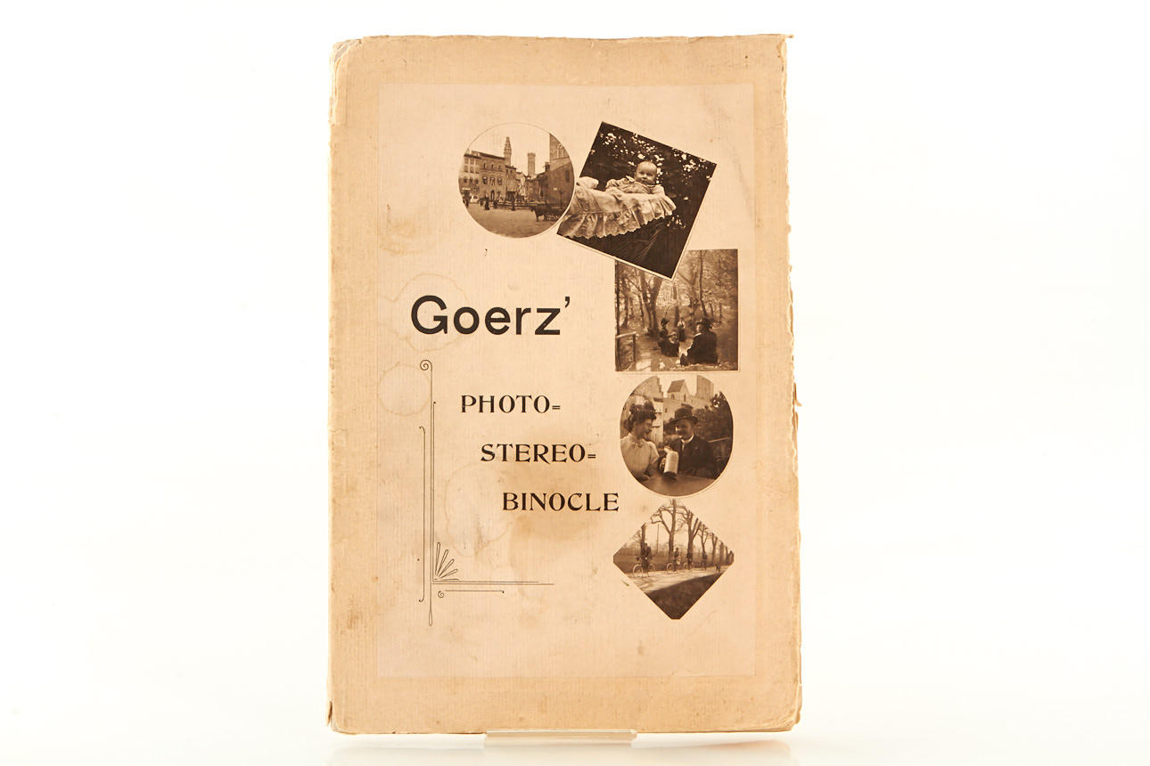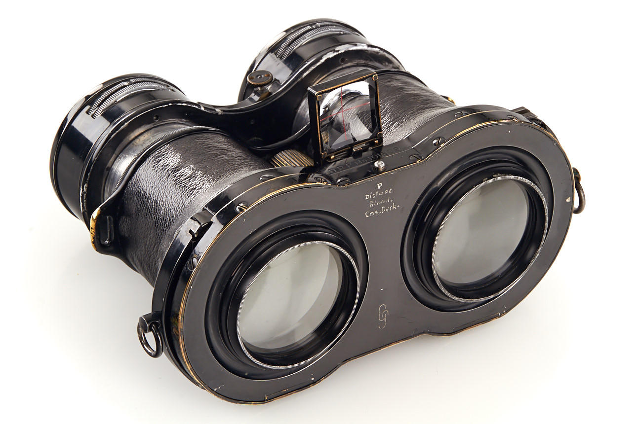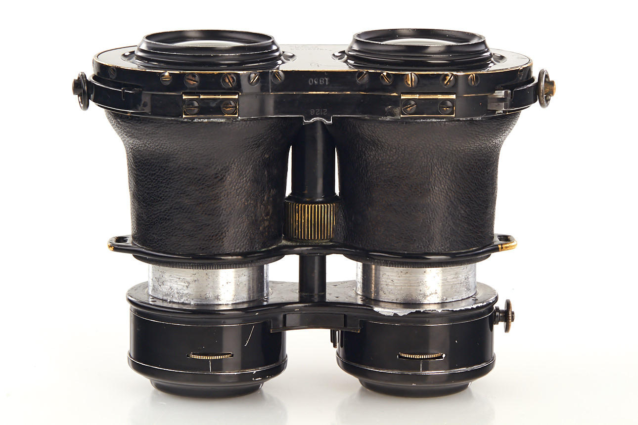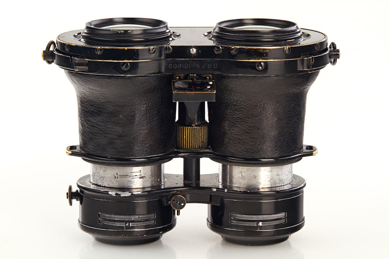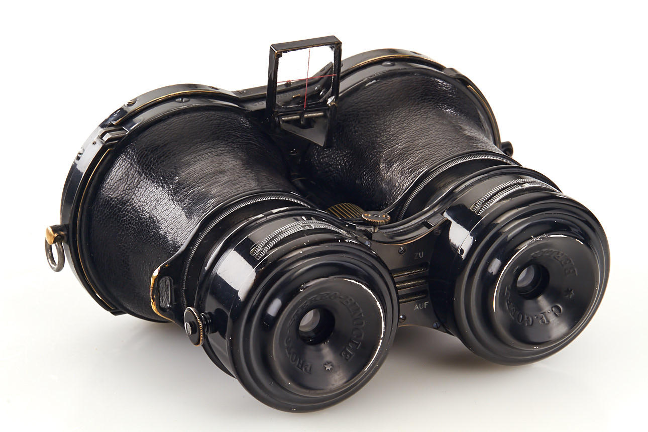 binocular detective camera for 45x50mm stereo exposures, Doppel-Anastigmat 75mm lenses nos.107716/85795, guillotine shutter, Newton finder - the camera can be used as a camera or as binoculars, in beautiful original condition with extremely rare booklet (60 pages) 'Goerz' PHOTO-STEREO-BINOCLE' and original black carrying leather case