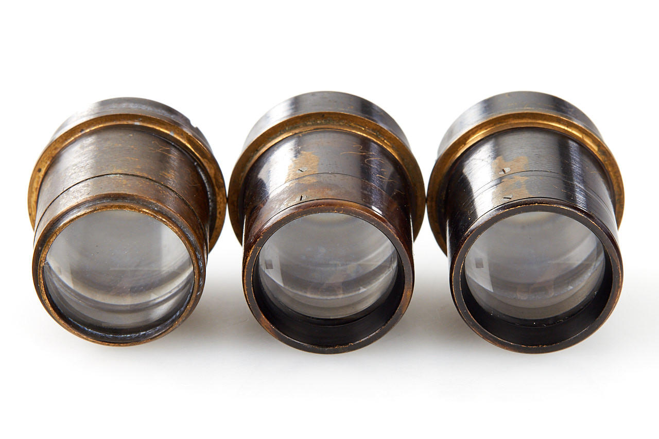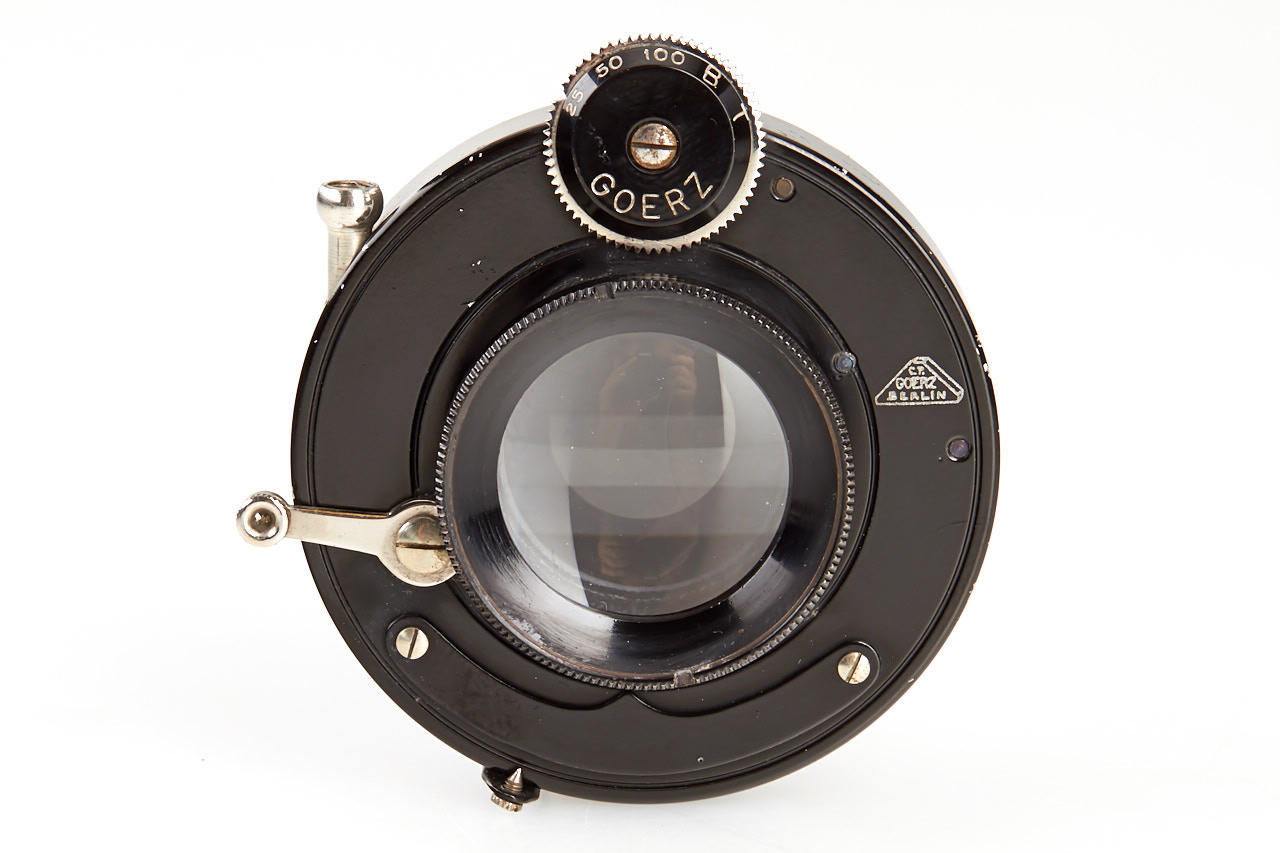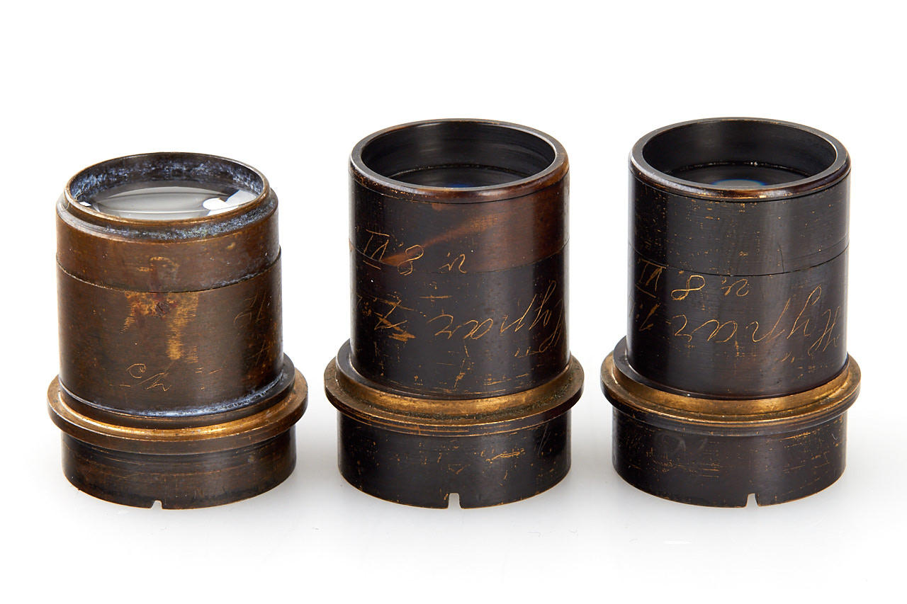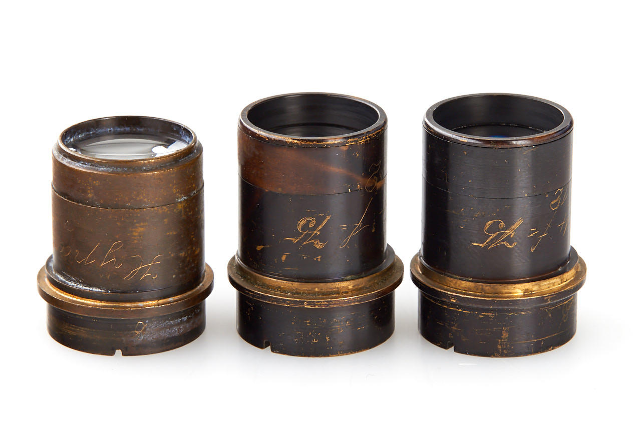 lot of five early Goerz prototype lenses: (1) Tessaxiar 6.8/13.5cm in Goerz shutter (no markings except for the shutter, inventory tag), (2) Celor 4.5/60mm (lens head without diaphragm, hand-engraved with lens name and date 11.III.08), (3-5) three Hypar 4/75mm (all hand-engraved with lens name, dated 8.VI.12)
