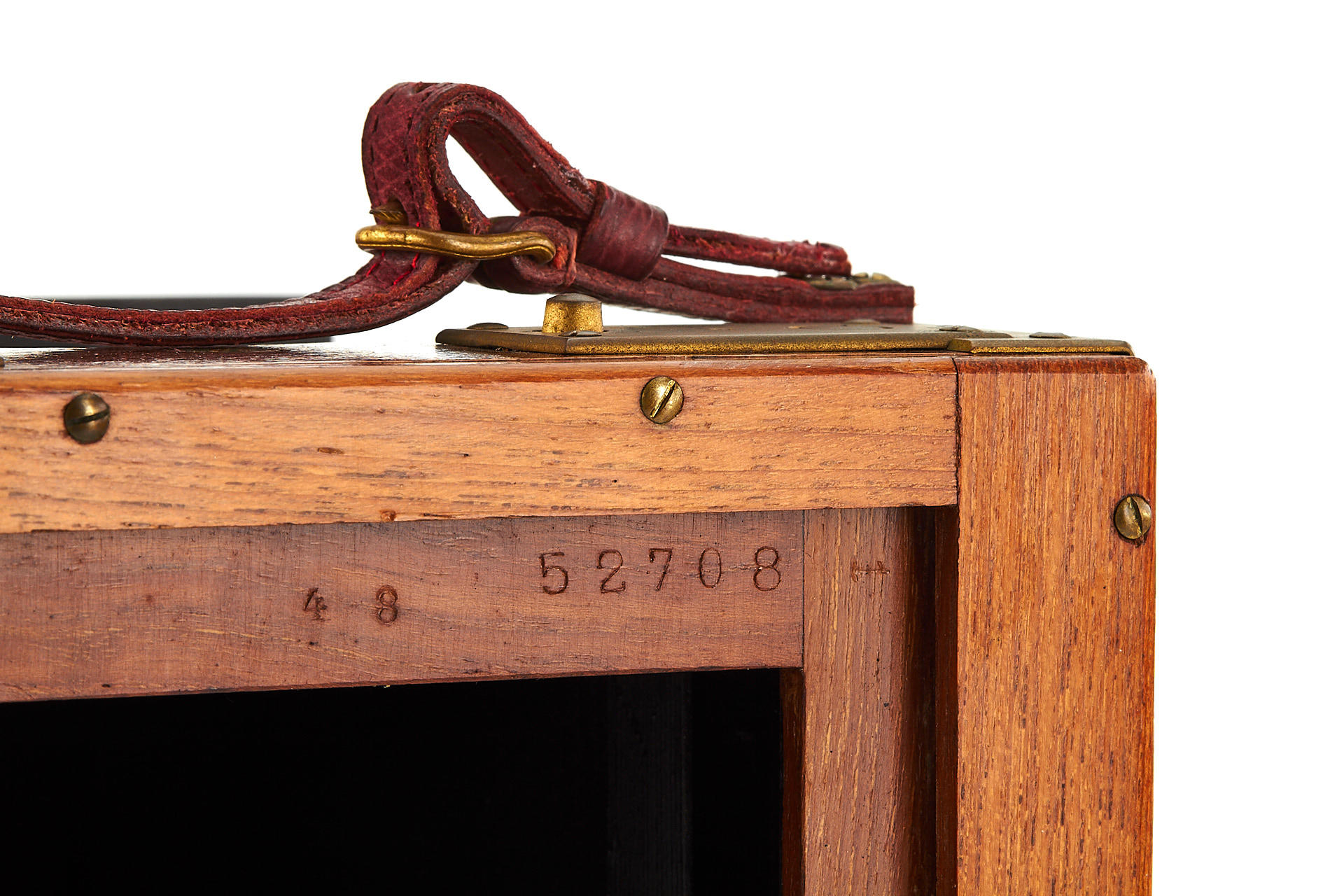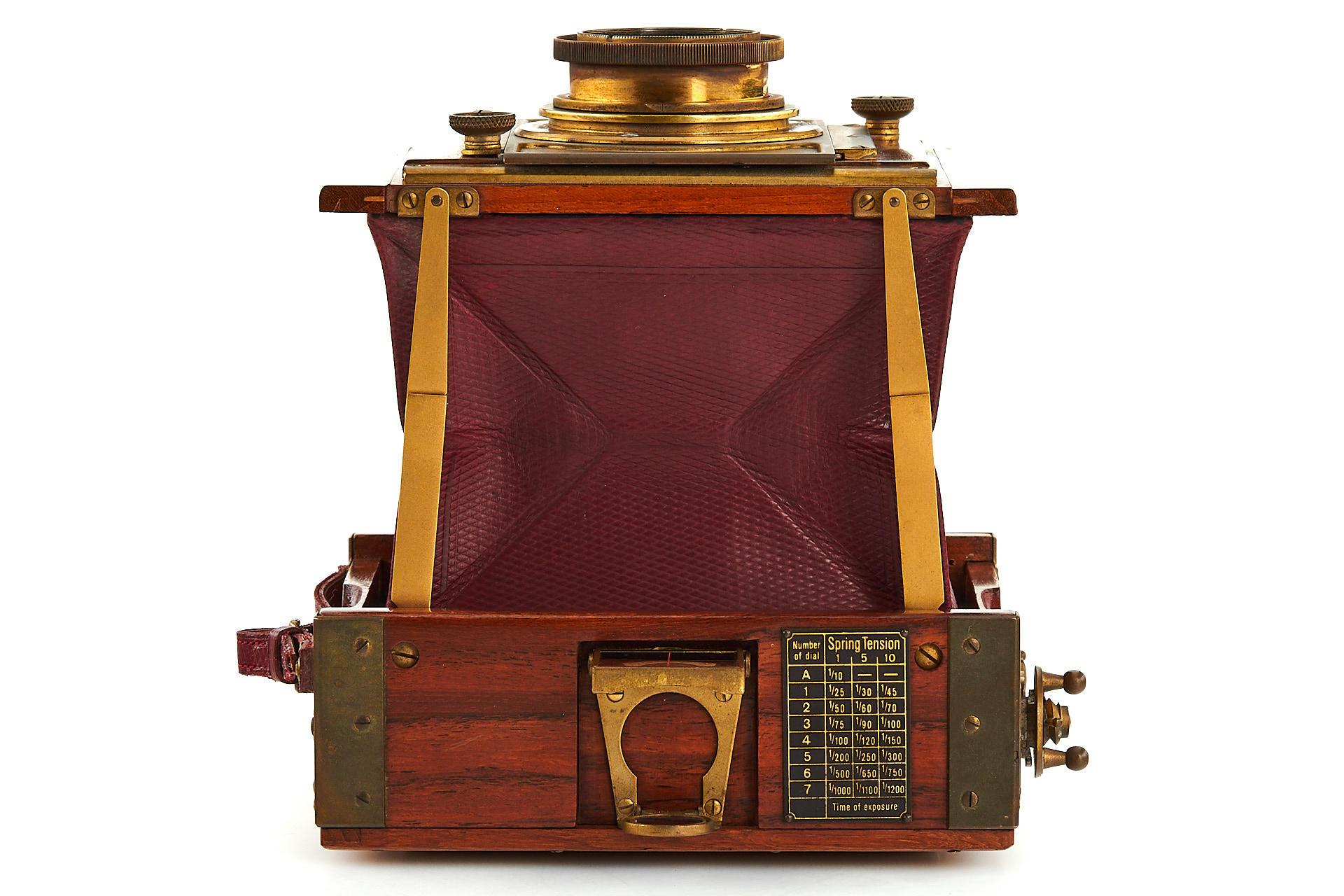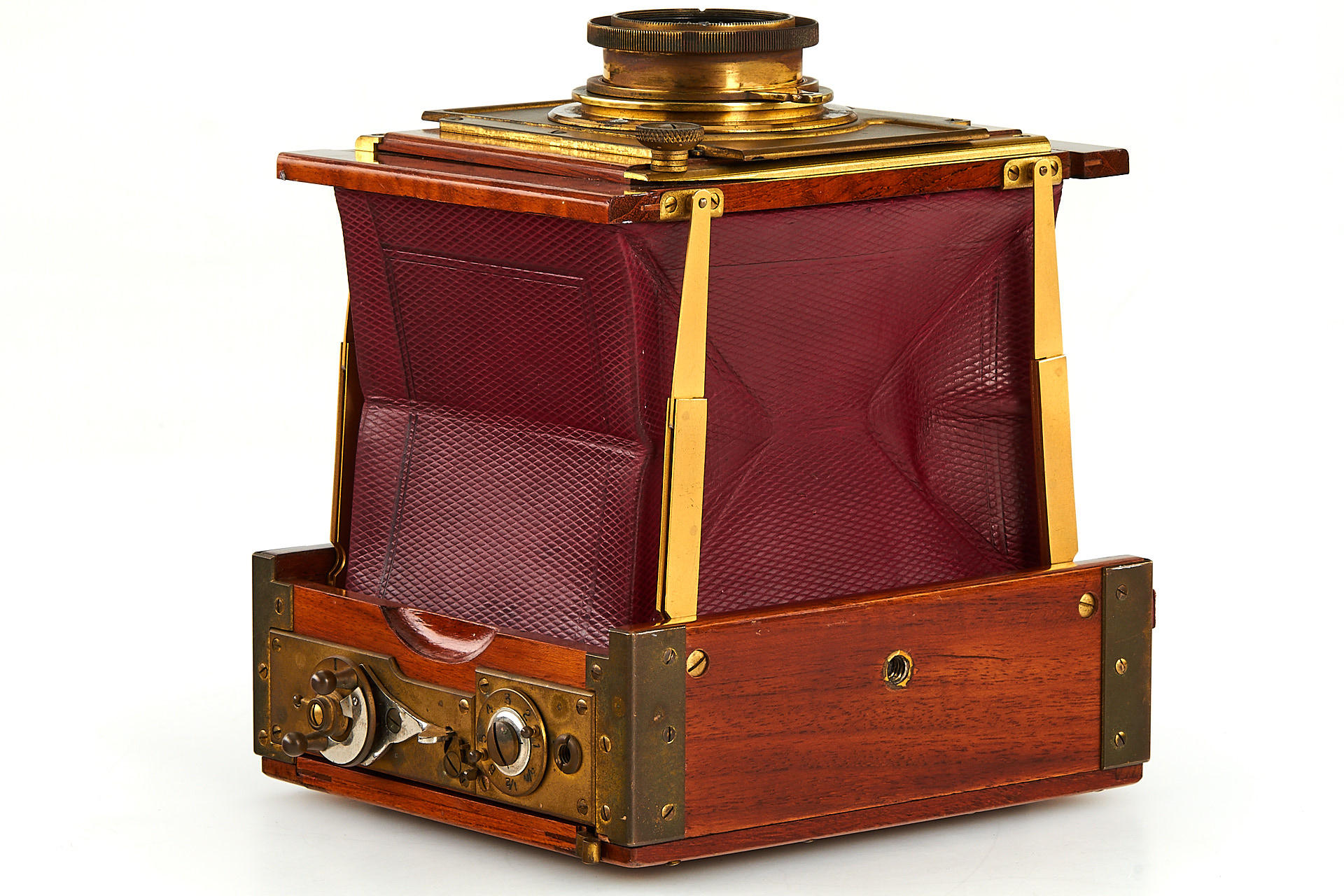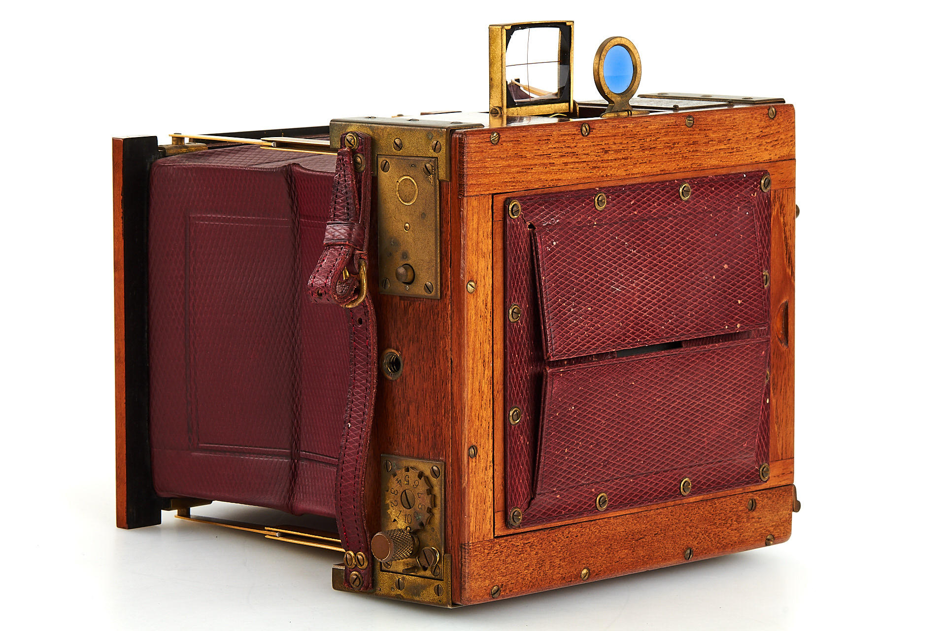 a very attractive tropical camera for 9x12cm exposures on plates, in beautiful, original condition, red bellows and brass fittings, Dogmar 4.5/15cm no.587548