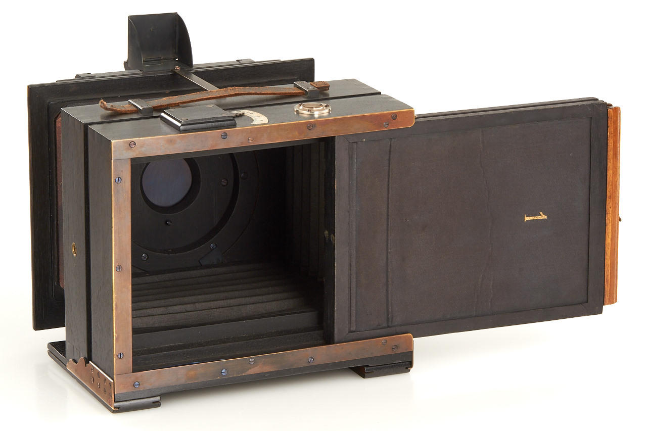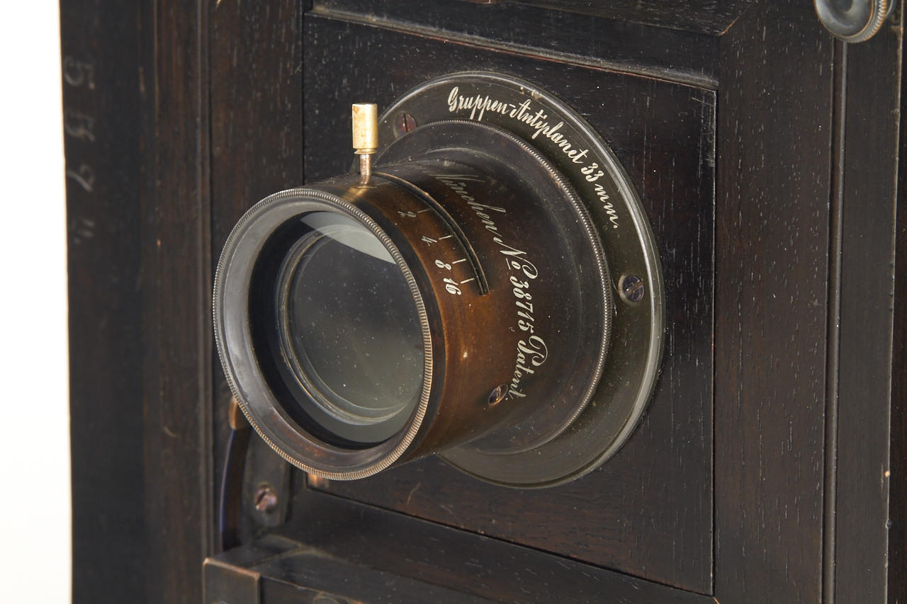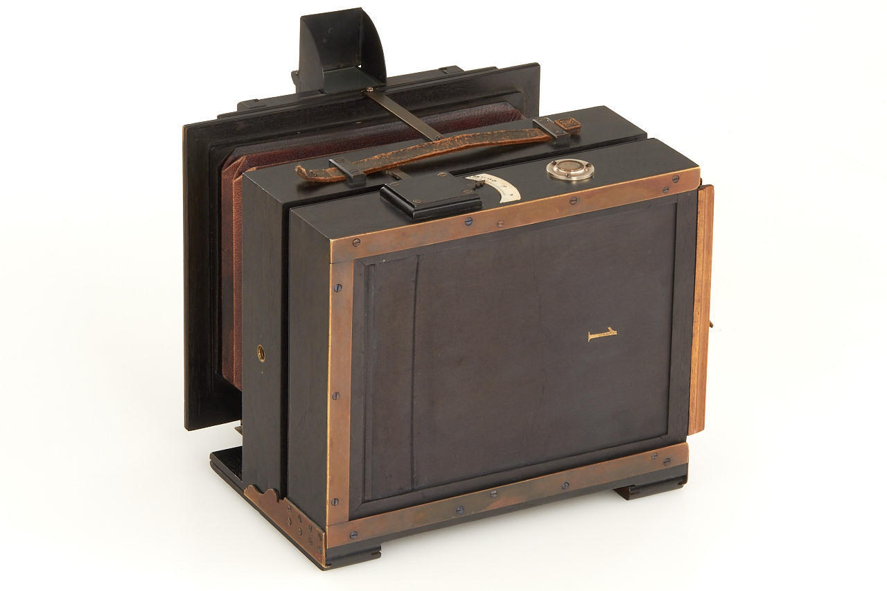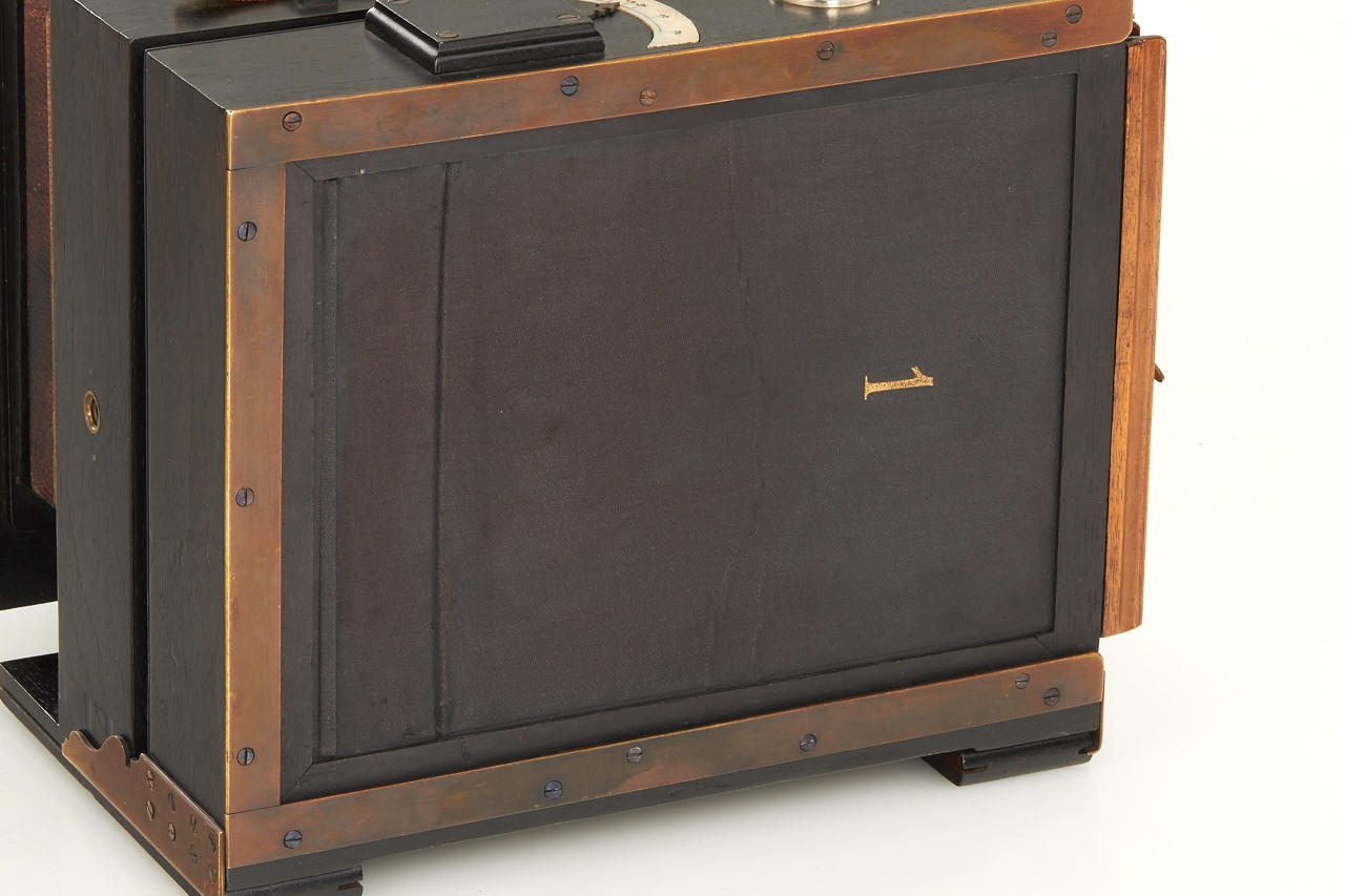 rare, advanced camera for 13x18cm exposures, in exceptional, beautiful condition, ebonized wooden body with complete brass fittings, original bellows, working guillotine shutter, with Steinheil Gruppen Antiplanat no.38715, with wooden double film holder, a similar camera for stereo exposures is available in the section for stereo cameras