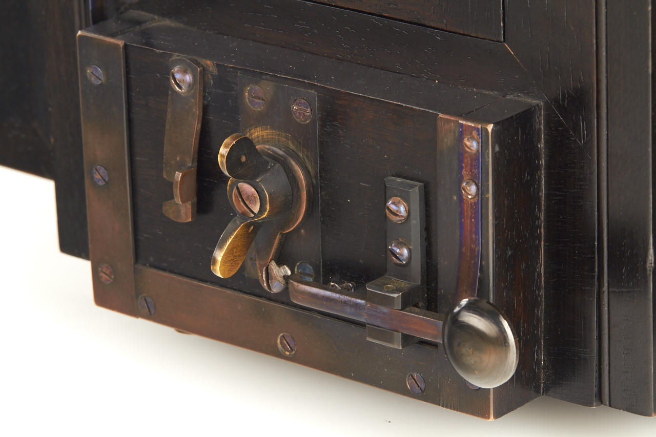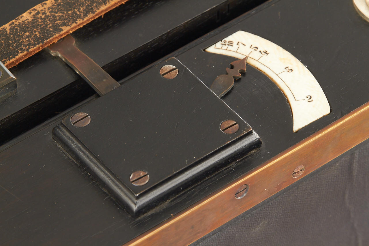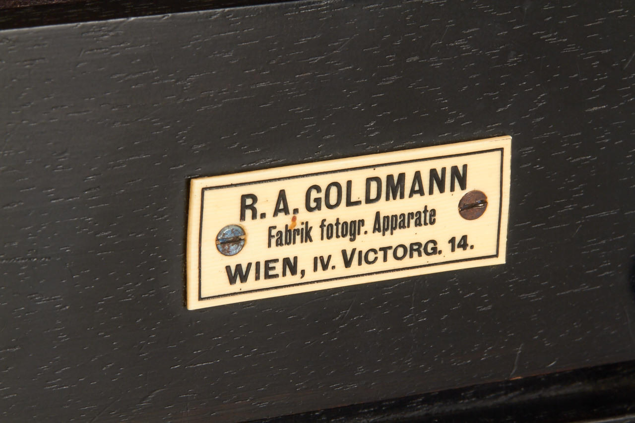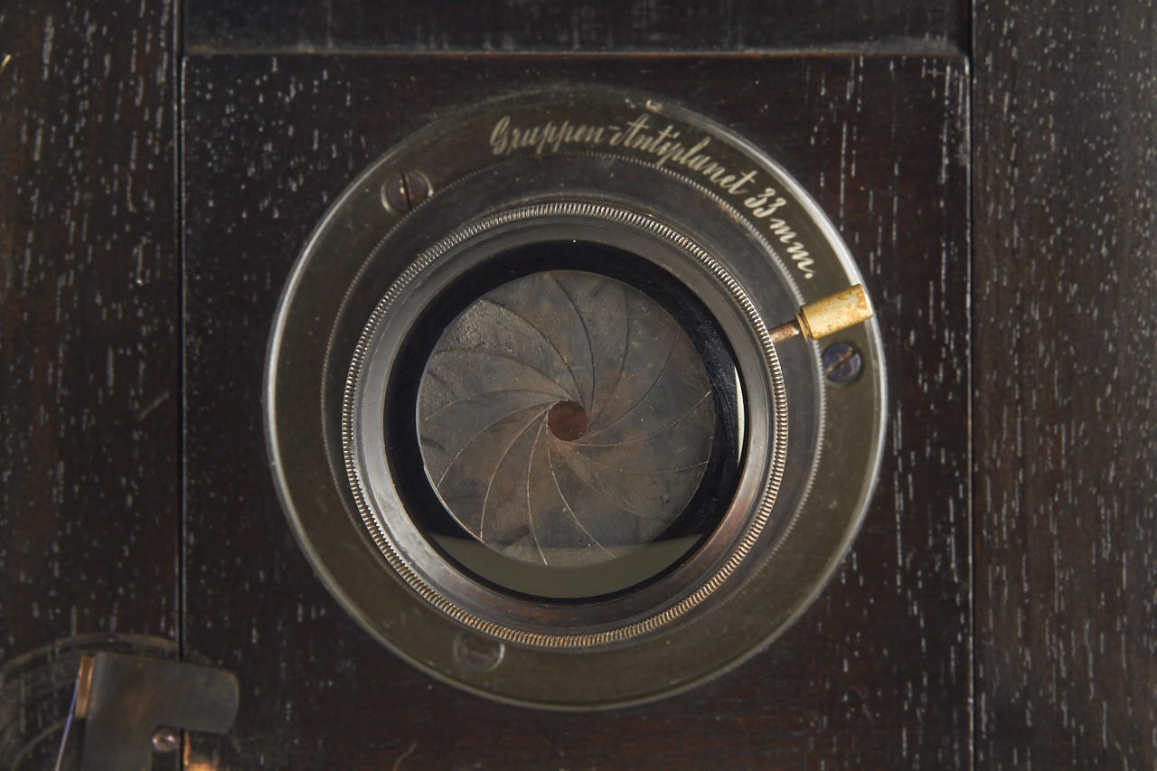 rare, advanced camera for 13x18cm exposures, in exceptional, beautiful condition, ebonized wooden body with complete brass fittings, original bellows, working guillotine shutter, with Steinheil Gruppen Antiplanat no.38715, with wooden double film holder, a similar camera for stereo exposures is available in the section for stereo cameras